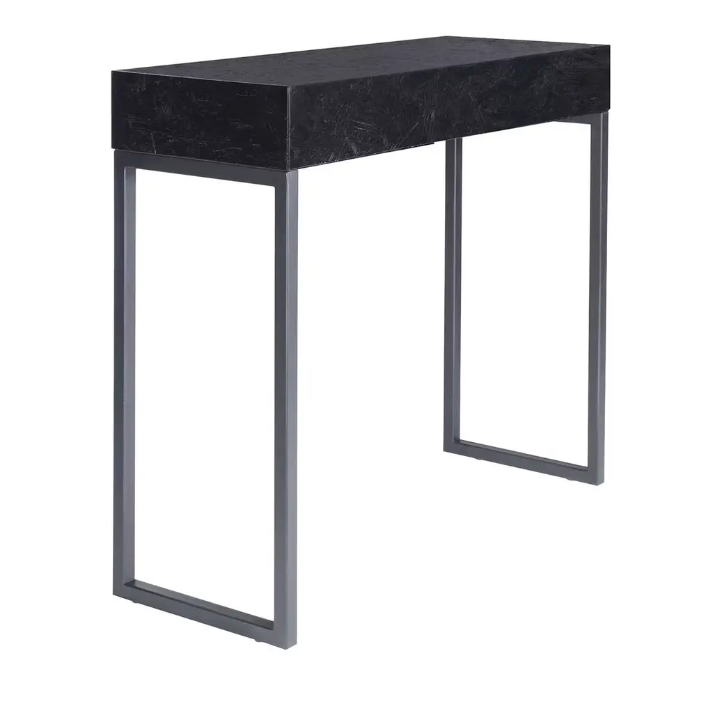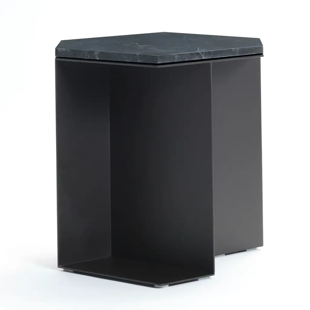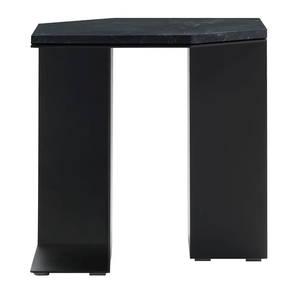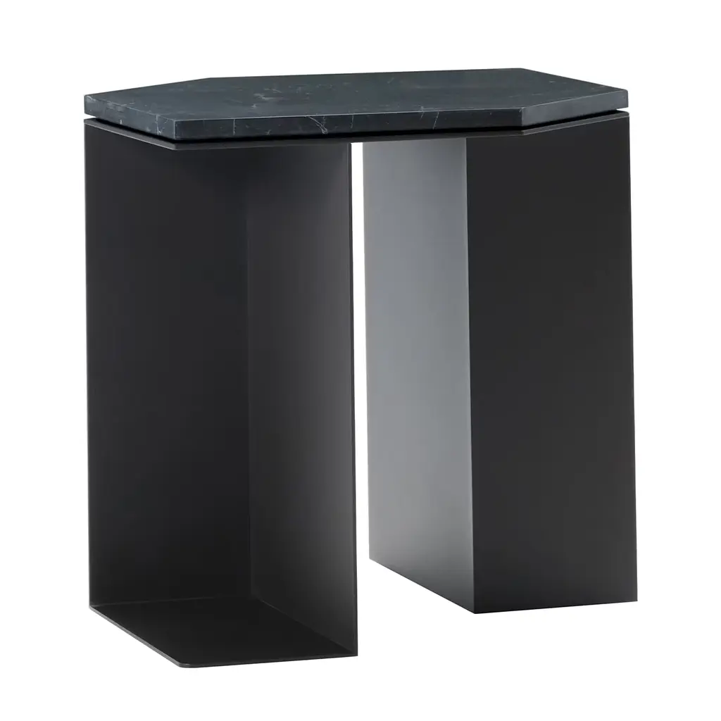 An elongated hexagonal top in prized glossy black Marquinia marble lends opulence to this sculptural coffee table fashioned of metal sheets. Defined by clean lines that further enhance the impact of its solids and voids - with the resulting creation of storage spaces - the silhouette is entirely assembled and welded by hand using embossed coarse matte black (RAL 9017) metal sheets.