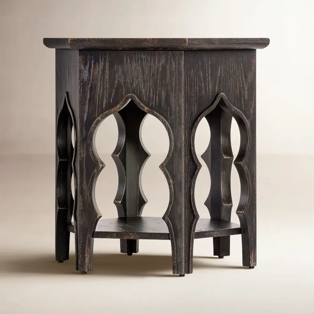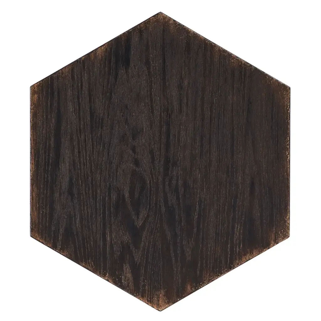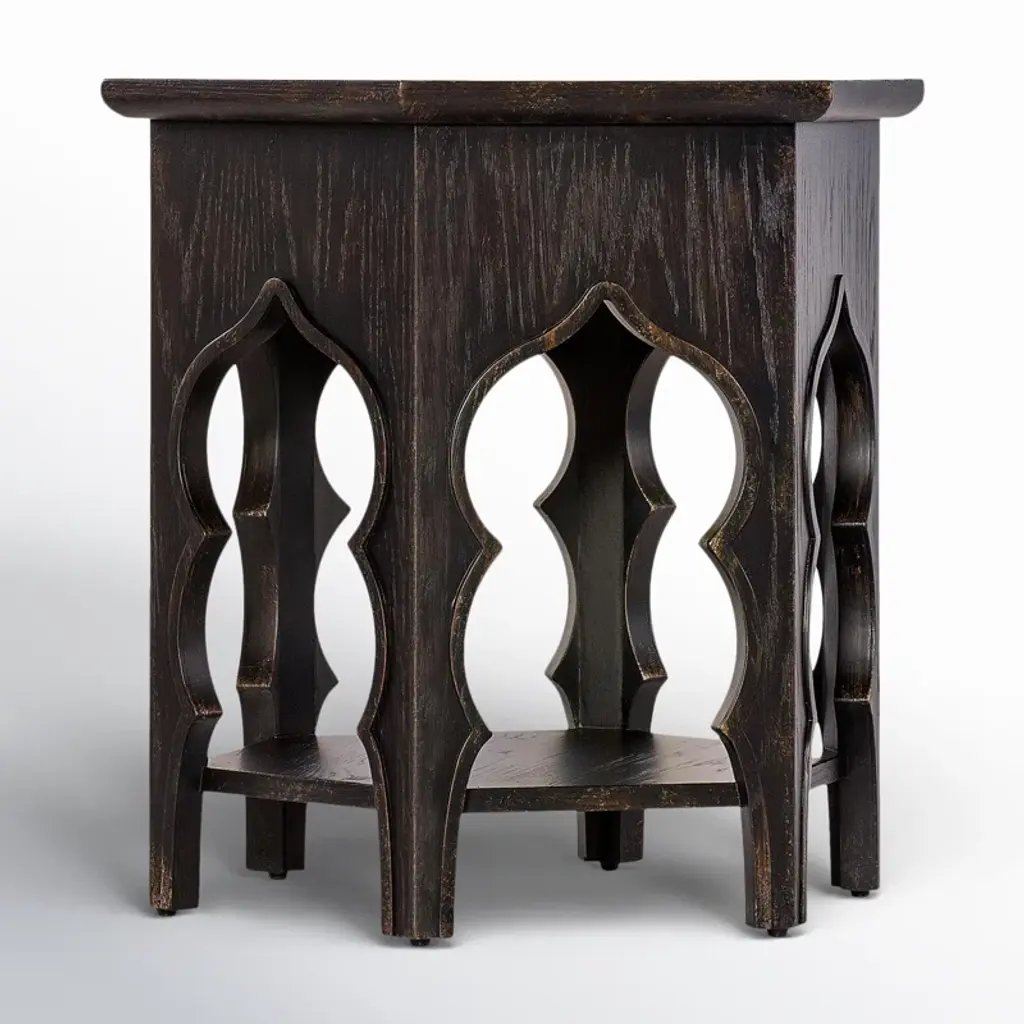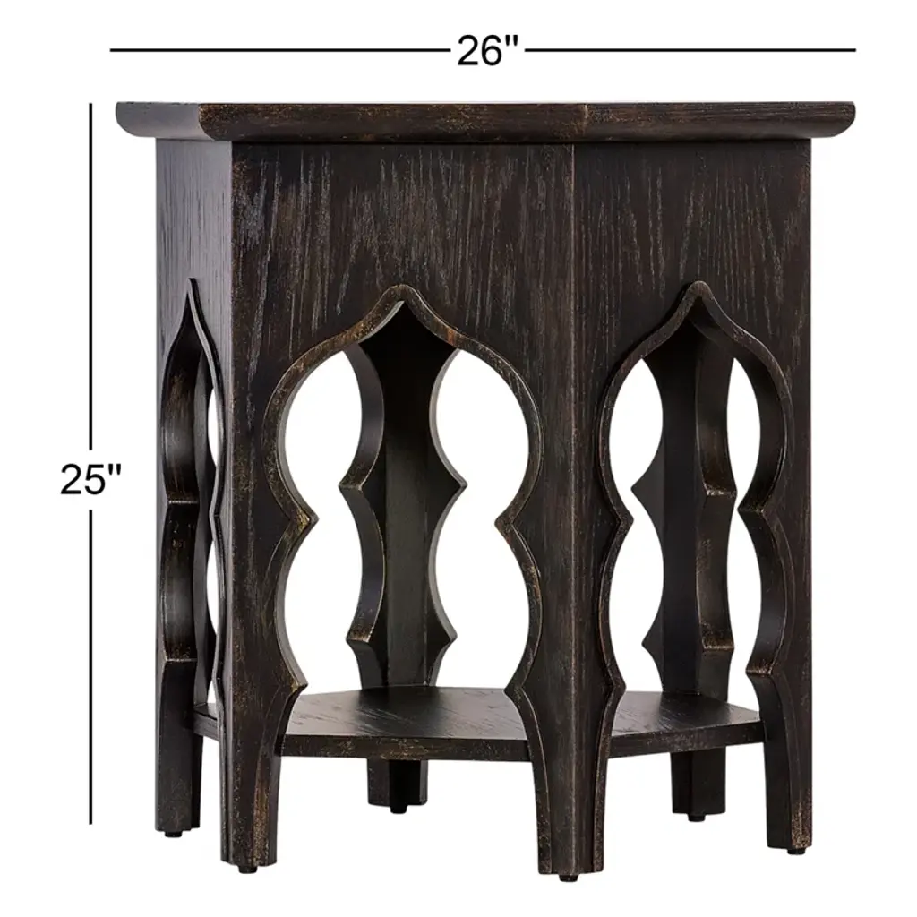 A hexagon shape and carved scalloped legs with arched motifs around the circumference of the American end table exude the genteel spirit of a simpler time. Crafted of oak veneers, it is finished in molasses, capturing the essence of a well-loved heirloom in a deep dark tone - one fixed shelf.