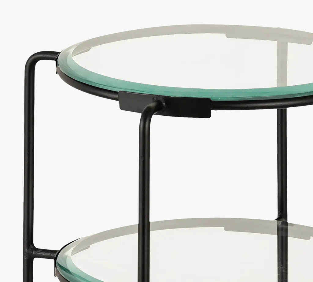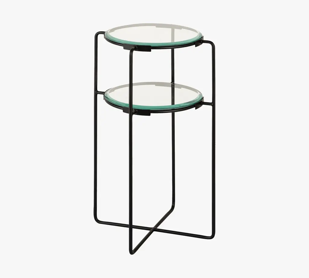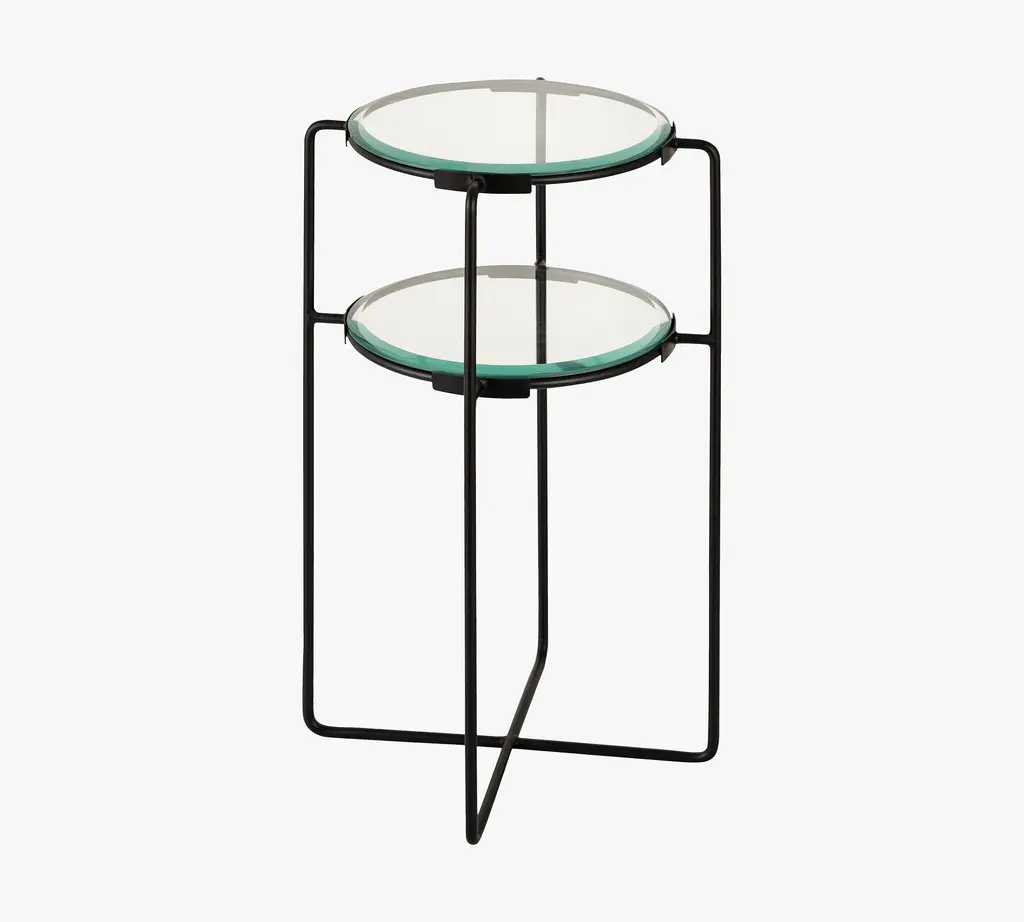 A spare, geometric look lends our accent table modern style. The forged-iron frame forms an airy outline of intersecting rectangles fit with a two-tier glass tabletop and shelf. Ideal for small spaces, its transparent, open design offers extra surface area for a lamp or accessories without dominating the decor.