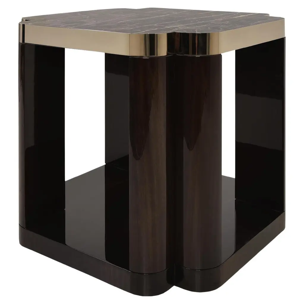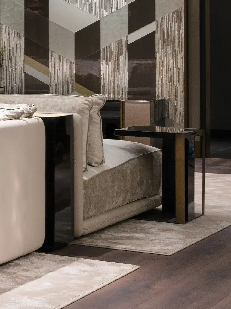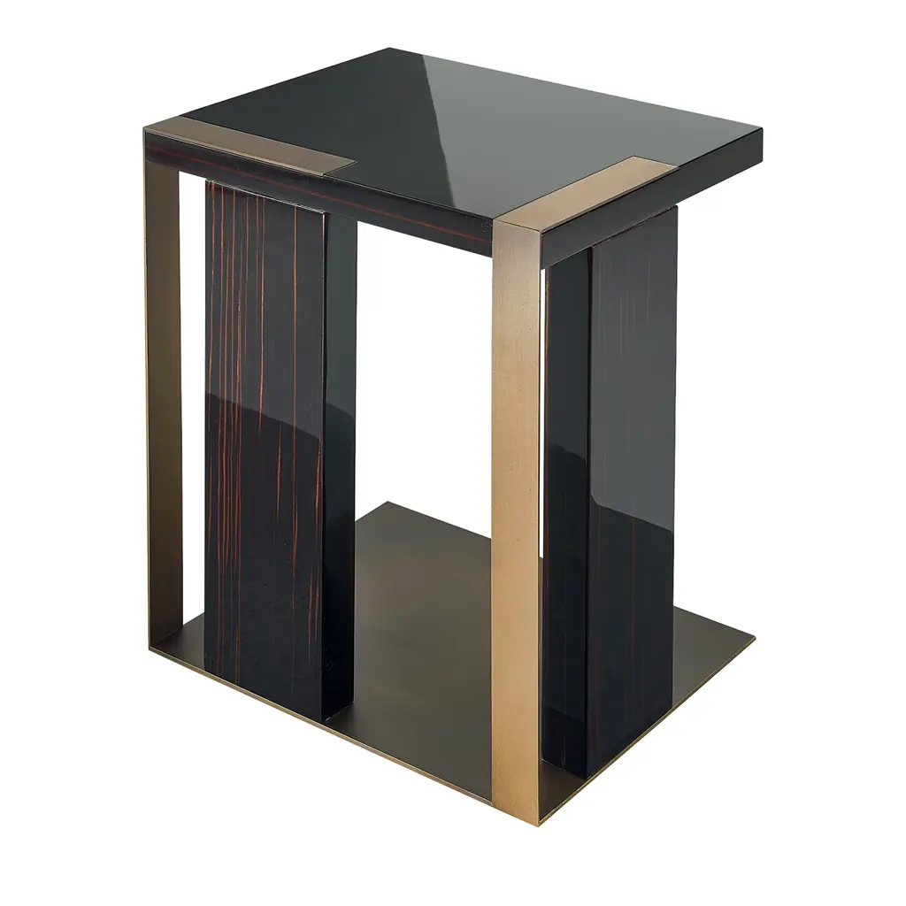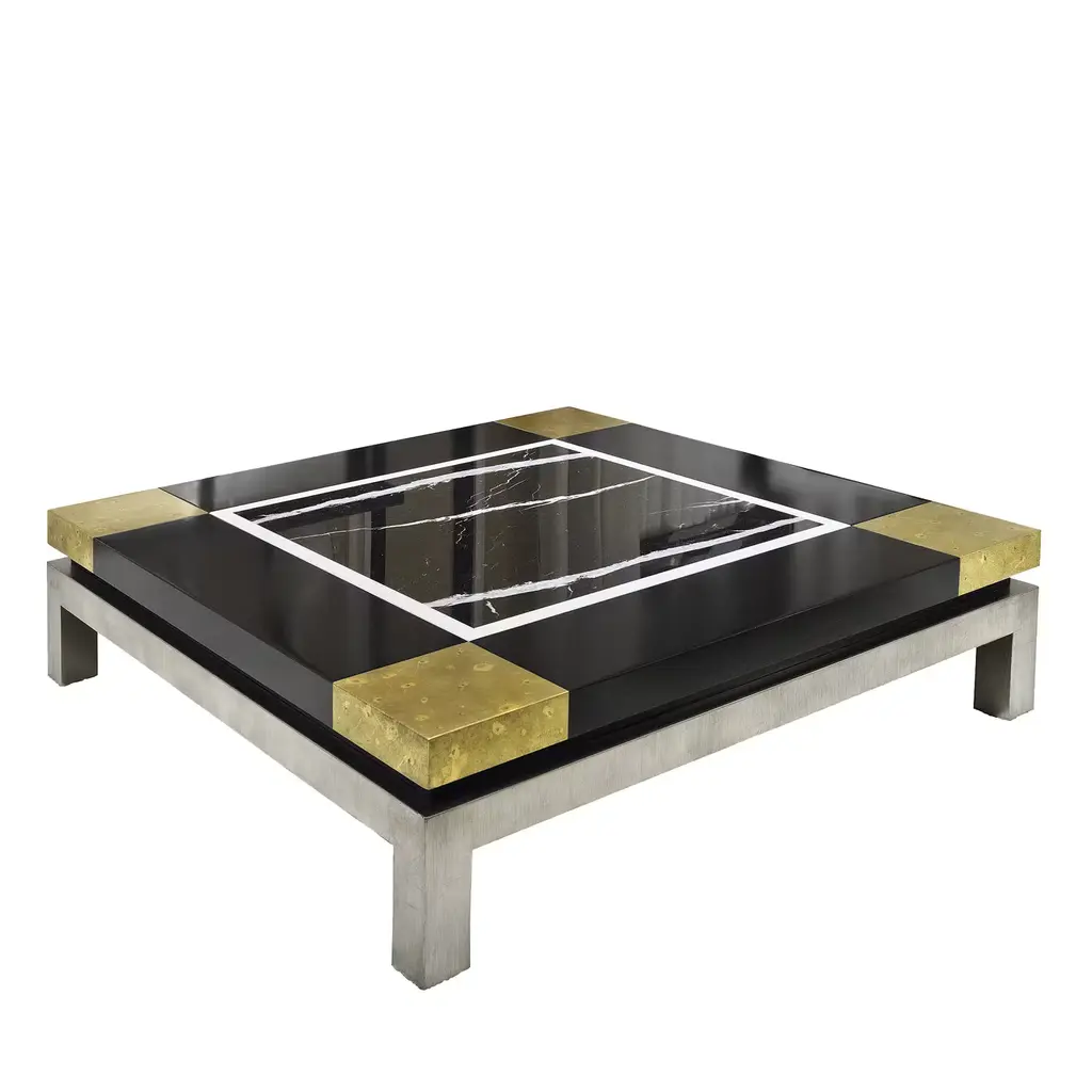 Alec is a coffee table with structure with lacquered ebony finishing. Inserts in liquid metal.