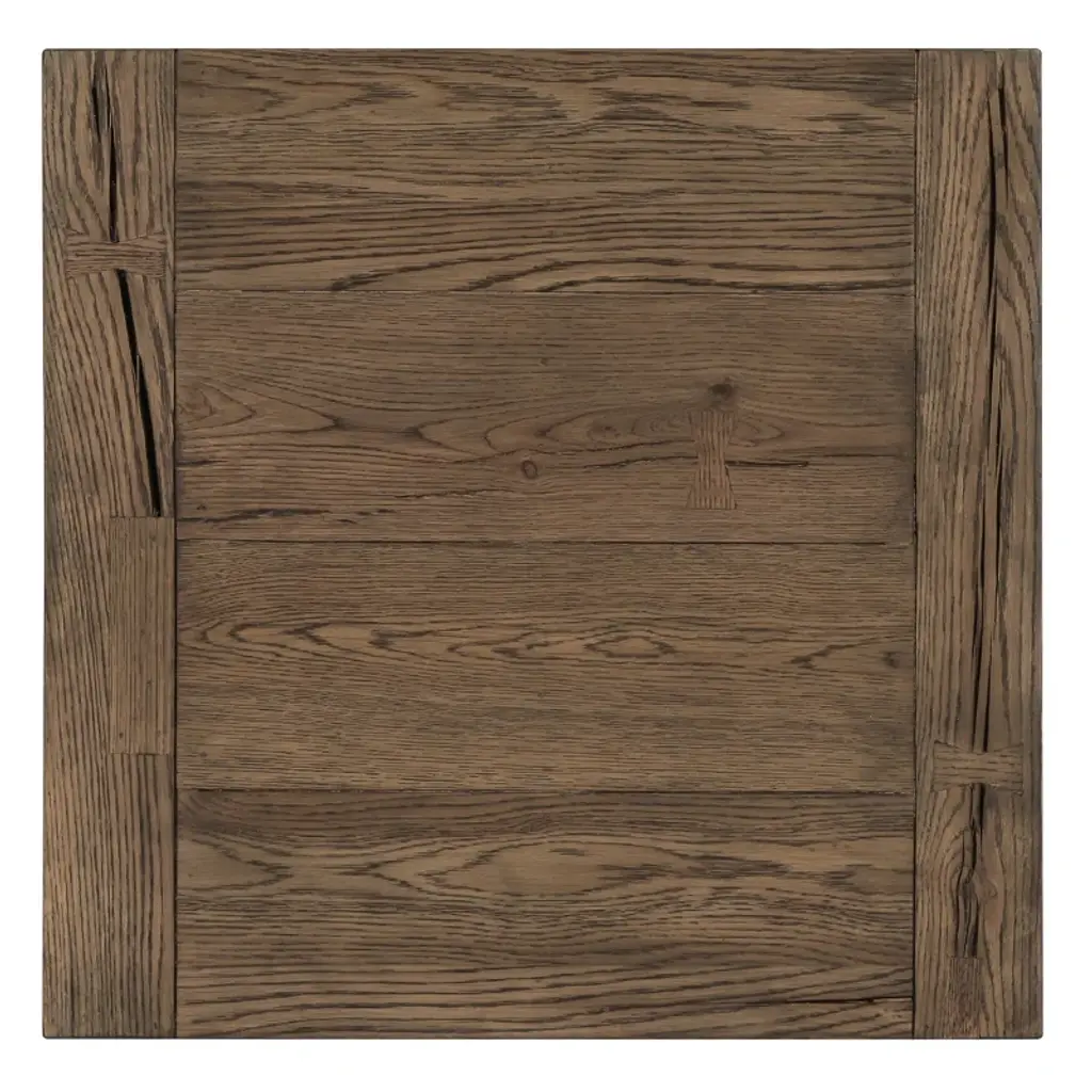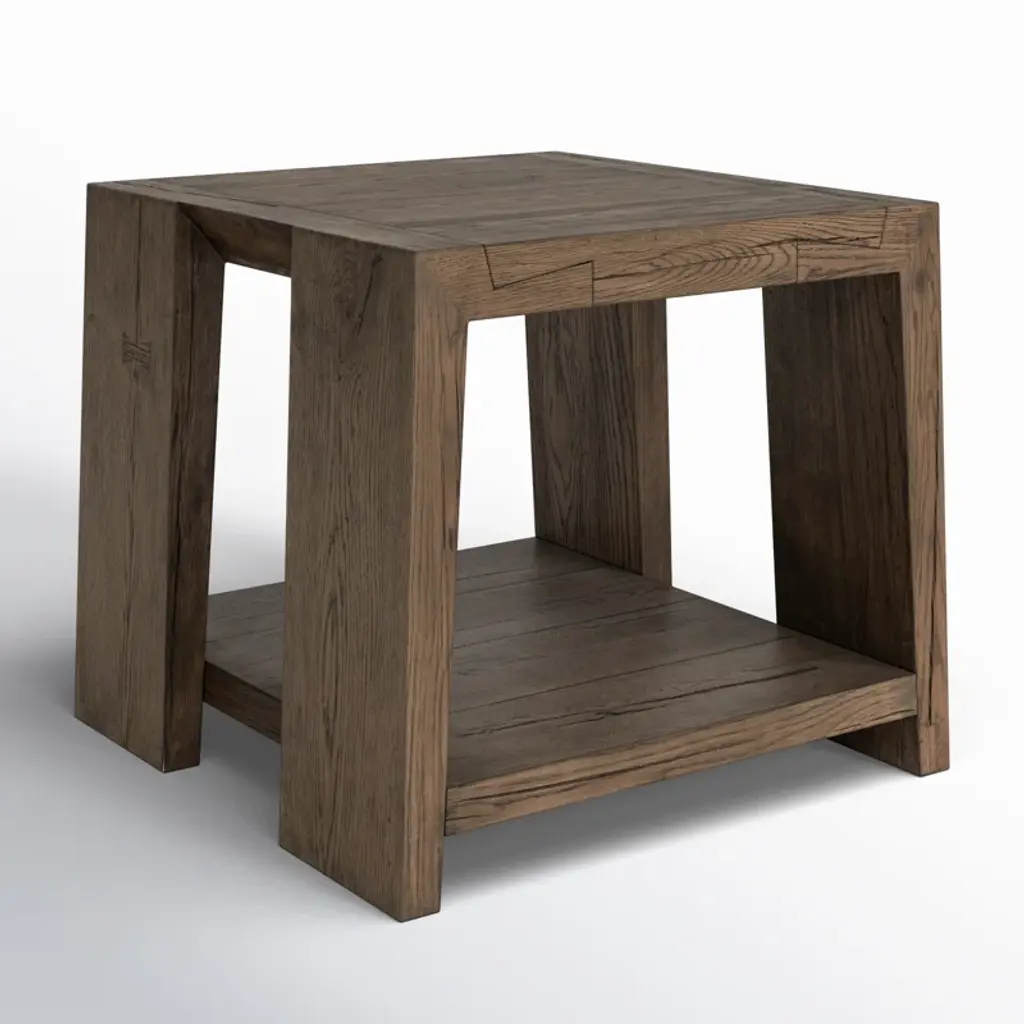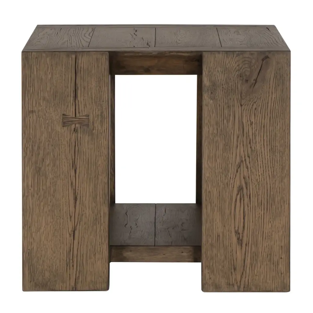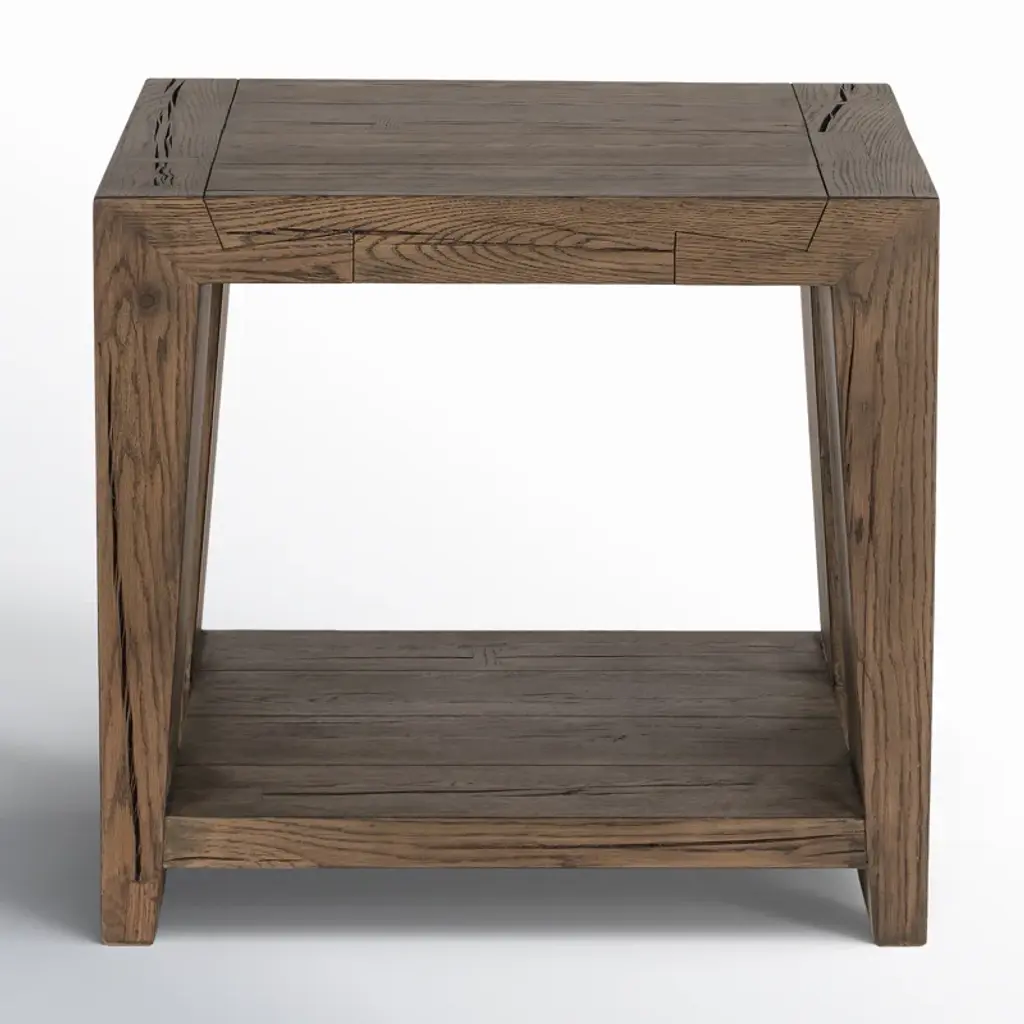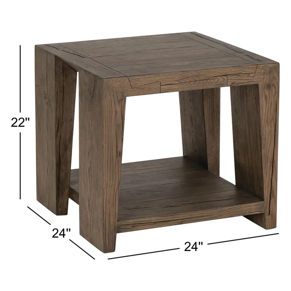 Oversized dovetails and tapered legs give nuance to this otherwise simple end table, making it ideal for a variety of styles. A soft tan finish enhances the dynamic grain pattern of the cracked oak. A lower shelf adds display space to the piece.