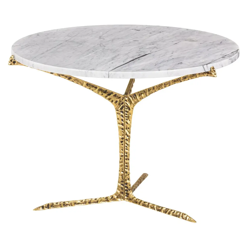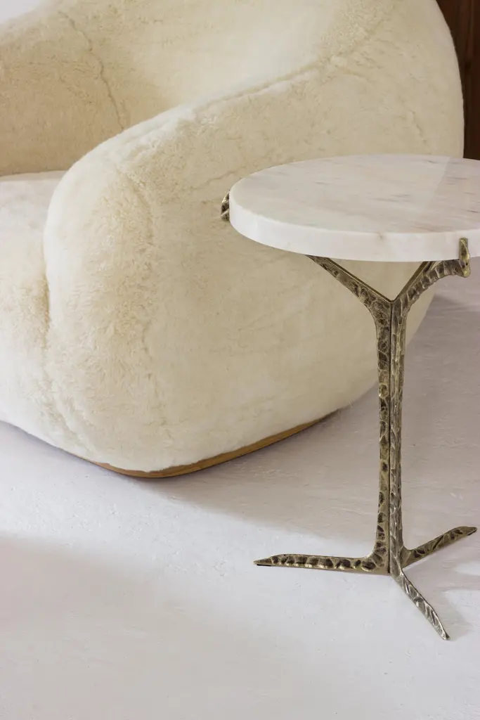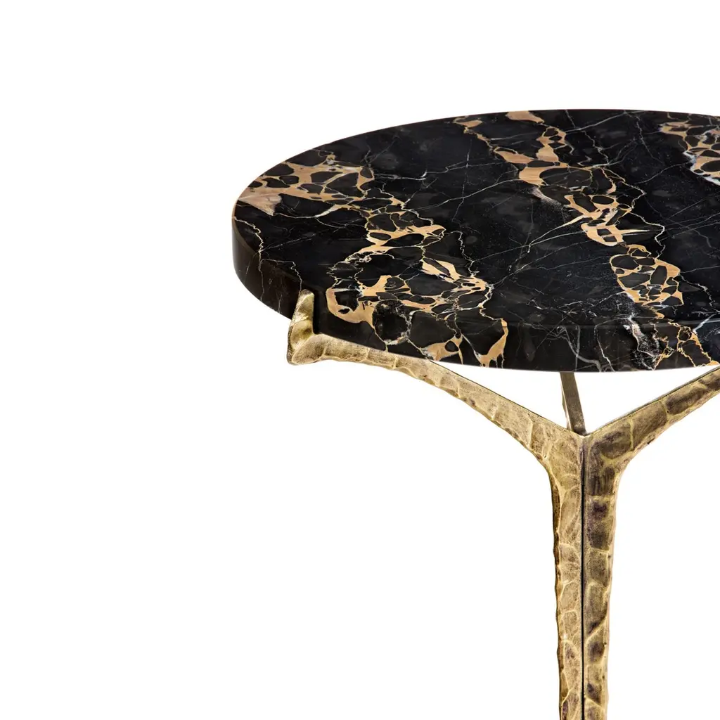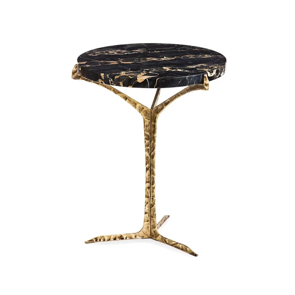 Alentejo side table is a glimpse over the South of Portugal where thousands of cork oaks trees raise their canopies to the sky.Resembling the typical trees that spread across the horizon with their canopies gracefully balanced above the ground, this nature inspired design is based in the beautiful natural forms. The structure in cast brass with patinated effect results of a careful sculpted work that highlights the natural details.Product detailsTop: Portoro Namibia marbleBase: Feet in cast brass with patinated effect finished in matte varnish.Product options:Top: Other marbles, wood veneers, acrylic or lacquered in any Ral Classic color finished in matte, half gloss or high gloss varnish.Base: Feet in cast brass covered by copper or nickel bath with patinated effect finished in matte, half or high gloss varnish.Weight: 15Kg 33,1 lbsMade to order. Custom sizes and other finishes are available under request.Designed by Joana Santos Barbosa for InsidherLand, 2015. Handmade in Portugal.