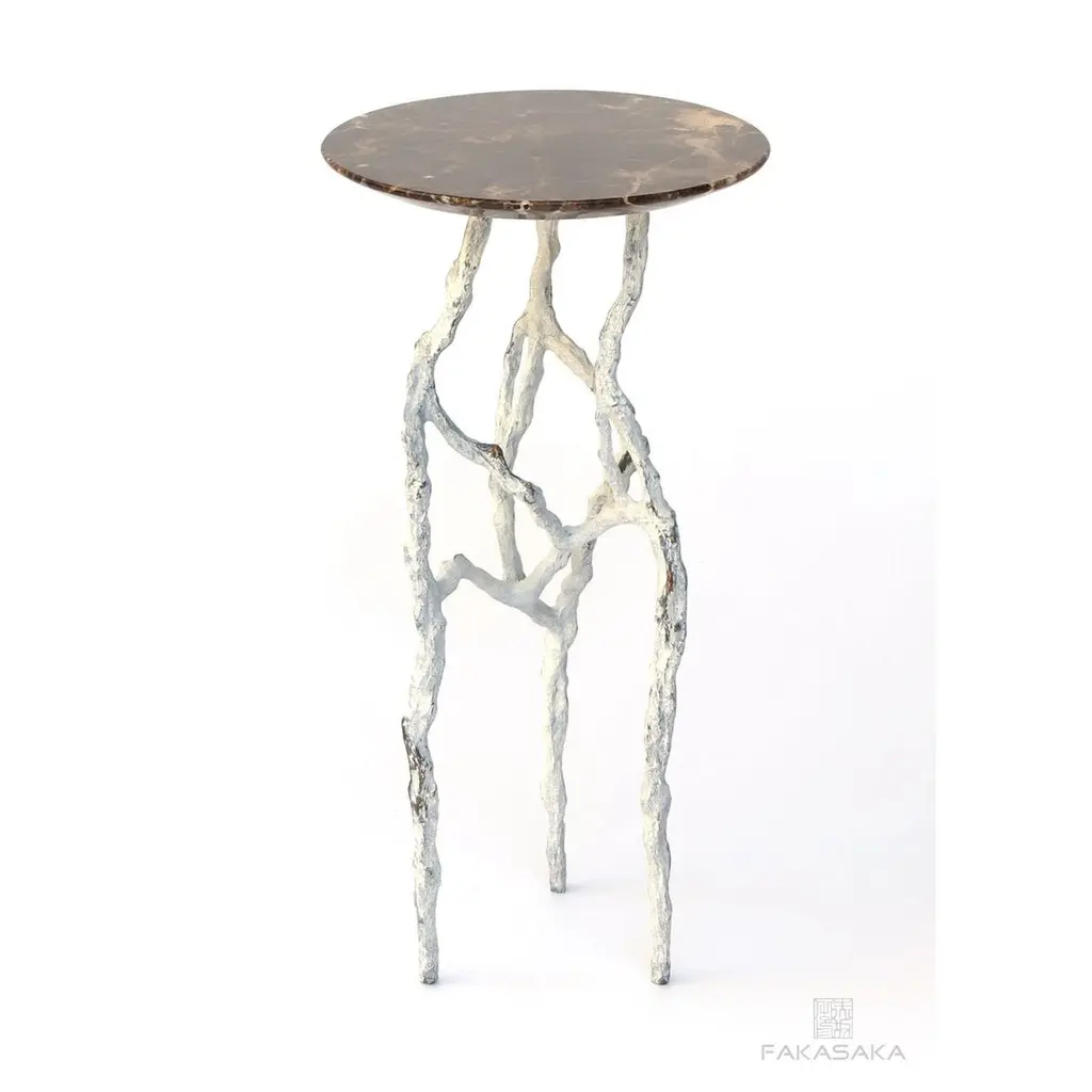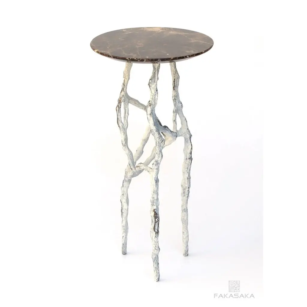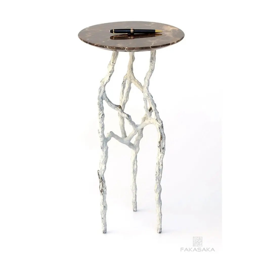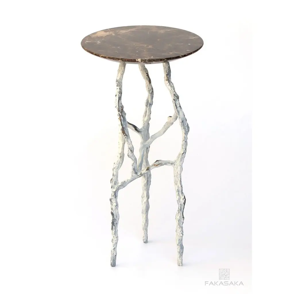 Alexia 3 drink table with Marrom Imperial Marble top by Fakasaka DesignDimensions: W 30 cm, D 30 cm, H 60 cm.Materials: off white bronze base, Marrom Imperial marble top. Also available in different table top materials:Nero Marquina Marble Marrom Imperial MarblePedra AgateTranslucent Onyx FAKASAKA is a design company focused on production of high-end furniture, lighting, decorative objects, jewels, and accessories. Established in 2007, Fakasaka is the eponymous design company by Brazilian artist Fernando Akasaka distinguished by a penchant for producing intricate detailed cast bronze collectible design objects, furniture and jewelries. Fakasaka explores the contrast between the manmade and the natural through shapes and finishes that create a clear aesthetic. The constant challenge to balance elements is met with an outcome that is a striking assortment of bronze furniture and objects in oxidised and polished finishes, accented with precious regional stones, granites and rich prehistoric reptilian motifs.