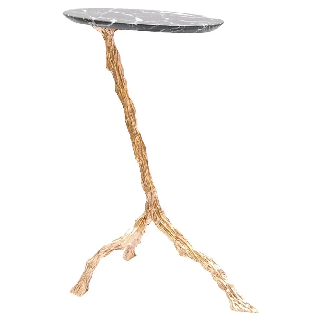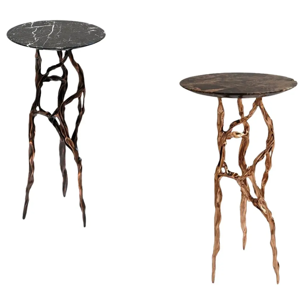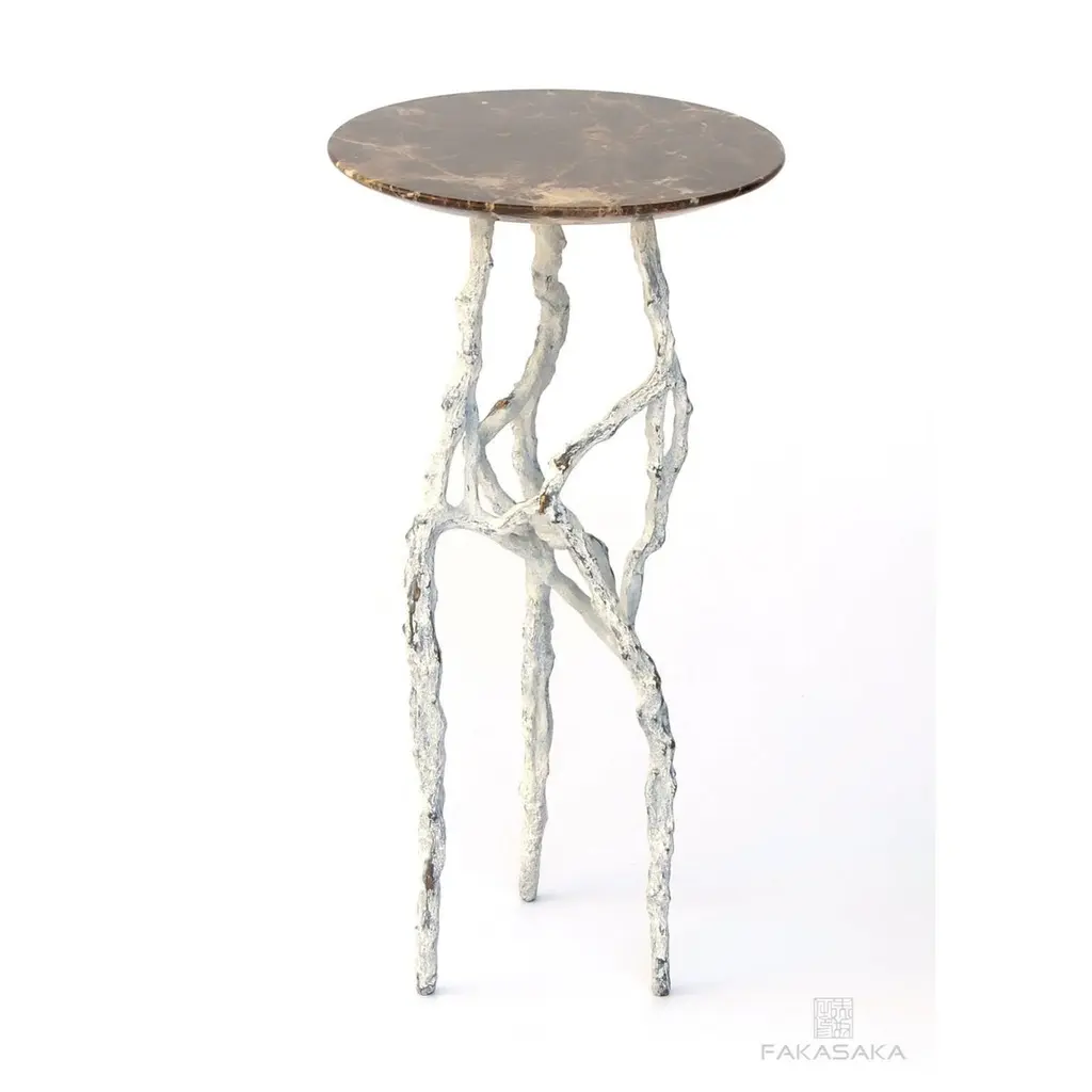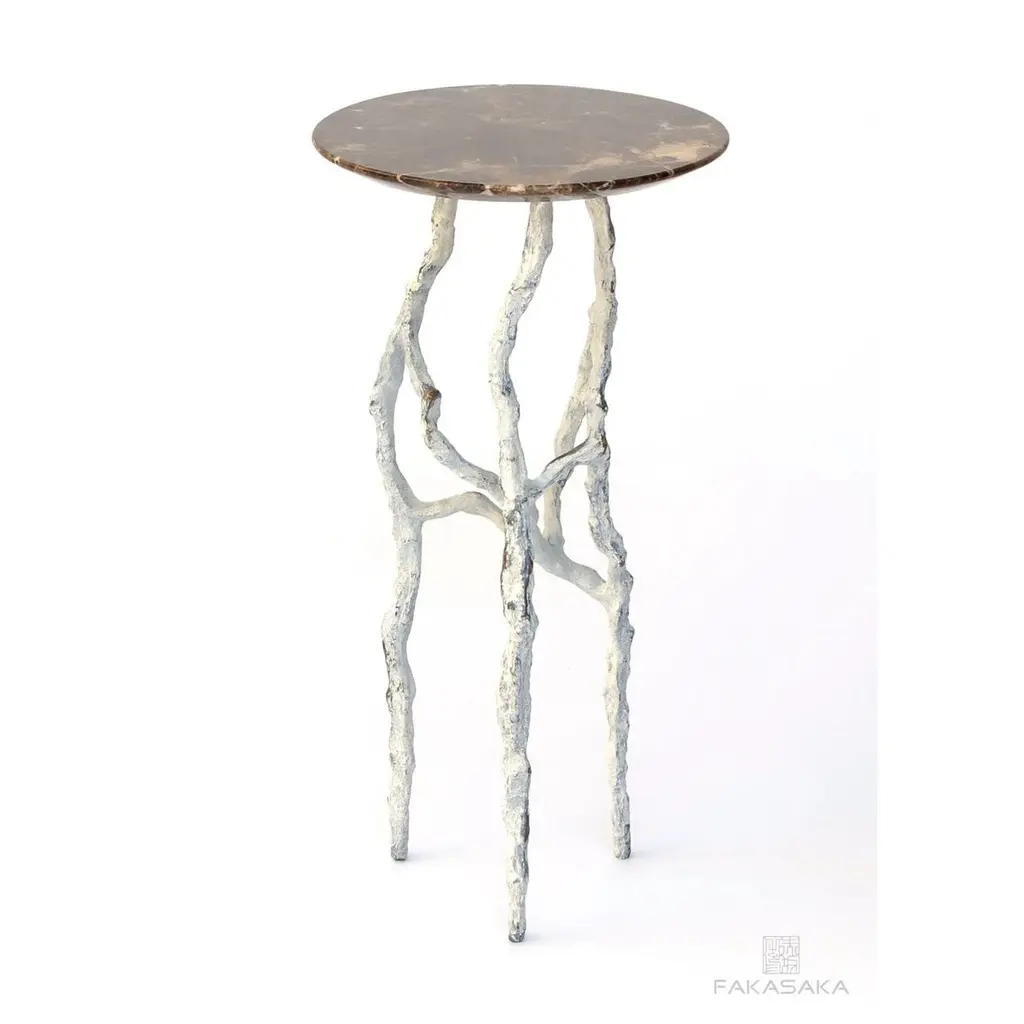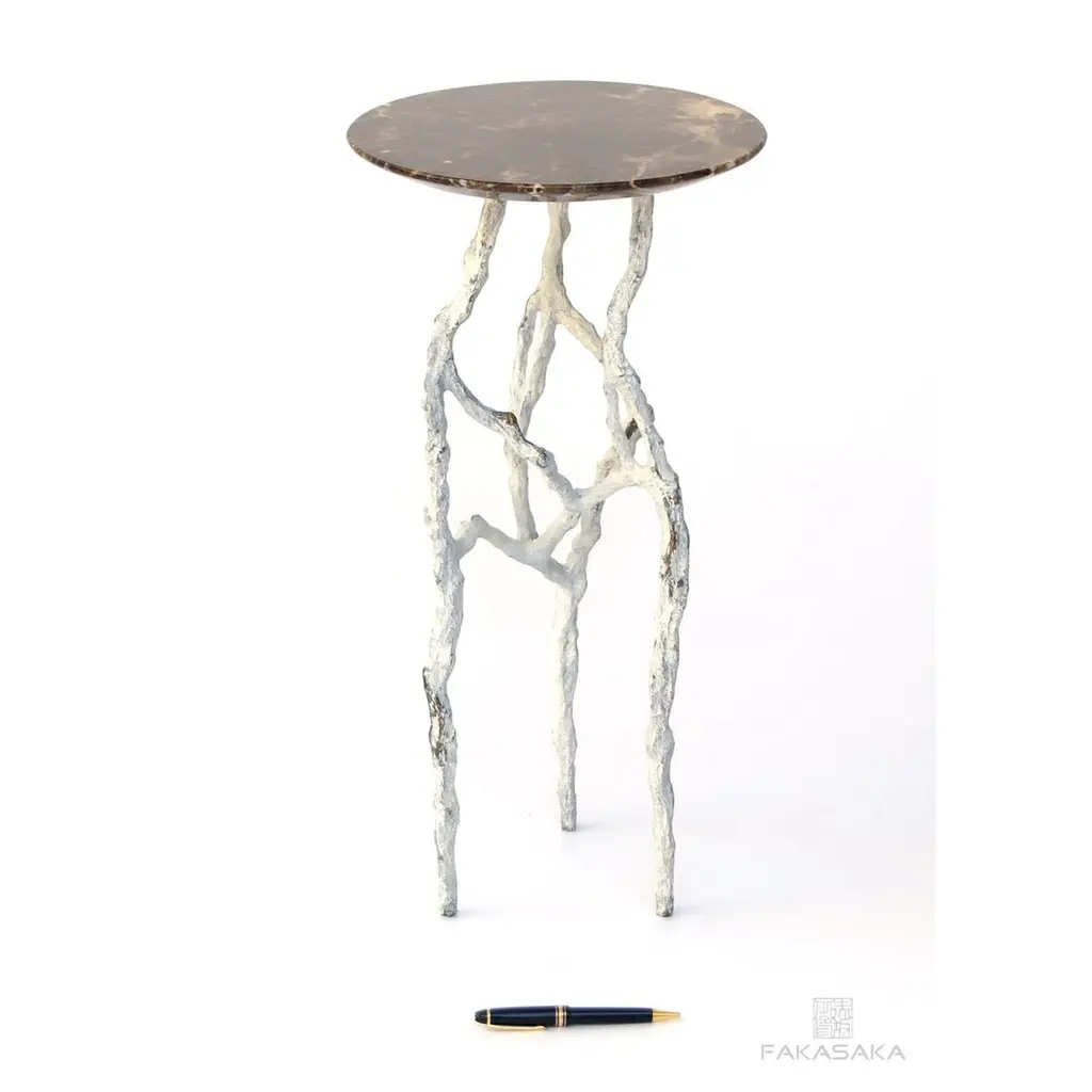 Alexia 3 drink table with Marrom Imperial Marble top by Fakasaka DesignDimensions: W 30 cm, D 30 cm, H 60 cm.Materials: off white bronze base, Marrom Imperial marble top. Also available in different table top materials:Nero Marquina Marble Marrom Imperial MarblePedra AgateTranslucent Onyx FAKASAKA is a design company focused on production of high-end furniture, lighting, decorative objects, jewels, and accessories. Established in 2007, Fakasaka is the eponymous design company by Brazilian artist Fernando Akasaka distinguished by a penchant for producing intricate detailed cast bronze collectible design objects, furniture and jewelries. Fakasaka explores the contrast between the manmade and the natural through shapes and finishes that create a clear aesthetic. The constant challenge to balance elements is met with an outcome that is a striking assortment of bronze furniture and objects in oxidised and polished finishes, accented with precious regional stones, granites and rich prehistoric reptilian motifs.