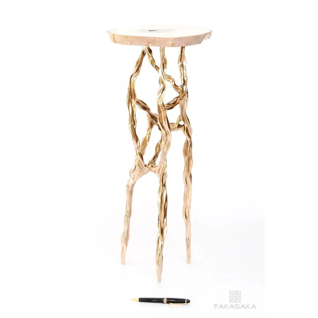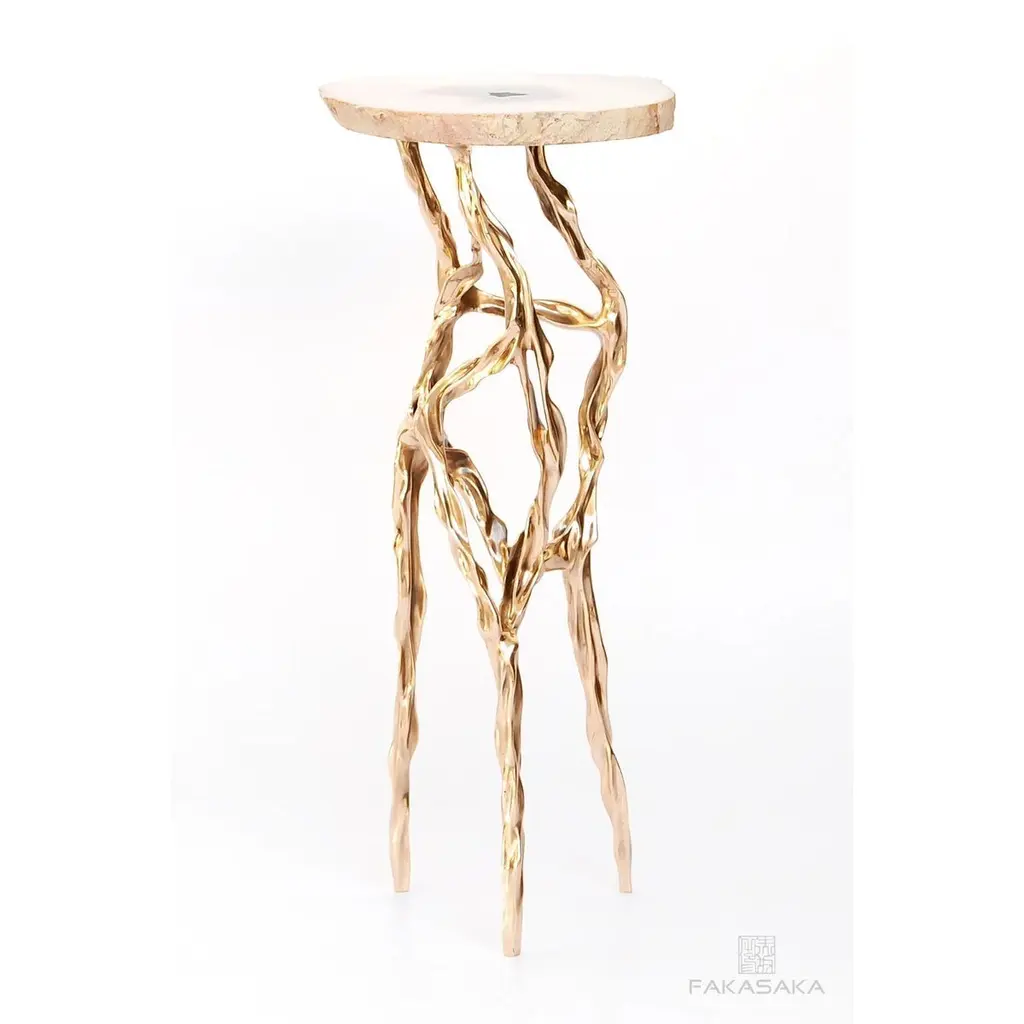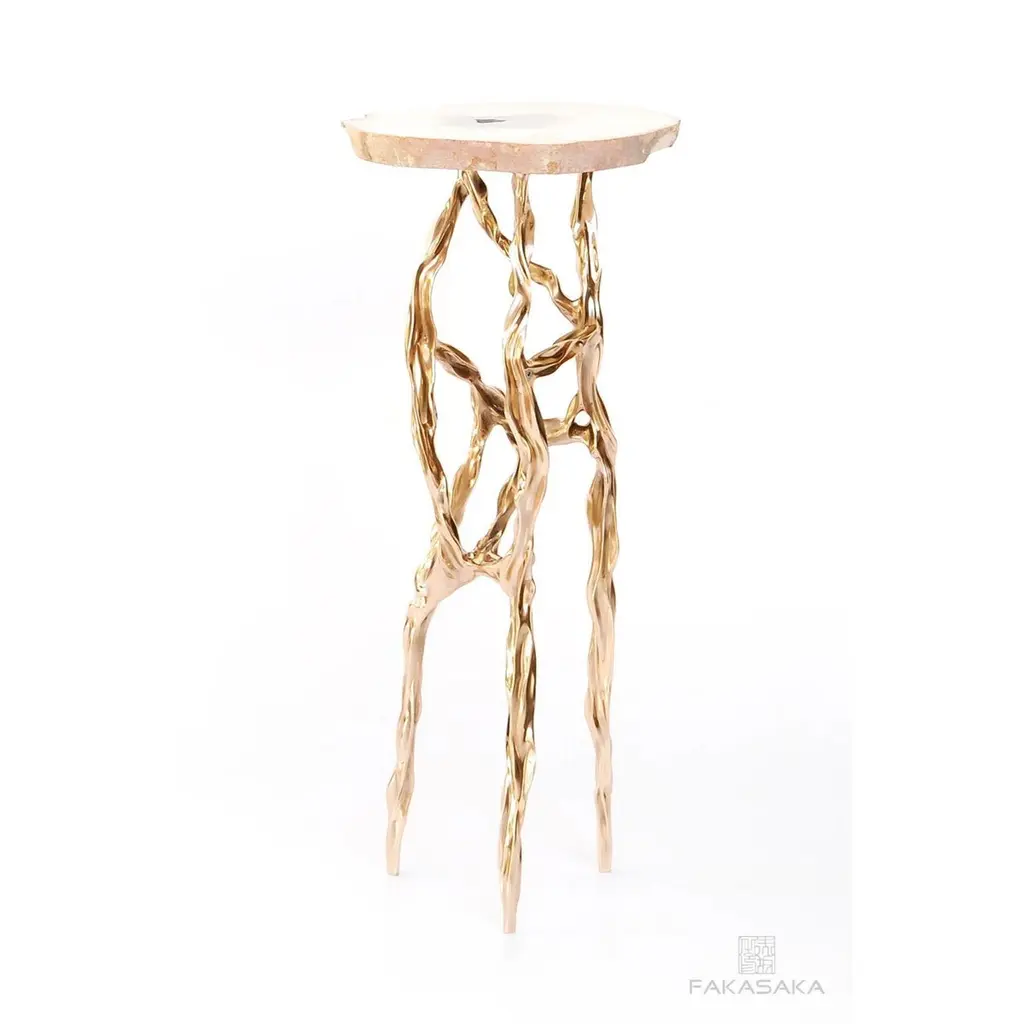 Alexia drink table with Agate top by Fakasaka DesignDimensions: W 27 cm, D 29 cm, H 62 cm.Materials: polished bronze base, Onyx top. Also available in different table top materials (Nero Marquina Marble, Marrom Imperial Marble and Translucent Onyx) and in dark or polished bronze base. FAKASAKA is a design company focused on production of high-end furniture, lighting, decorative objects, jewels, and accessories. Established in 2007, Fakasaka is the eponymous design company by Brazilian artist Fernando Akasaka distinguished by a penchant for producing intricate detailed cast bronze collectible design objects, furniture and jewelries. Fakasaka explores the contrast between the manmade and the natural through shapes and finishes that create a clear aesthetic. The constant challenge to balance elements is met with an outcome that is a striking assortment of bronze furniture and objects in oxidised and polished finishes, accented with precious regional stones, granites and rich prehistoric reptilian motifs.