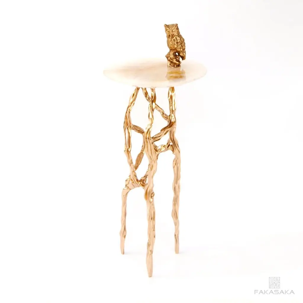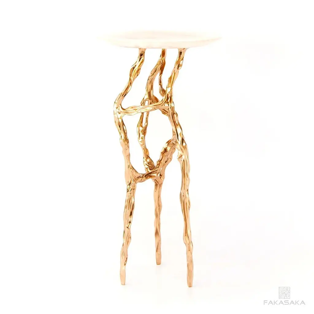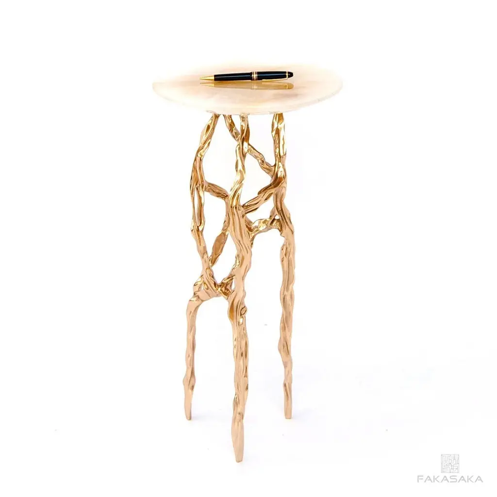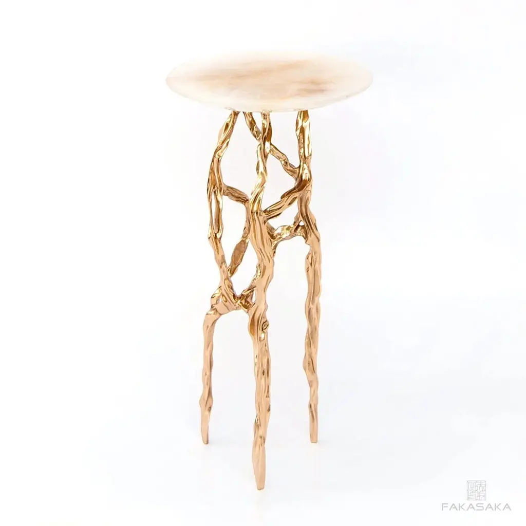 Alexia drink table with Onyx top by Fakasaka Design.Dimensions: W 30 cm, D 30 cm, H 62 cm.Materials: polished bronze base, Onyx top. Also available in different table top materials (Nero Marquina Marble, Marrom Imperial Marble and Translucent Onyx) and in dark or polished bronze base. FAKASAKA is a design company focused on production of high-end furniture, lighting, decorative objects, jewels, and accessories. Established in 2007, Fakasaka is the eponymous design company by Brazilian artist Fernando Akasaka distinguished by a penchant for producing intricate detailed cast bronze collectible design objects, furniture and jewelries. Fakasaka explores the contrast between the manmade and the natural through shapes and finishes that create a clear aesthetic. The constant challenge to balance elements is met with an outcome that is a striking assortment of bronze furniture and objects in oxidised and polished finishes, accented with precious regional stones, granites and rich prehistoric reptilian motifs.