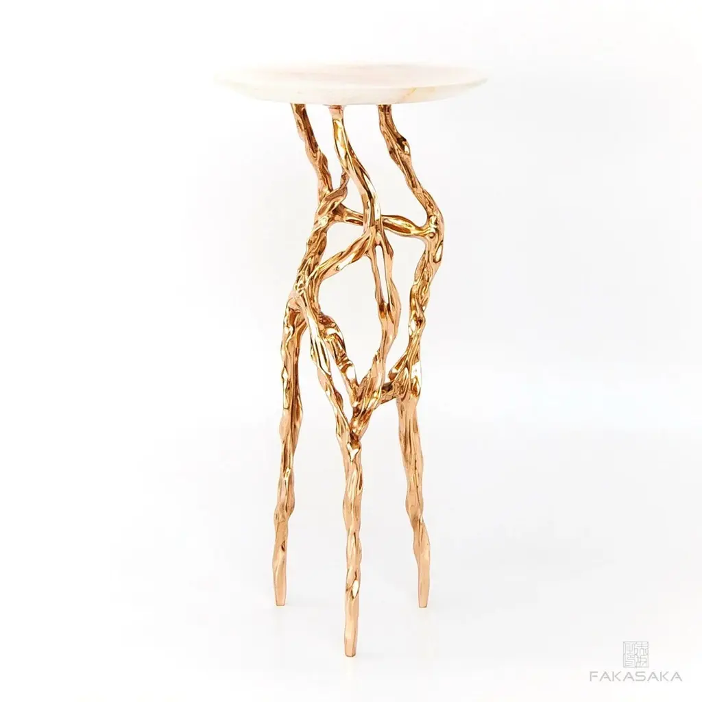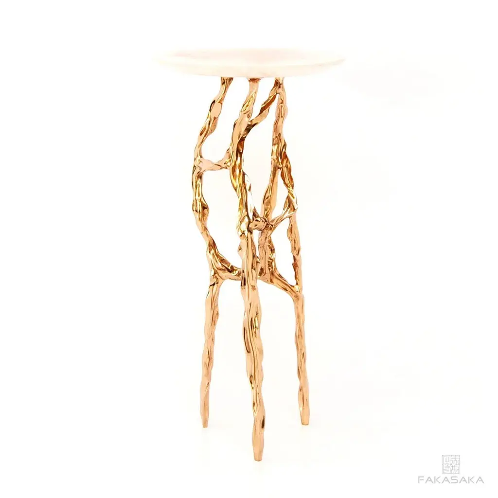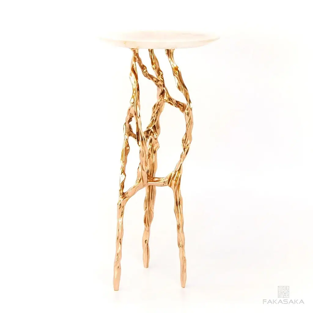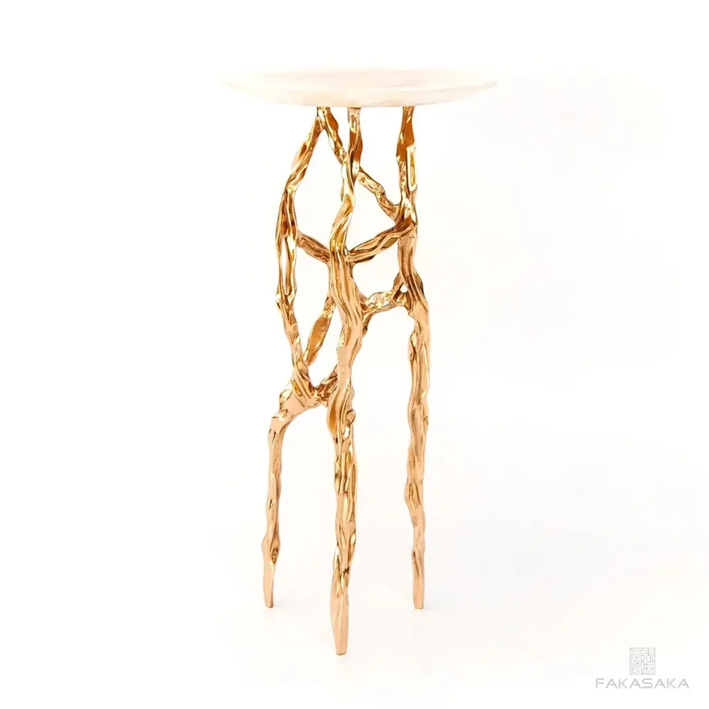Alexia drink table with Onyx top by Fakasaka Design.Dimensions: W 30 cm, D 30 cm, H 62 cm.Materials: polished bronze base, Onyx top. Also available in different table top materials (Nero Marquina Marble, Marrom Imperial Marble and Translucent Onyx) and in dark or polished bronze base. FAKASAKA is a design company focused on production of high-end furniture, lighting, decorative objects, jewels, and accessories. Established in 2007, Fakasaka is the eponymous design company by Brazilian artist Fernando Akasaka distinguished by a penchant for producing intricate detailed cast bronze collectible design objects, furniture and jewelries. Fakasaka explores the contrast between the manmade and the natural through shapes and finishes that create a clear aesthetic. The constant challenge to balance elements is met with an outcome that is a striking assortment of bronze furniture and objects in oxidised and polished finishes, accented with precious regional stones, granites and rich prehistoric reptilian motifs.
