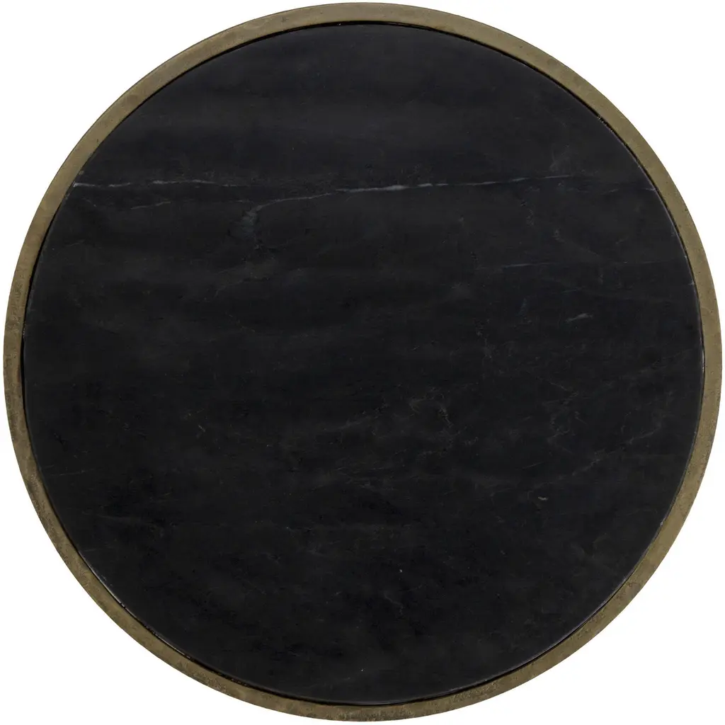 Eye-catching from all angles, the Alicent End Table is sure to draw attention. Features a round black marble table top with an antique brass iron base. Expertly crafted with an artful design. As marble is a natural material, unique veining, pitting, fissures, micro-cracks and colour variations are all characteristics that add to the uniqueness and beauty of each piece. Made in India. With refined craftsmanship, this design was brought to life by skilled local artisans. Due to the nature of handcraftsmanship, unique imperfections such as fissures, markings and variations in colour and shape are welcomed and appreciated characteristics for a truly one-of-a-kind piece.