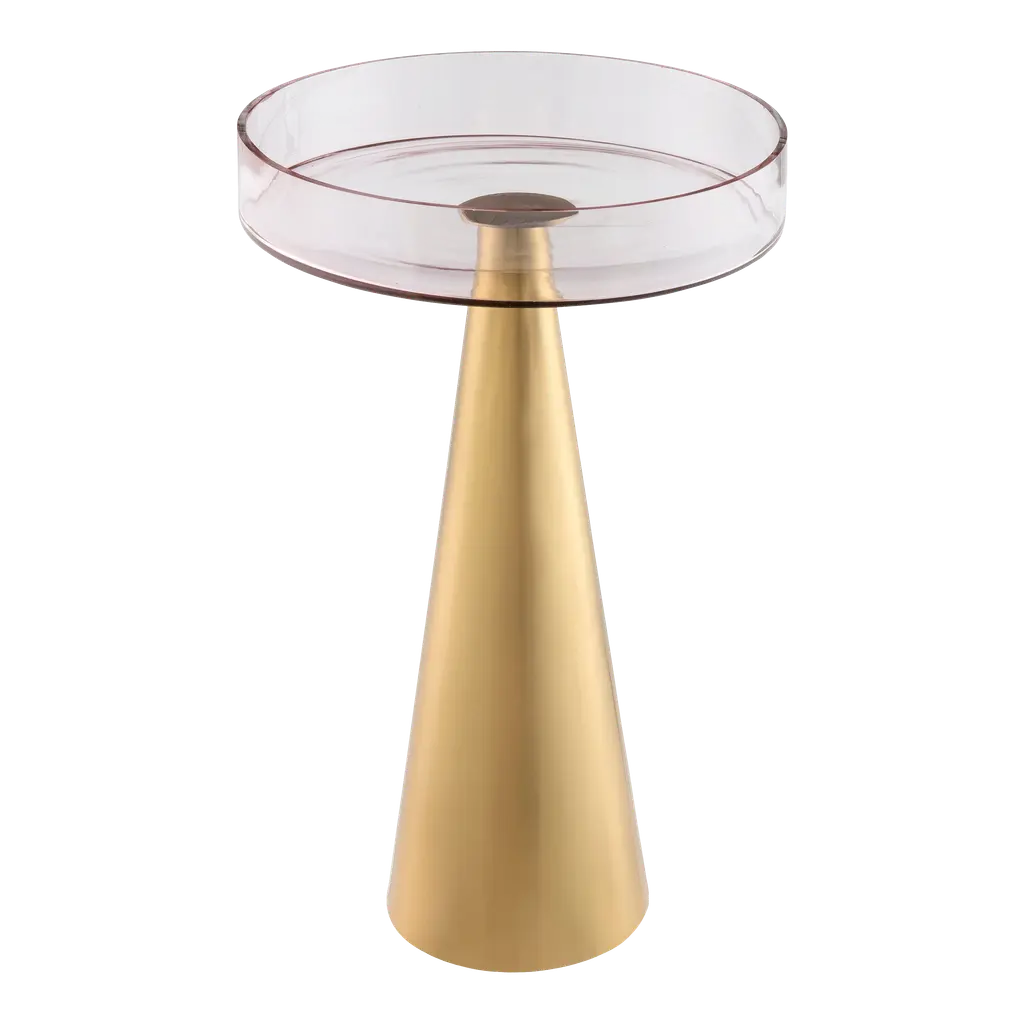 Compliment your space with the modern and stylish Alo side tables. Featuring a transparent pink glass perched upon a gold conical base, this table is an instant eye-catcher. Available in 2 sizes, it shines as a single table or as a set.