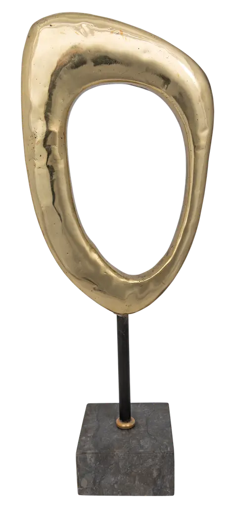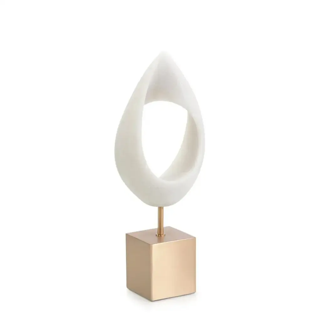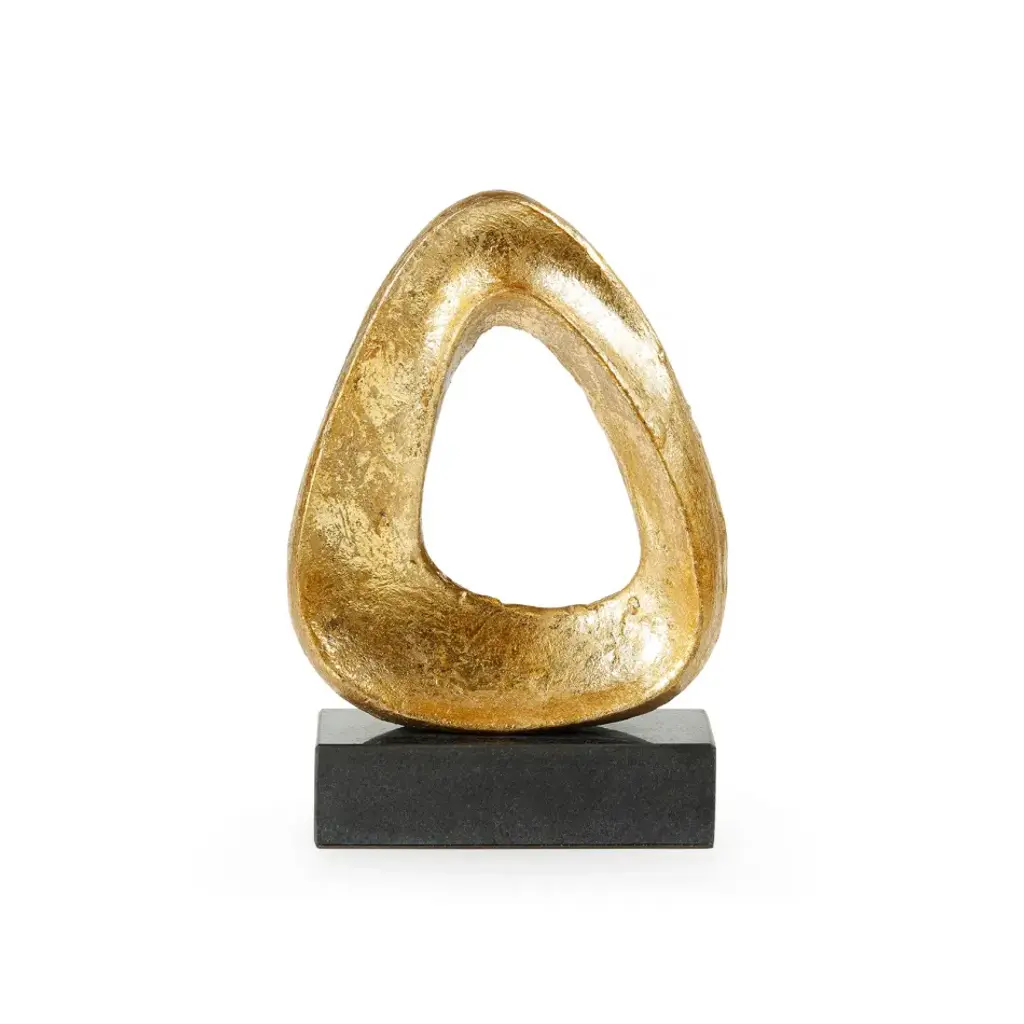 The Alpha Statue is both charming and glamorous. It's the perfect finishing accessory to a living room or bedroom. Placed on a coffee table or a side table, this distinctly modern piece casts a glittering spell of allurement as though it's a piece of found treasure or an artifact. Hand-cast in iron and hand-leafed in gold, the Alpha Statue sits atop a glossy black or white marble base. The white is more feminine and light, while the black is more masculine and traditional. This is a forever piece, versatile in its uses and timeless in its beauty.