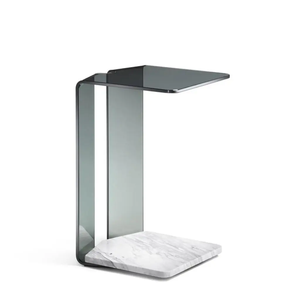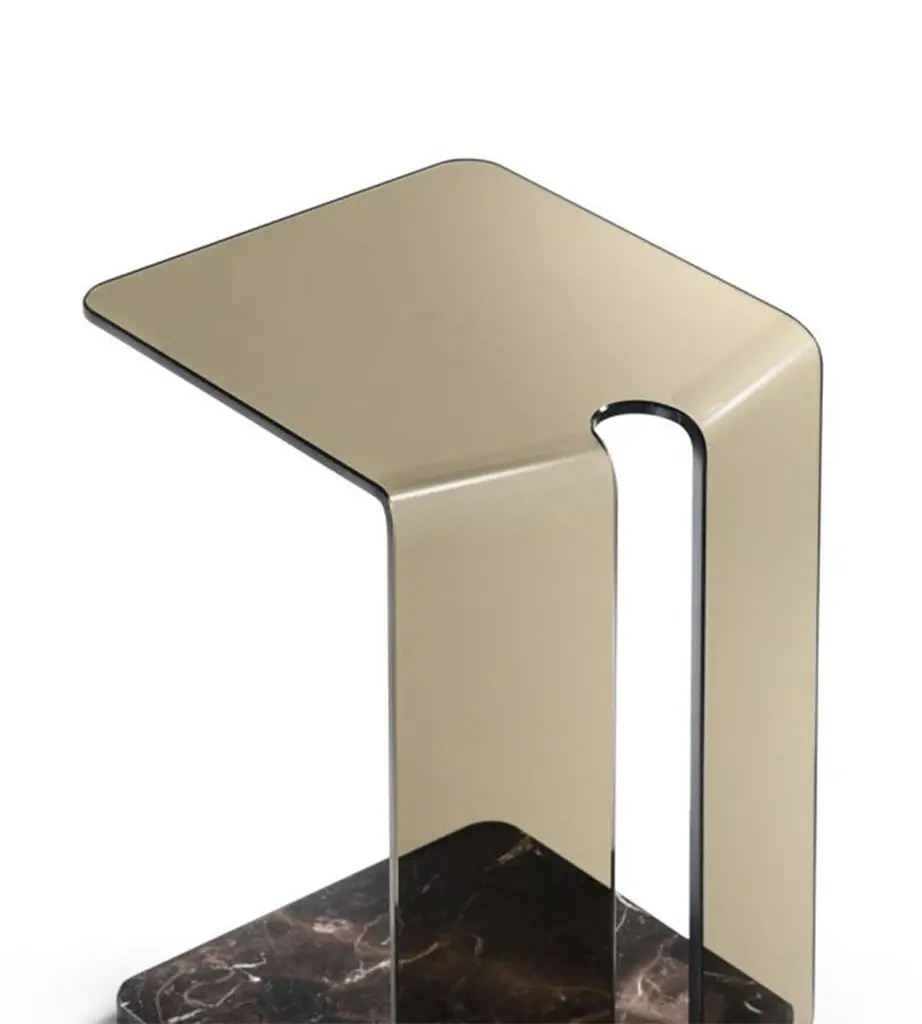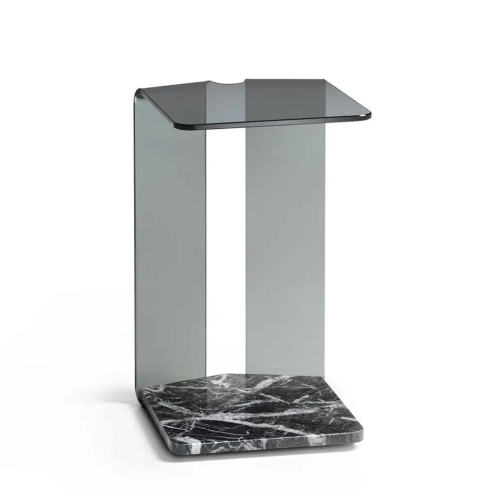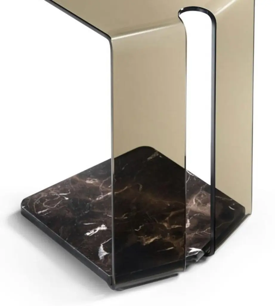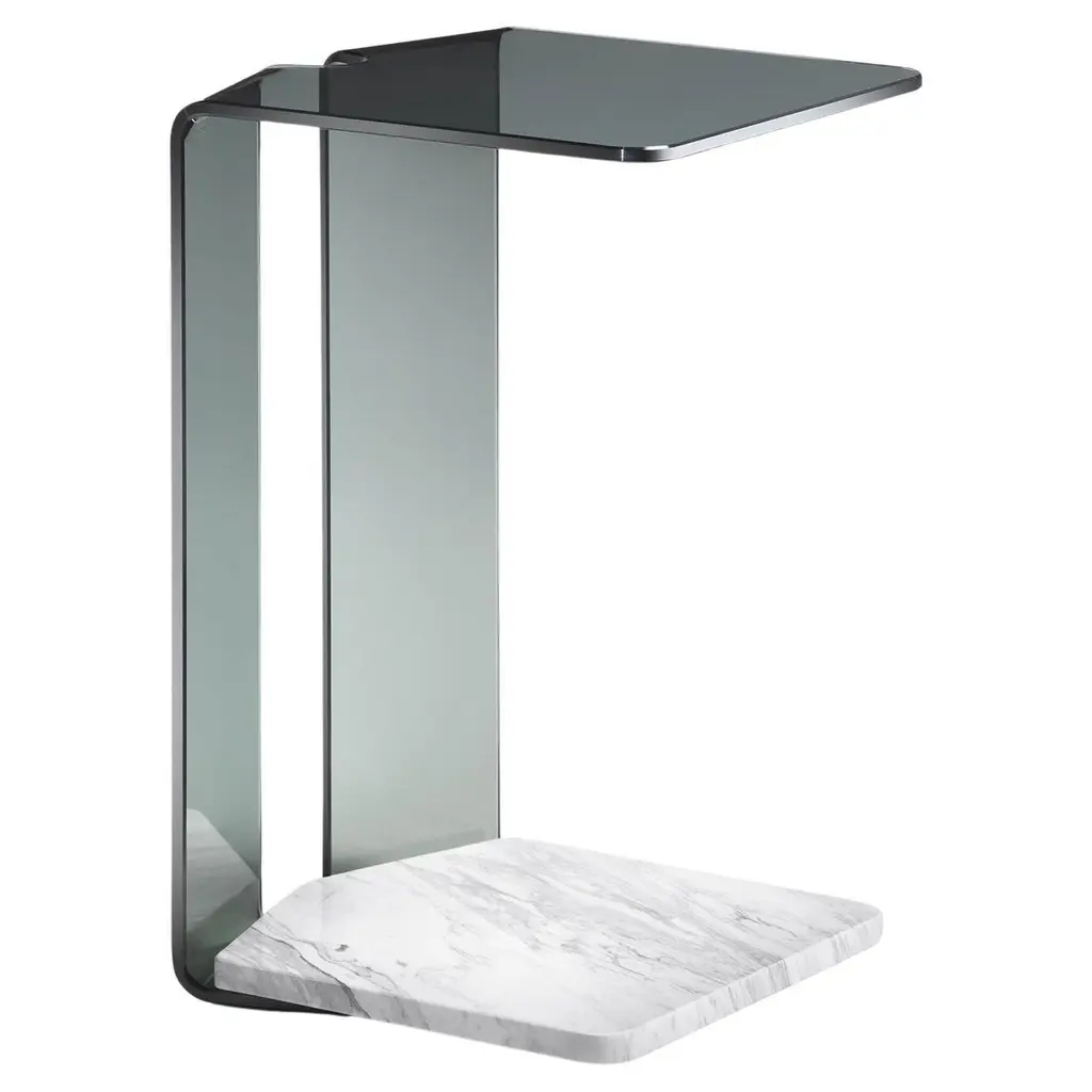 Side Table Alta with structure in curved fused glass10mm thickness, in bronze finish with bottom top in brown marble. The upper top can support up to 10kg.Also available on request with glass in smockedfinish and with bottom top in grey marble, price: 2090,00€Also available on request with glass in smockedfinish or clear glass finish with bottom top in whitecalacatta marble, price: 2250,00€.