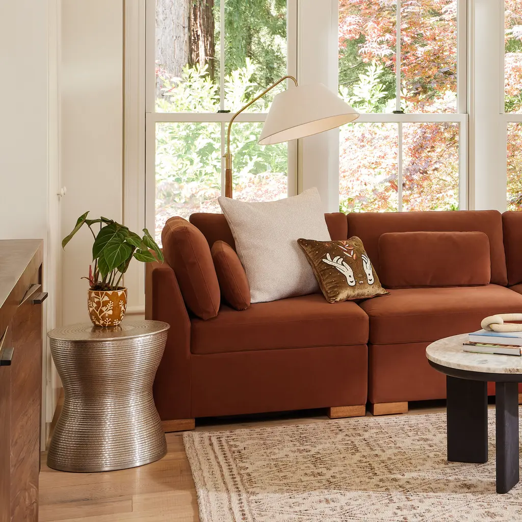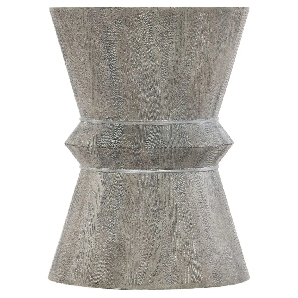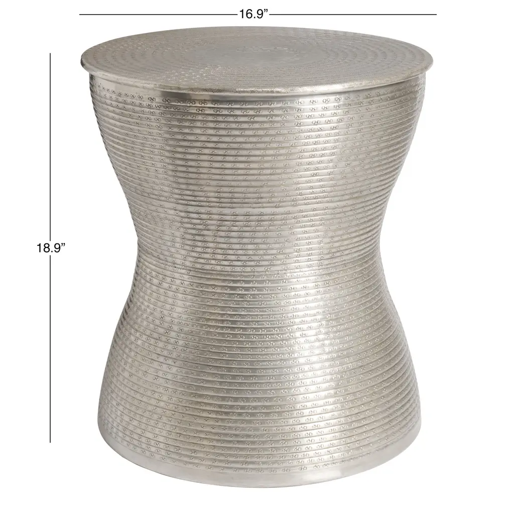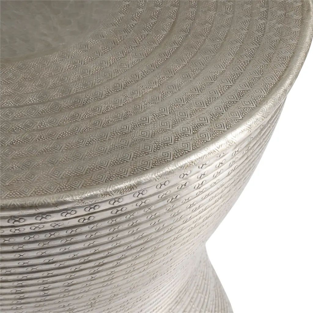 Crafted of lightweight aluminum in a refined antique-pewter finish, our drum-shaped Alto accent table is hand hammered with an intricate textural design. The deliberate patterning of its sides and surface reveal unique variations in the depth of its detailing, highlighting the skilled hand of a singular artisan. Compact for small spaces with a classic hourglass silhouette, this global end table is proud to be entirely one of a kind.