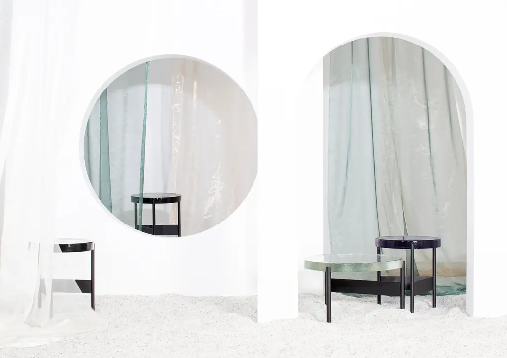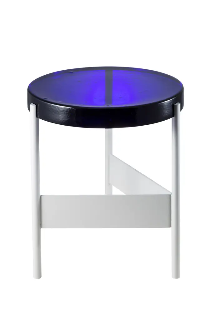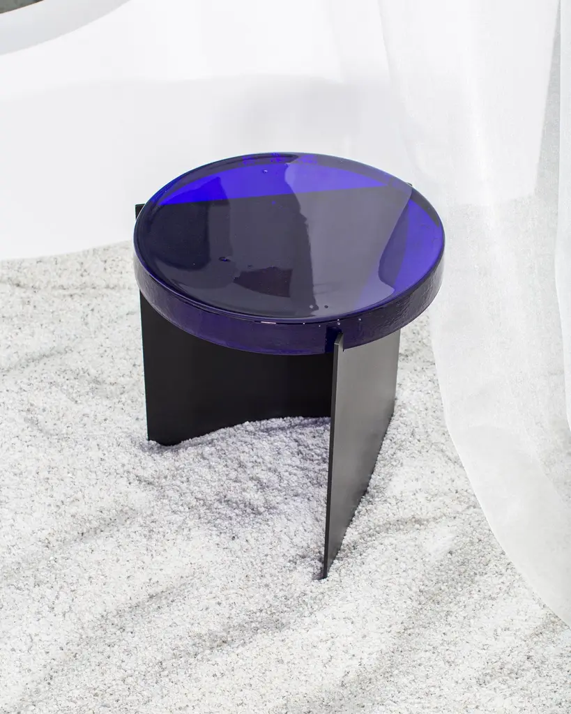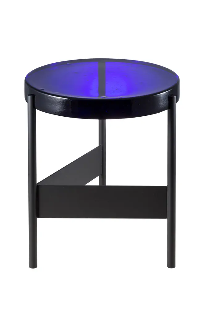 Alwa two blue black side table by PulpoDimensions: D38 x H44 cmMaterials: casted glass; powder coated steel Also available in different finishes. Normally, glass is regarded as being lightweight with sharp edges. In contrast, Sebastian Herkner’s alwa is massive and possesses gentle contours. The raw, hot, glass mass with its natural bubbles is an imprint of the structure, including the uneven, sensitive surface. So nice to touch … but also ideal for placing a variety of items.Pulpo is a design editor for high-end products in the home sector.Design is our passion. Art is our engine. We are fascinated by the craft of the ceramic and glassblowing workshops and are guided by the rough aesthetics of these unique pieces.Pulpo’s philosophy goes back to the idea of ??the “carte blanche”. Our designers and artists develop their designs freely and experimentally. A variety of materials and a weakness for structures are our strengths.The headquarters of pulpo is in Weil am Rhein, near the Swiss border. Consisting of the creative and sales department, warehouse and logistics, this is the think tank for our artists and designers. pulpo’s dealer network extends far beyond Weil am Rhein – from Iceland and Dubai to Australia.Pulpo is movement – is possibility – is passion.In 2006, pulpo was founded by Ursula and Patrick L’hoste as a design brand at the interface between shape and material. pulpo’s conception is to edit lighting, furniture and accessoires on editor’s choice. The company’s focus is to conduct up-and-coming designers and selected manufacturers, using the nature of material’s to form the score. Materials such as ceramics, stone and especially glass, which is pulpo’s primary focus since 2013.
