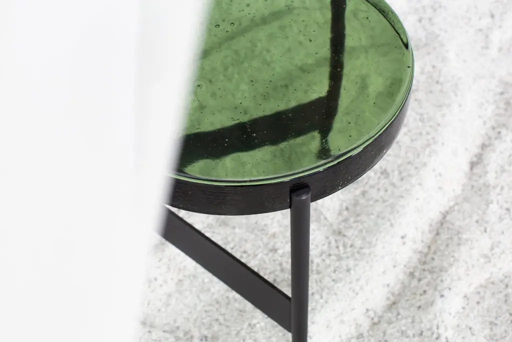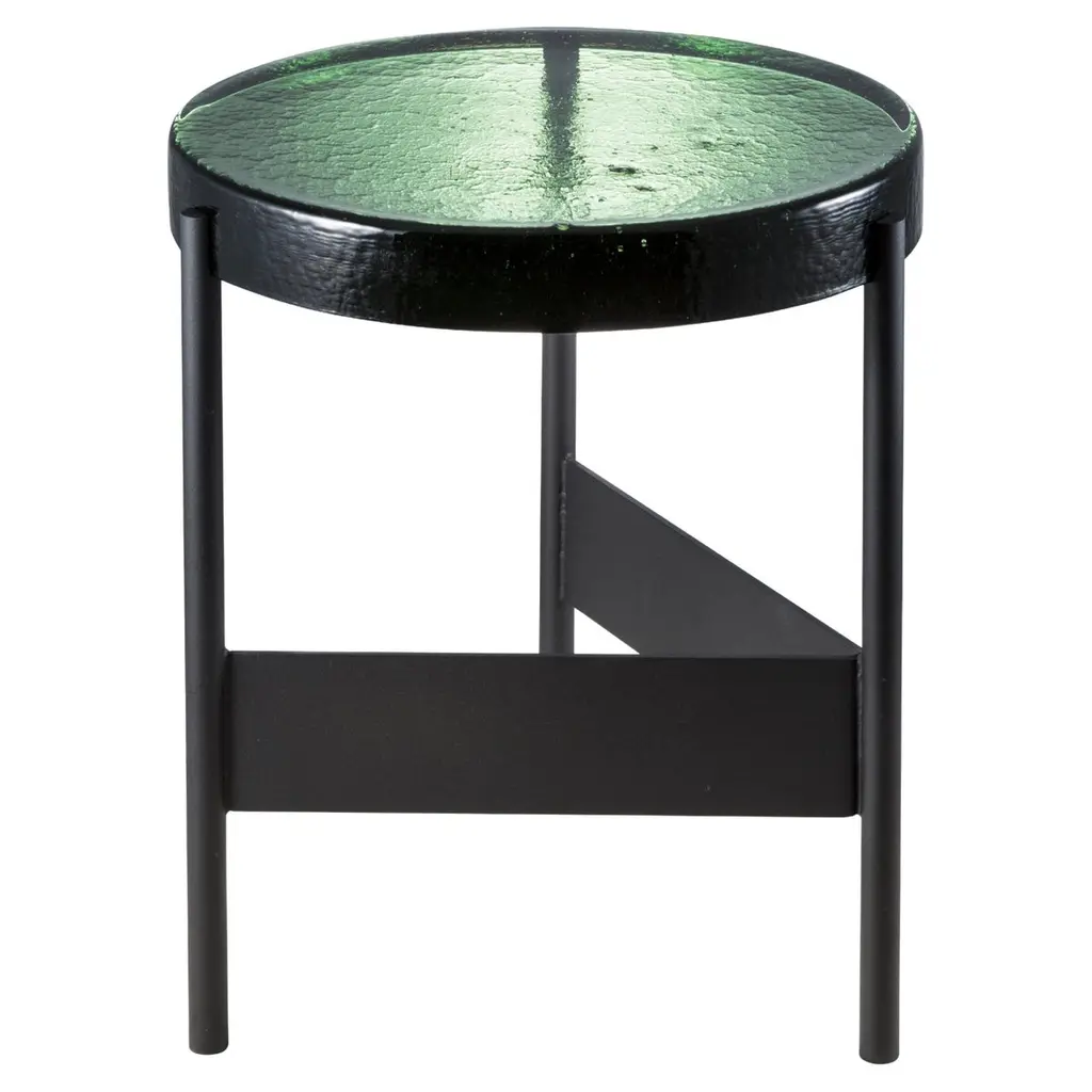 Alwa two blue black side table by PulpoDimensions: D38 x H44 cmMaterials: casted glass; powder coated steel Also available in different finishes.Normally, glass is regarded as being lightweight with sharp edges. In contrast, Sebastian Herkner’s alwa is massive and possesses gentle contours. The raw, hot, glass mass with its natural bubbles is an imprint of the structure, including the uneven, sensitive surface. So nice to touch … but also ideal for placing a variety of items.Pulpo is a design editor for high-end products in the home sector.Design is our passion. Art is our engine. We are fascinated by the craft of the ceramic and glassblowing workshops and are guided by the rough aesthetics of these unique pieces.Pulpo’s philosophy goes back to the idea of ??the “carte blanche”. Our designers and artists develop their designs freely and experimentally. A variety of materials and a weakness for structures are our strengths.The headquarters of pulpo is in Weil am Rhein, near the Swiss border. Consisting of the creative and sales department, warehouse and logistics, this is the think tank for our artists and designers. pulpo’s dealer network extends far beyond Weil am Rhein – from Iceland and Dubai to Australia.Pulpo is movement – is possibility – is passion.In 2006, pulpo was founded by Ursula and Patrick L’hoste as a design brand at the interface between shape and material. pulpo’s conception is to edit lighting, furniture and accessoires on editor’s choice. The company’s focus is to conduct up-and-coming designers and selected manufacturers, using the nature of material’s to form the score. Materials such as ceramics, stone and especially glass, which is pulpo’s primary focus since 2013.