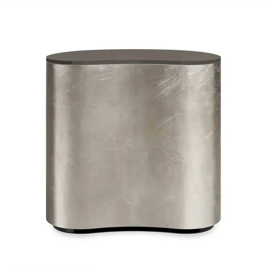 The Amalie kidney table is the smaller kissing cousin to the Adele Cocktail Table. Its modern shape is accentuated with a wide, smooth-surfaced case finished in Deep Bronze metal with a Brushed Deep Bronze metal top. The plinth is Almost Black with hidden casters for easy moving.