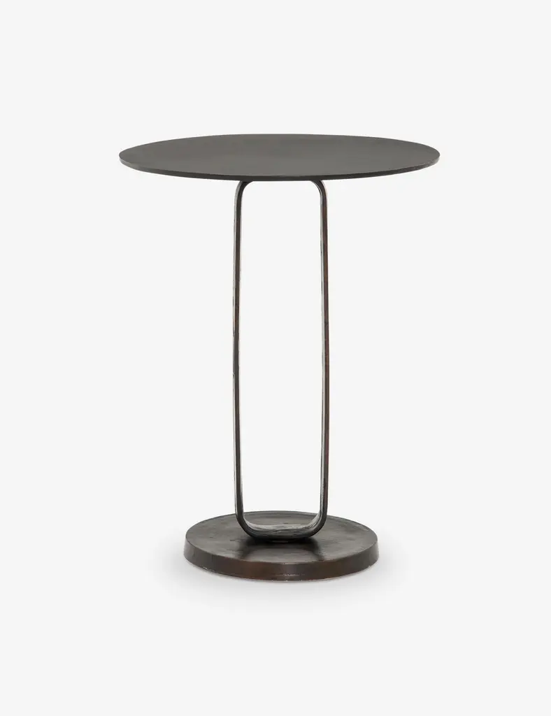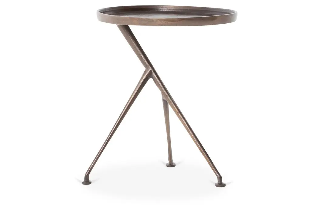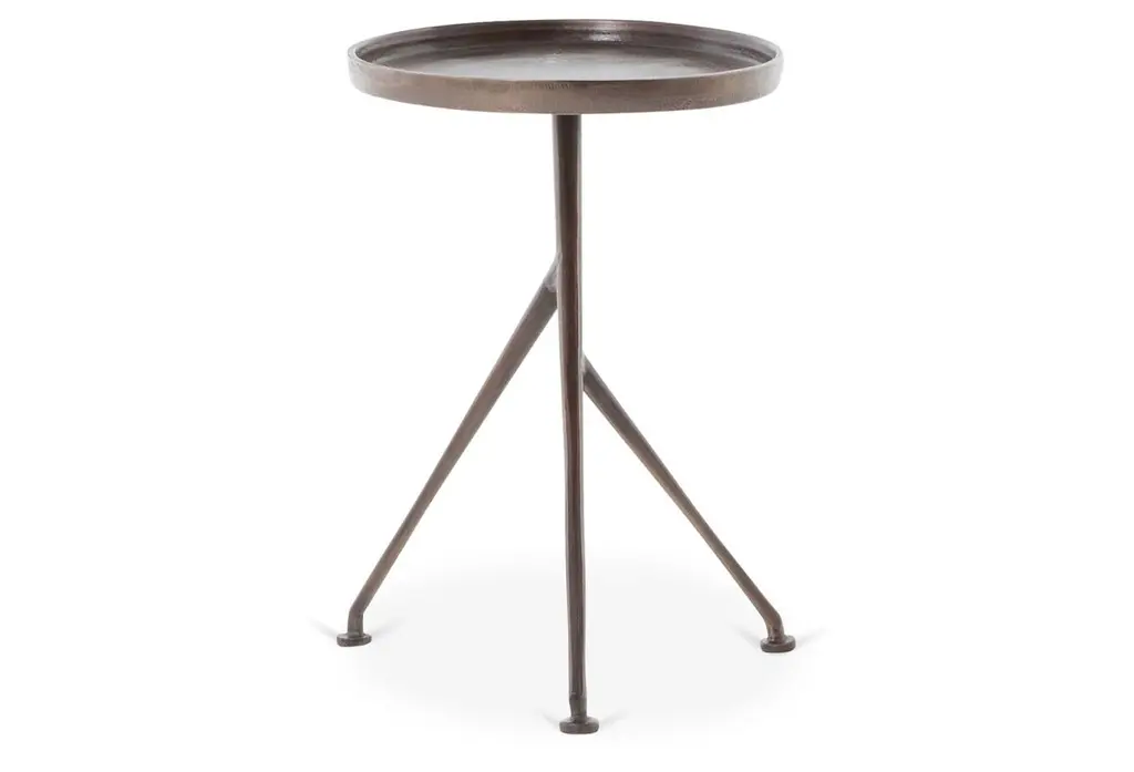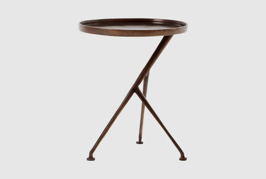 A stylish and practical addition to the porch, patio, or deck, this side table is crafted of aluminum with a round galleried top, asymmetrical tripod base, and antiqued rust finish.
