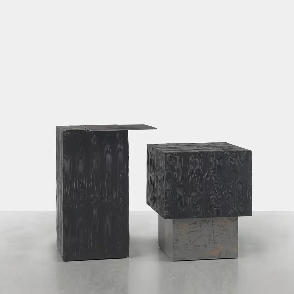 There is an ecological provocation on the “skin” of these side tables. Their irregular, pockmarked surface is designed to resemble that of logs charred by the fires ravaging South American forests. Mdf structure in Black 3D Wood effect resin with a soft touch finish. Iron top with Pure metal finish in Bronze-Zinc mix. Pure metal finishes, wooden veneers, and lacquered finishes are available, please contact the concierge for more information.