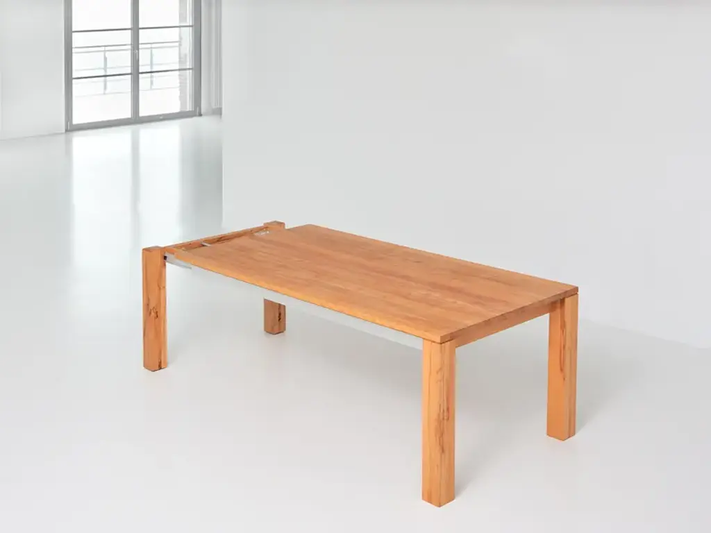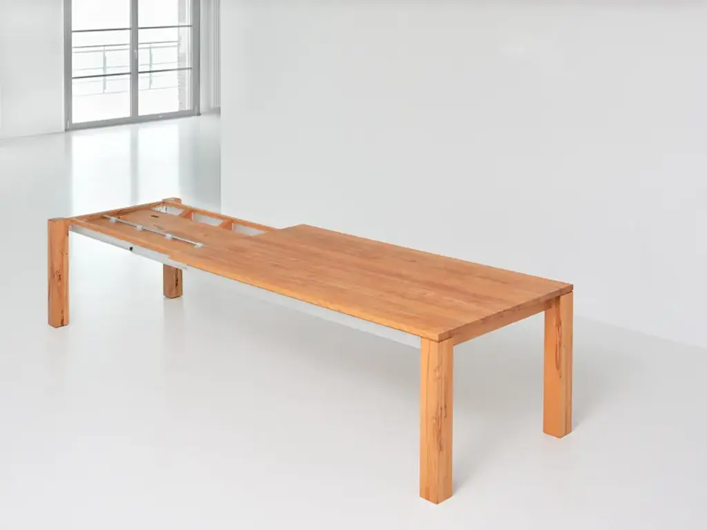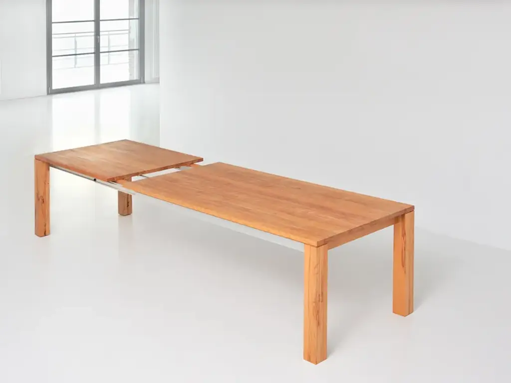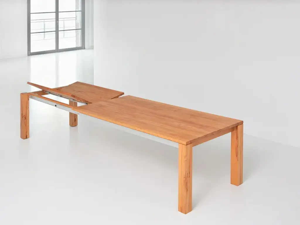 The table AMBER is an uncomplicated real master of metamorphosis. With some simple hand movements it can be extended by 117 cm (46 1/8"). Just as quickly the integrated additional leaf can be folded away again. Thanks to an aluminium frame it is child’s play to handle the pull-out system. And now you have the choice: AMBER is available in four basic lengths and three widths. We offer the matching table size for every room size. And, it goes without saying that we supply the solid wood table with its plain design in your favourite wood type: You can choose from European oak, knotted oak, ash, beech, core beech, American walnut and cherrywood. The robust surface has been treated with vegetable oil, and this guarantees longevity. Although the pullout- table can “grow” up to a length of 337 cm (132 5/8”), all AMBER models can be completely disassembled. Thanks to this they can be transported without problems through every door.Standard table height: 75 cm (29 1/2”)Leg profile: 10 x 10 cm (3 7/8”x 3 7/8”) On top 0,5 cm (1/4”) milledBasic length: 160 - 180 - 200 – 220 cm (63” – 70 7/8” – 78 3/4” – 86 5/8”)Width: 90 - 95 - 100 cm (35 3/8 ” – 37 3/8” – 39 3/8”)Extension possibility:with one butterfly leaf in addition up to 117 cm (46 1/8”)