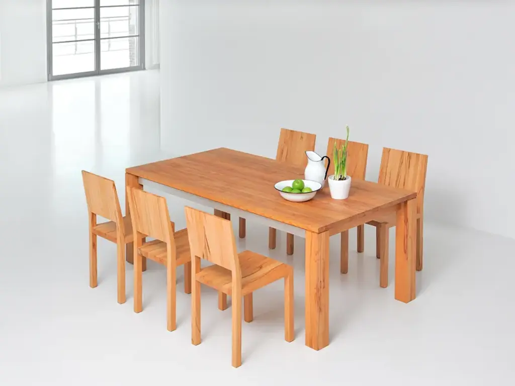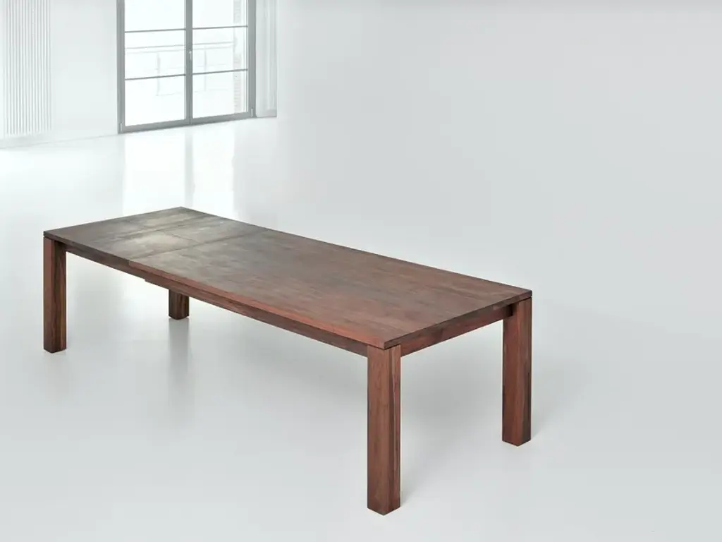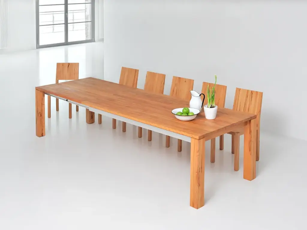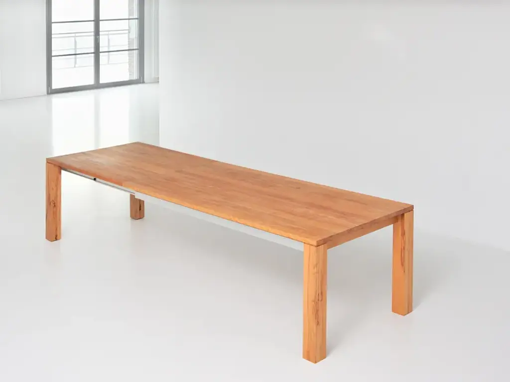The table AMBER is an uncomplicated real master of metamorphosis. With some simple hand movements it can be extended by 117 cm (46 1/8"). Just as quickly the integrated additional leaf can be folded away again. Thanks to an aluminium frame it is child’s play to handle the pull-out system. And now you have the choice: AMBER is available in four basic lengths and three widths. We offer the matching table size for every room size. And, it goes without saying that we supply the solid wood table with its plain design in your favourite wood type: You can choose from European oak, knotted oak, ash, beech, core beech, American walnut and cherrywood. The robust surface has been treated with vegetable oil, and this guarantees longevity. Although the pullout- table can “grow” up to a length of 337 cm (132 5/8”), all AMBER models can be completely disassembled. Thanks to this they can be transported without problems through every door.Standard table height: 75 cm (29 1/2”)Leg profile: 10 x 10 cm (3 7/8”x 3 7/8”) On top 0,5 cm (1/4”) milledBasic length: 160 - 180 - 200 – 220 cm (63” – 70 7/8” – 78 3/4” – 86 5/8”)Width: 90 - 95 - 100 cm (35 3/8 ” – 37 3/8” – 39 3/8”)Extension possibility:with one butterfly leaf in addition up to 117 cm (46 1/8”)