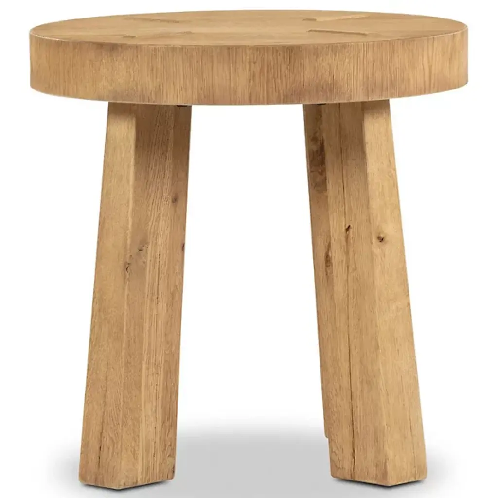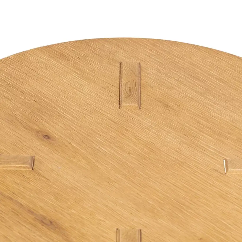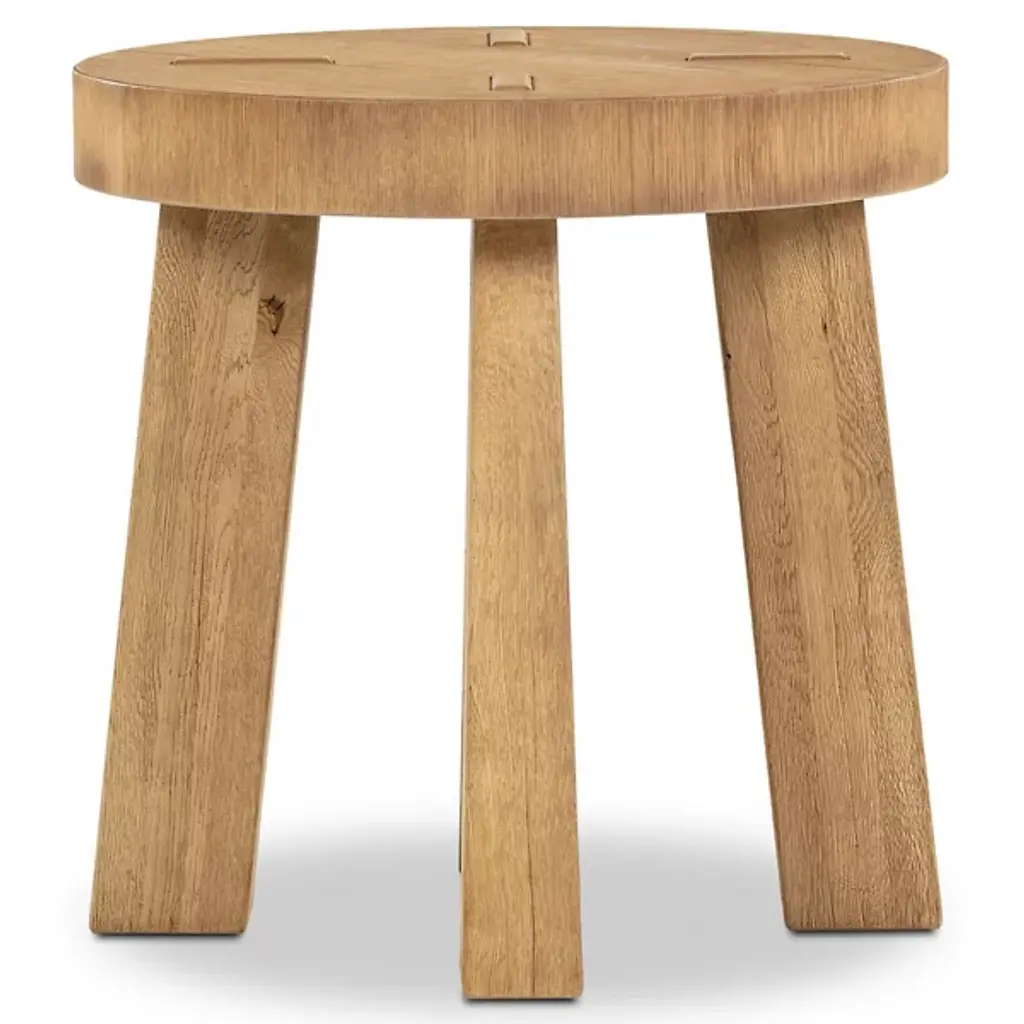 The Amber Lewis x Four Hands Sadira End Table displays a rounded top in distressed thick oak veneer that references Swedish folk furniture traditions. Pull-through legs showcase exposed joinery details that celebrate traditional woodworking techniques, while the solid oak construction ensures structural durability. The distressed finish adds authentic character to the surface, creating variations in color and texture that suggest years of use. This construction method highlights the connection between the top and base through visible joinery, creating functional furniture that honors traditional craftsmanship.