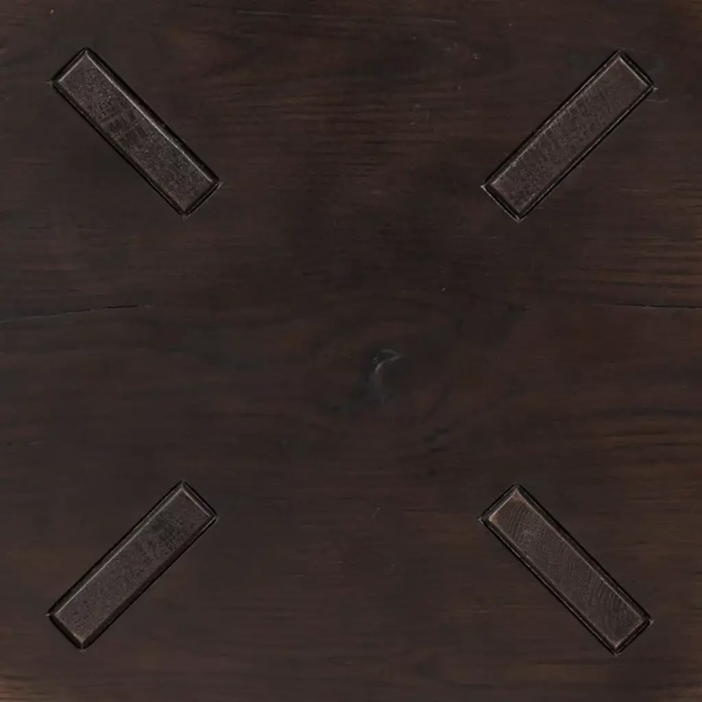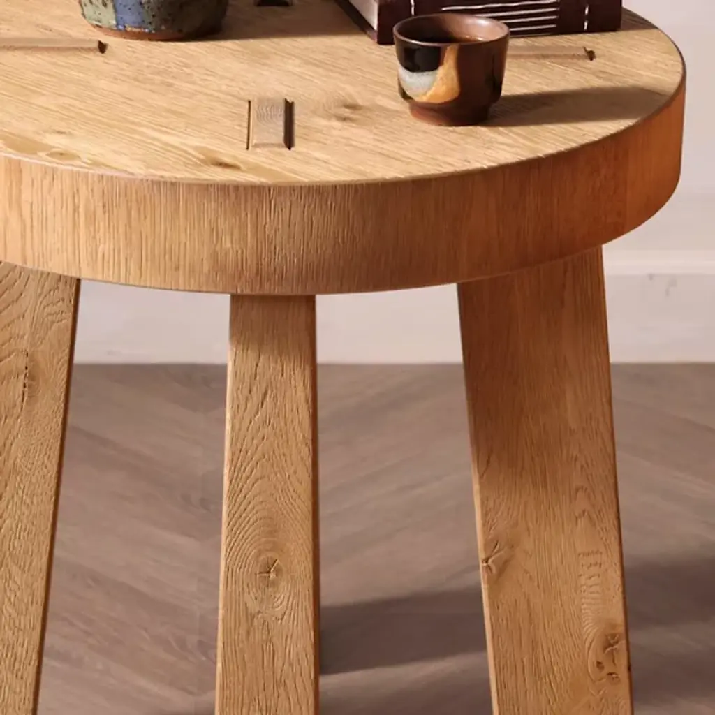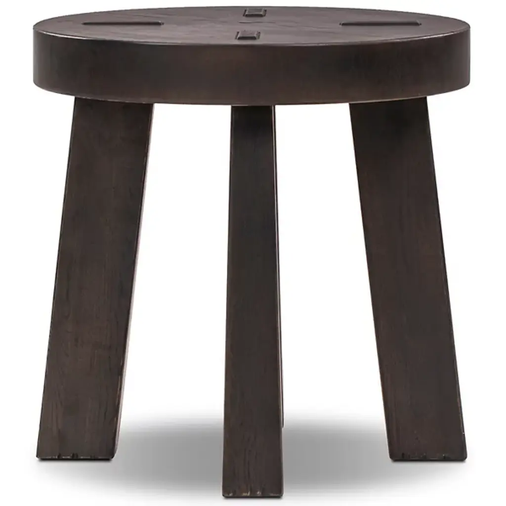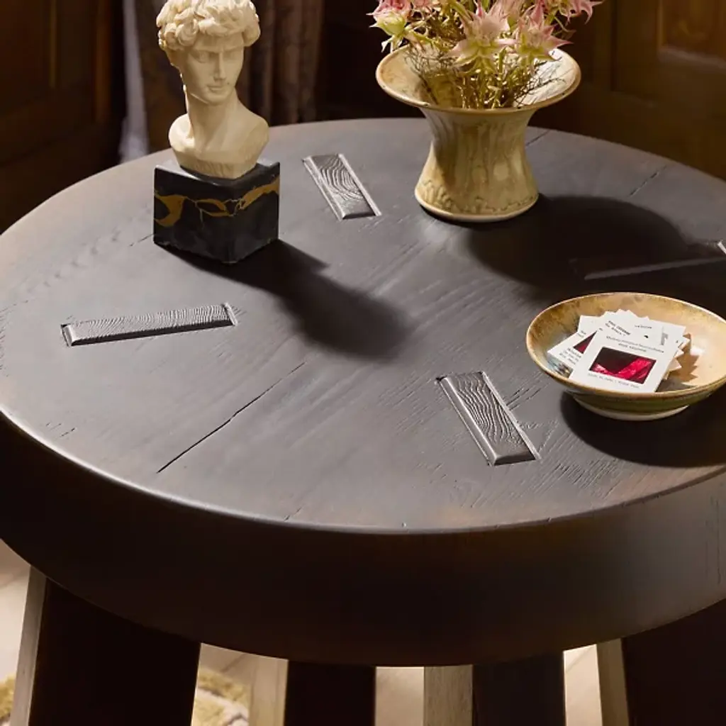 The Amber Lewis x Four Hands Sadira End Table displays a rounded top in distressed thick oak veneer that references Swedish folk furniture traditions. Pull-through legs showcase exposed joinery details that celebrate traditional woodworking techniques, while the solid oak construction ensures structural durability. The distressed finish adds authentic character to the surface, creating variations in color and texture that suggest years of use. This construction method highlights the connection between the top and base through visible joinery, creating functional furniture that honors traditional craftsmanship.