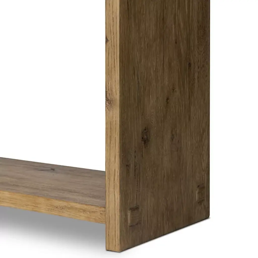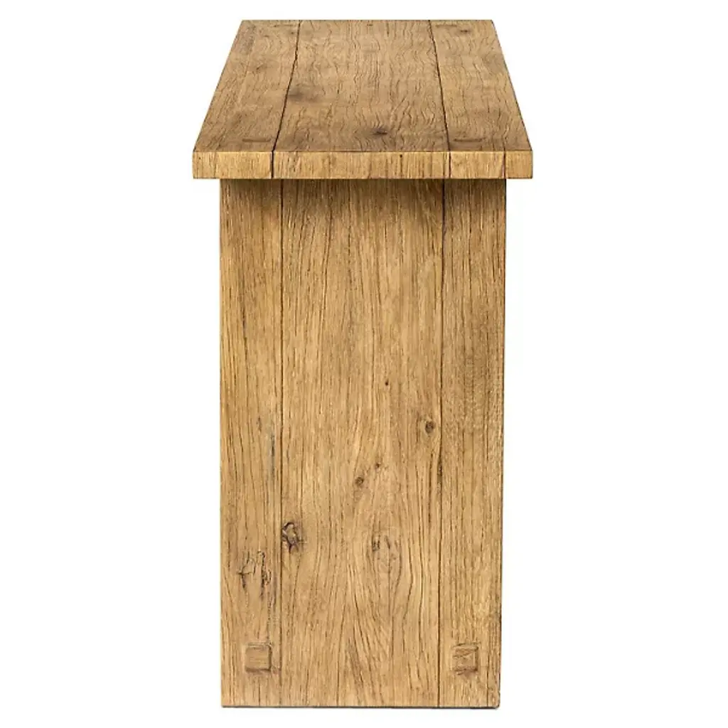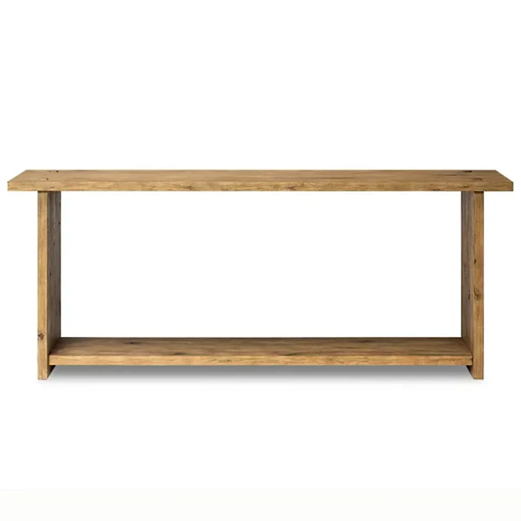 The Amber Lewis x Four Hands Zeno Console Table reveals traditional craftsmanship through distinctive pull-through joinery connections. Extending the same artisanal approach as its end table counterpart, this console showcases oak's natural character in a paneled design that highlights rather than conceals the wood's personality. A spacious lower shelf offers practical storage while maintaining the table's clean lines and open feel. Handcrafted to serve entryways, dining areas, or behind sofas, this table brings understated refinement to transitional spaces.