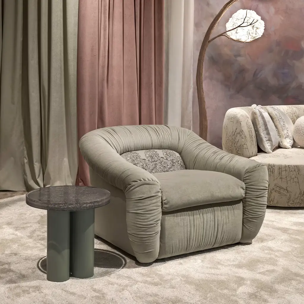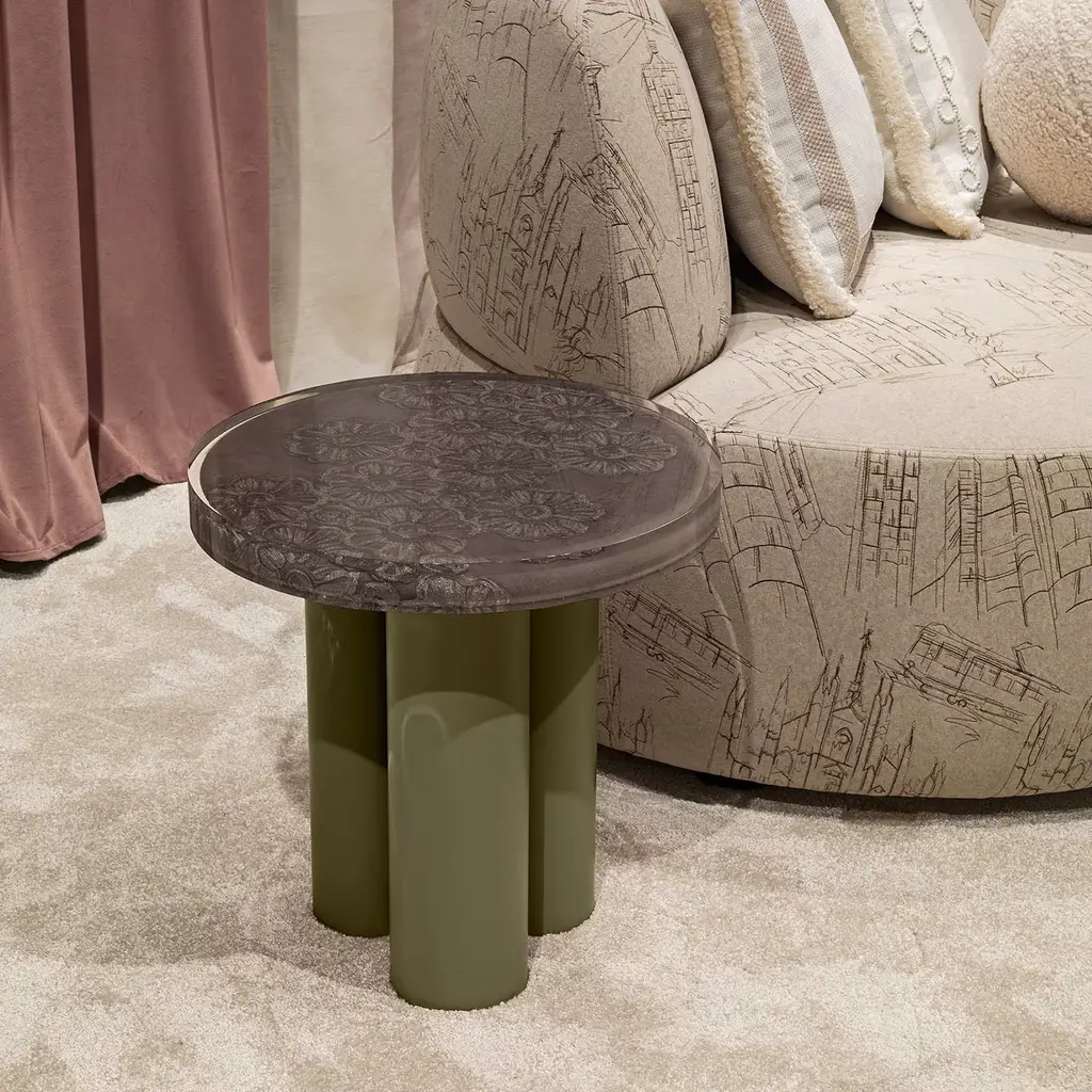 Minute floral embroideries crafted from silvery threads on fine gray fabric are the element that, trapped within a thick and transparent resin top, lends this coffee table its romantic and exclusive flair. Painted in a relaxing shade of green, three cylindrical legs arranged in a cluster sustain the top for sculptural support, further enhancing the top's refined inner embroideries.