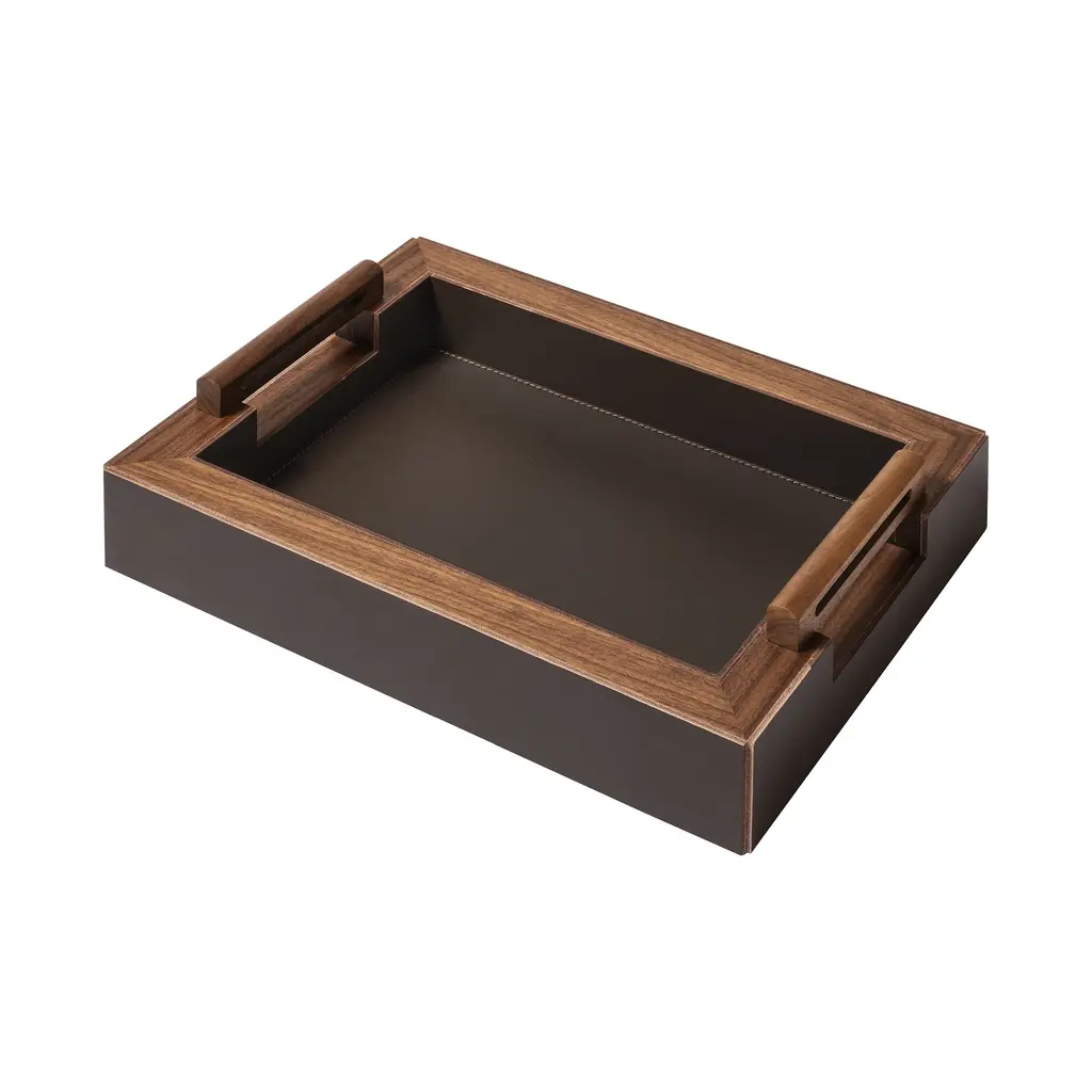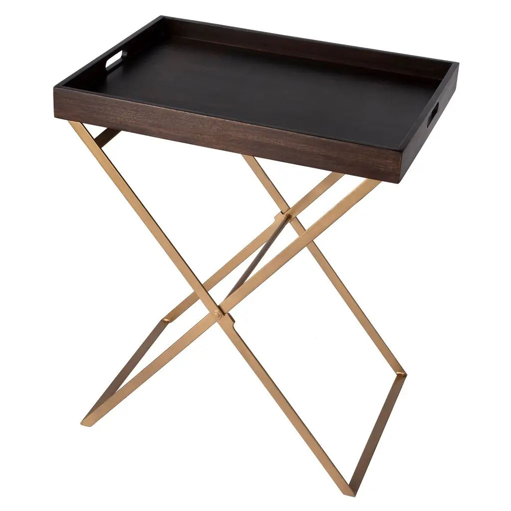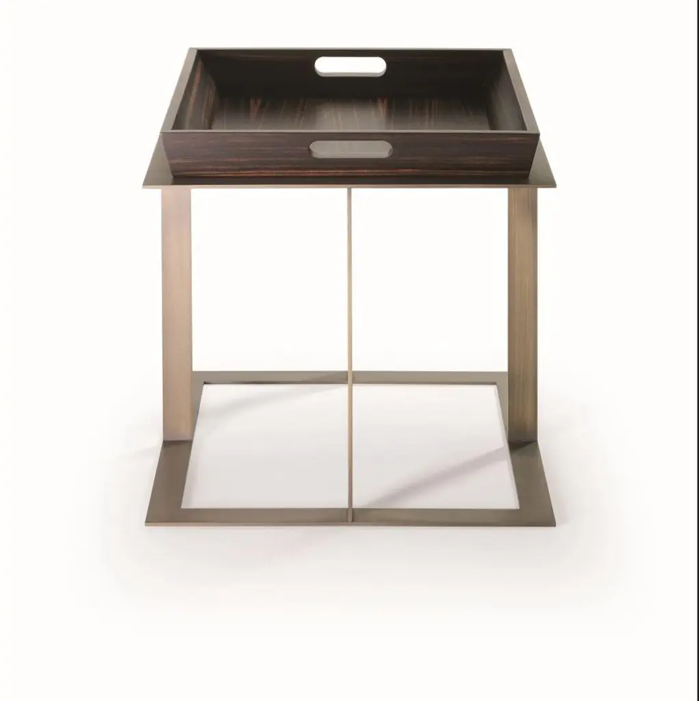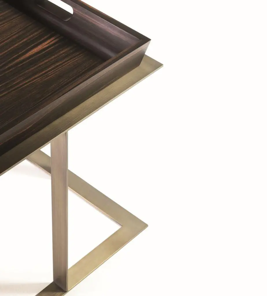 The AMBROSS side table is an outstanding example of luxury and masterful craftsmanship. The removable tray made of matte ebony is supported by a base of antique bronze. The tray is also available in a variant made of mocha-stained ash wood, which harmoniously combines with a polished base of black nickel. Another option features a burnished base and a tray made of matte ebony, offering creative design possibilities. The metal frame is finished with polished black nickel, enhancing the modern look of the table.