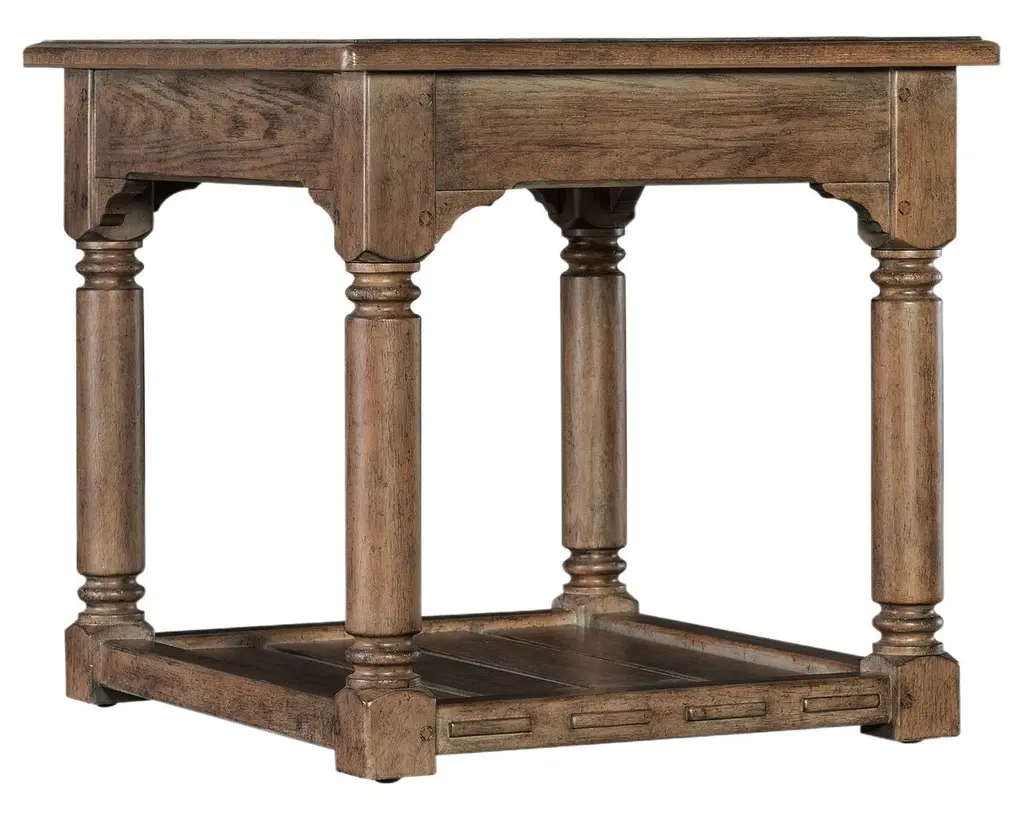 In a classic and clean design with a nostalgic flair, the Americana End Table features intricately crafted legs and scroll accents in the corners, exuding a sense of timeless craftsmanship. The table includes a planked bottom fixed shelf with an interlocked design and a Solid-Wood Edge Top, inviting a tactile connection with past generations. The smooth surface and antique bronze metal alloy pulls add a final touch of elegance, making it a perfect addition to any living space.