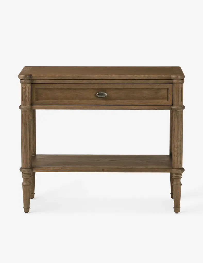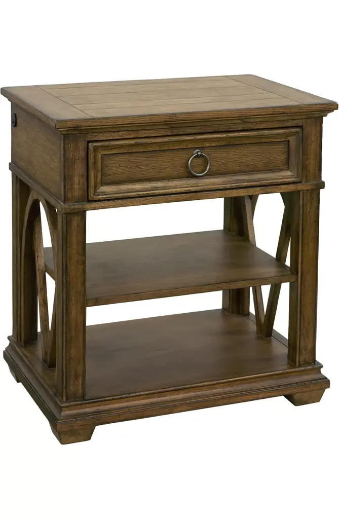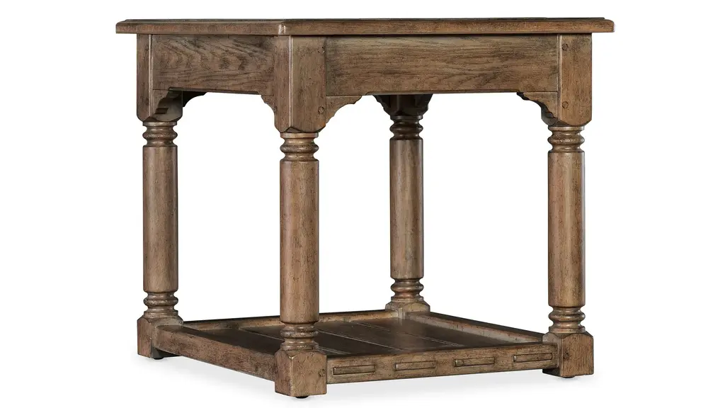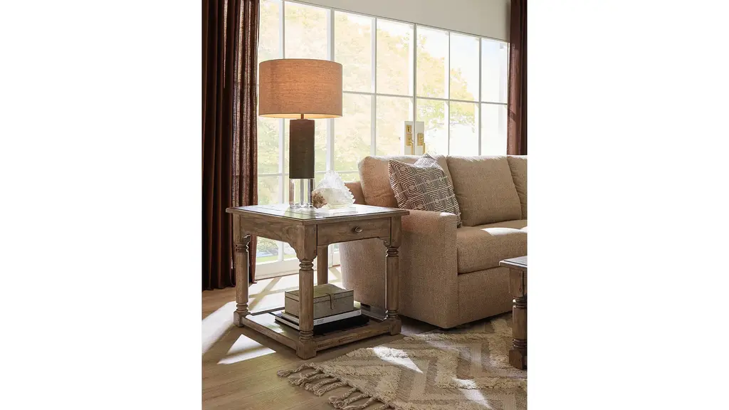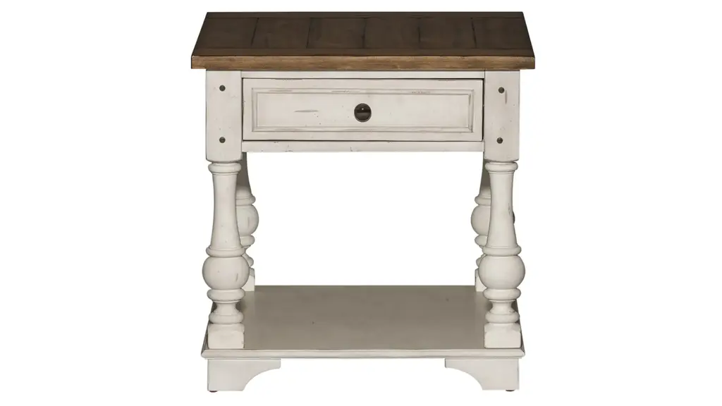 Americana End Table has turned carved legs, scroll accents in the corners and a planked bottom fixed shelf with an interlocked design that exudes craftsmanship. Made of Oak Veneers with a Solid-Wood Edge Top, it is finished in Honey, a gentle, warm brown tone with distressing that hints at the passage of time, while the smooth surface invites you to run your fingers across it, connecting you with past generations. A metal alloy oval pull in an antique bronze finish adds a final touch.