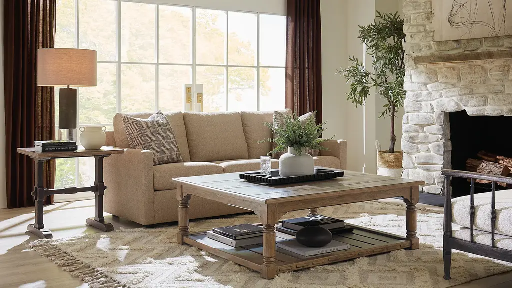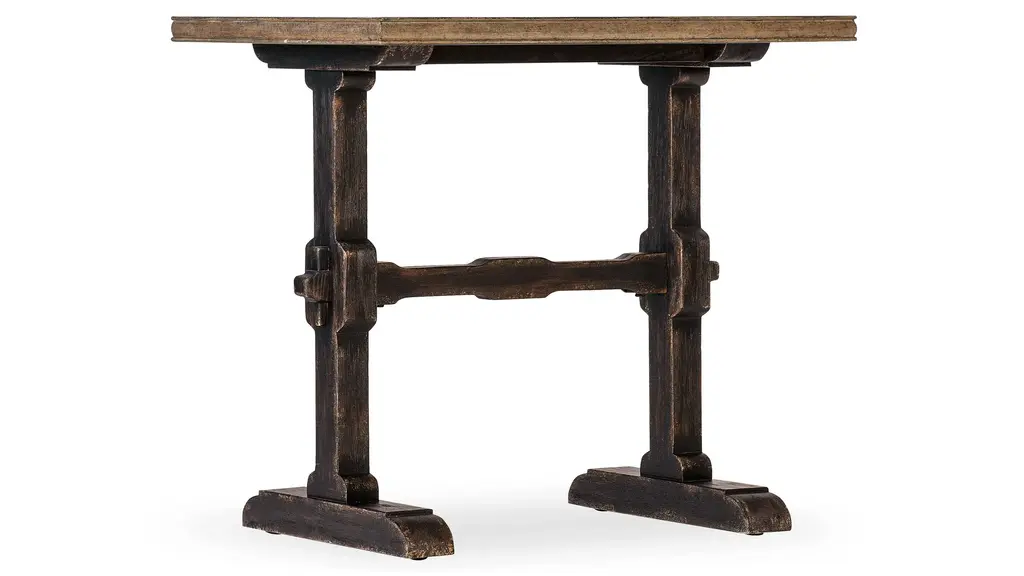 Americana Trestle End Table has a two-tone finish combining a parquet Oak Veneer top design with a Molasses finish on the base. Capturing the essence of a well-loved heirloom, the deep dark Molasses tone over Cathedral Oak Veneers adds warmth, while the variations in color reveal the natural beauty of the wood beneath. The base is an interlocked carved stretcher design. Solid-wood edge top.