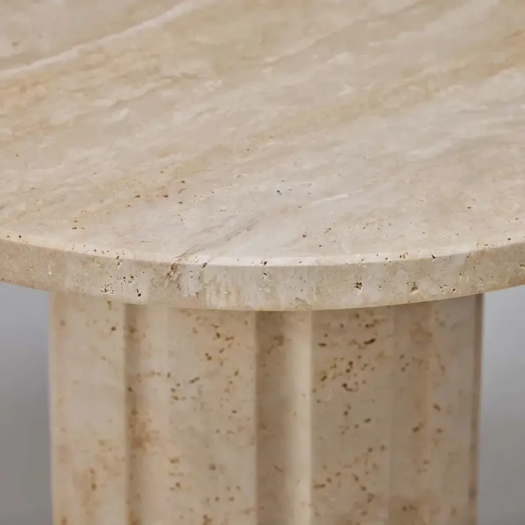 Raw travertine brings warmth and dimension to the Amerigo Side Table and its classical base. Granite and marble are natural materials; variations in coloration, veining and texture are to be expected. Veins, smooth to the touch, are not defects, but rather natural imperfections that add to the uniqueness and charm of each piece.