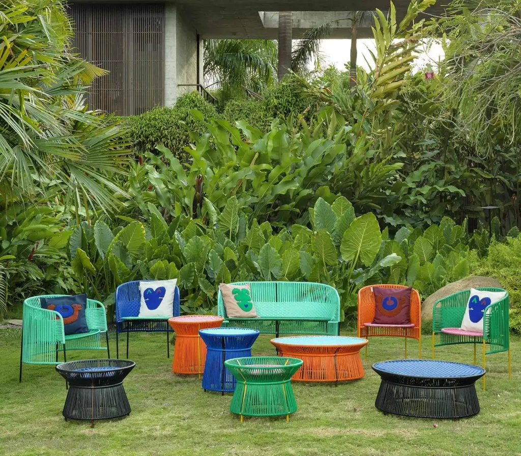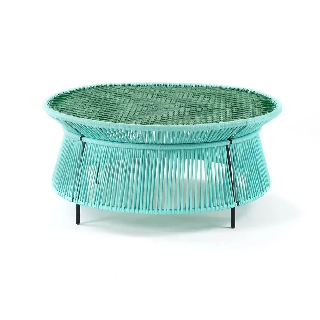 The charming Caribe Low Side Table is a colorful companion for seating arrangements inside and outdoors.It’s part of the Caribe collection, designed by Sebastian Herkner for ames. The German designer visited Colombia together with ames founder Ana Maria Calderon-Kayser and translated the vibrancy and spirit of the country’s people and traditions into joyful, modern furniture pieces defined by clean lines, strong colours and the hand-woven webbing.Height: 360 mmDiameter: 800 mmMaterialGalvanized and powder coated tubular steel. PVC strings made from recycled plastic