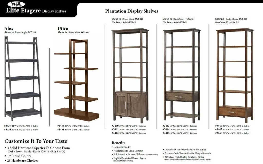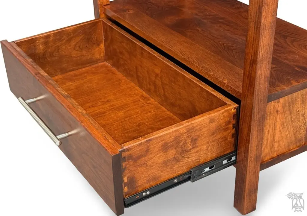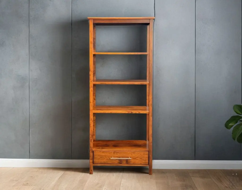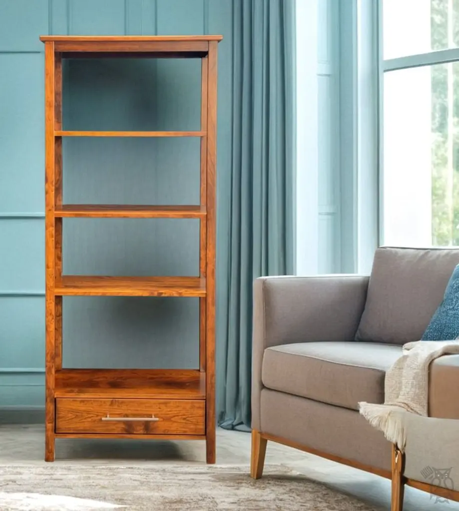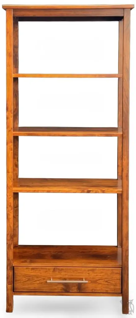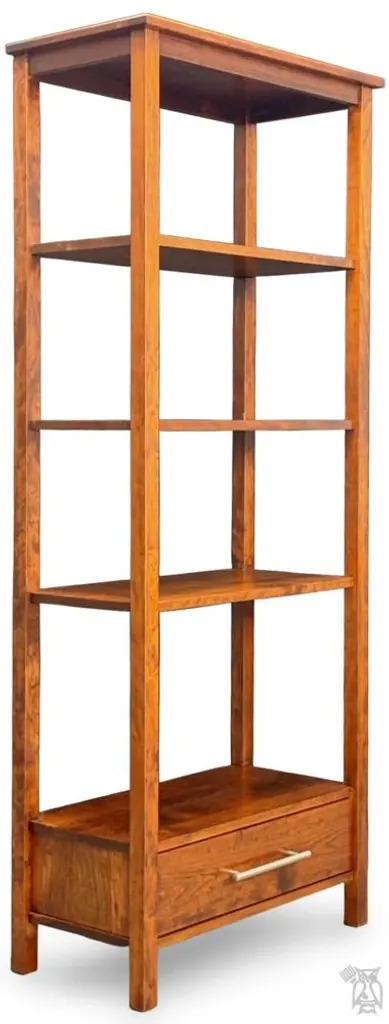 Amish Crafted Solid Rustic Cherry Wood Etagere Bookcase With Drawer in Michaels Finish. This item is stocked in Solid Rustic Cherry Wood with Michaels Finish or special-order wood and color. The table features one drawer and fixed shelving. This open style etegere bookcase works great in a hallway, living room or home office. The Metro Modern Collection is a line of handcrafted, Amish-made furniture that blends classic simplicity with modern urban design. Crafted from solid hardwoods like maple and cherry, each piece features clean lines, straight legs, and minimalist detailing—hallmarks of the Shaker tradition. The collection includes a variety of occasional tables, such as coffee tables, end tables, and TV stands, all customizable in wood species, finishes, sizes, and hardware to suit individual preferences. This collection is ideal for those seeking heirloom-quality furniture that complements both traditional and contemporary interiors. Its timeless aesthetic and durable construction make it versatile for various living spaces. Rustic Cherry takes on a more relaxed feel, with all its natural knots and grain variations, bringing a truly unique look to any table. Janka scale: 950. Rustic woods often feature small knots are filled with dark epoxy. Each collection has a full range of matching coffee tables, end tables, sofa-console tables, writing tables, and entertainment consoles. The collection features: Heirloom quality Handcrafted in the USA to last a lifetime Full extension drawer glides English dovetail drawer boxes Drawer boxes made from the same wood as the table or cabinet Premium soft-close anti-rattle hinges High-performance, high-quality catalyzed finish offers extreme durability Standard Build Options: Standard woods: Red Oak, Brown Maple, Rustic Cherry, Rustic Quartersawn White Oak, Rustic Hickory, Rustic Quartersawn White Oak or Ambrosia Maple Choose single or two-tone stain or painted colors 27 hardware options Custom Build Options (one-time 25% upcharge to make any or all of these changes): Premium Woods: Premium Cherry, Premium Quartersawn White Oak, Elm Custom sizes: Change width, depth, and/or height Choice of single tone, two-tone, distressing, rub-thru, glazing 27 hardware options All Y and T Woodcraft is handcrafted by hand in the heart of Ohio just for you. All furniture is hand-crafted from 100% solid wood. The wood is protected by a sealant offering excellent moisture and heat resistance. Visit our store to see all of your options to personalize this furniture your way. Download the Y and T Catalog in the Resources tab to see styles, sizes, woods & colors. Contact the showroom for two-tone selections or to get a quote on your perfect table! No particle board. Made in the USA. Matching pieces sold separately. Custom size modification and pricing at the discretion of Hoot Judkins Furniture. Manufacturer: Y and T Woodcraft