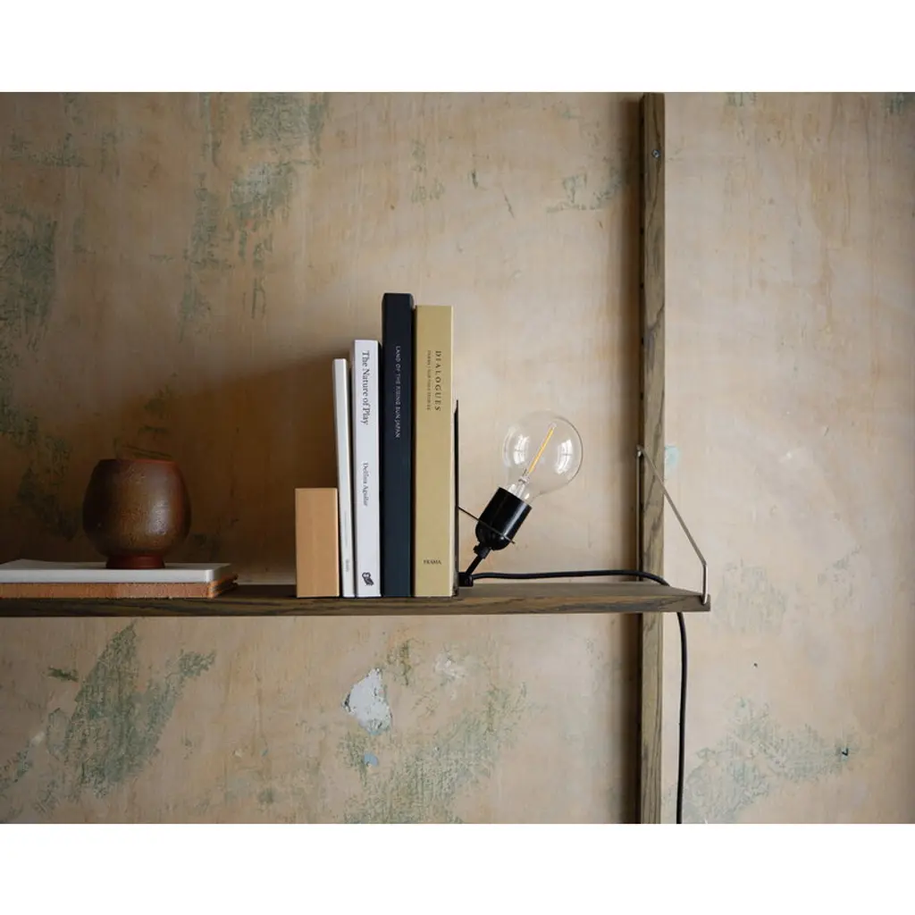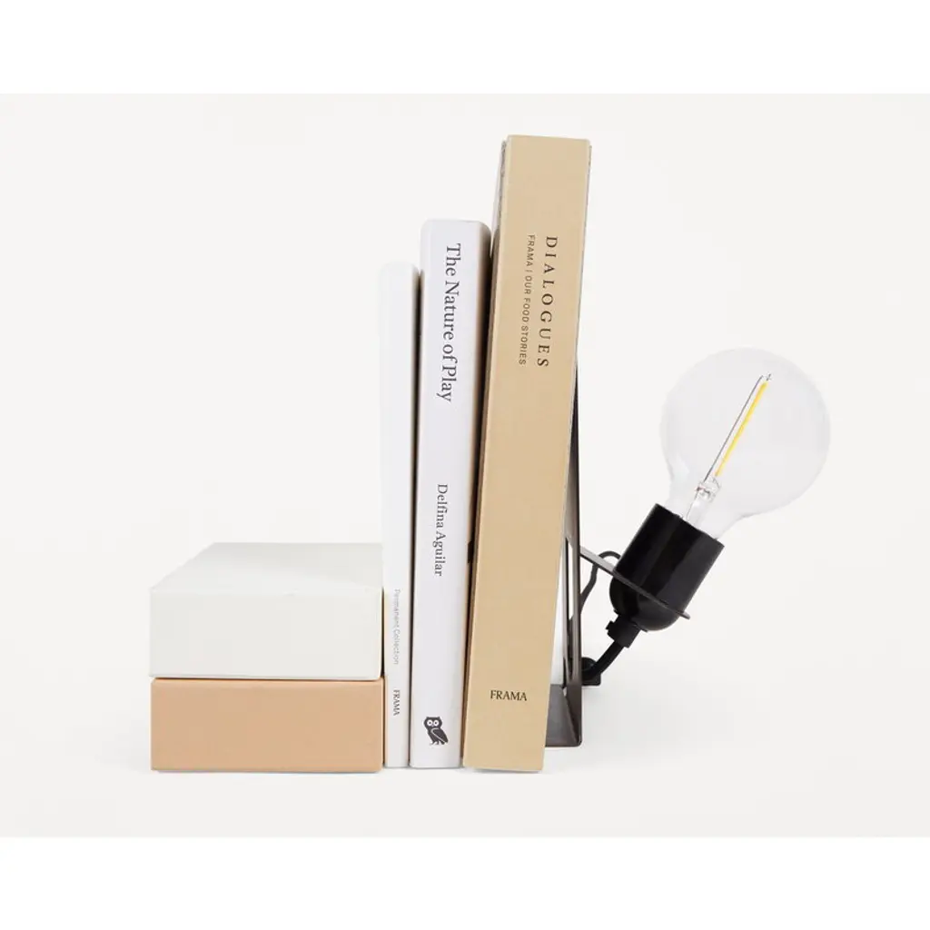 Frama’s Library Lamp is a light fixture and a bookend in one. Designed by Swedish architect Andreas Martin-Löf in 2018, the lamp consists of a simple light bulb and an angled metal stand that serves as a support for books in the bookshelf. Over time, the gun metal coated fixture will develop a beautifully unique patina, adding to the fascinating, industrial esthetic of the luminaire. The Library Lamp is extremely uncomplicated in both form and functionality, and it can easily be envisioned not only in the bookshelf but also as a desk or bedside table, holding books that you are currently reading.