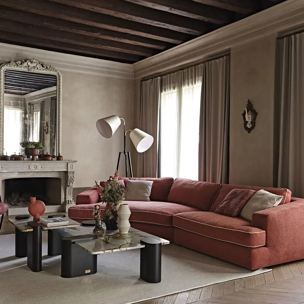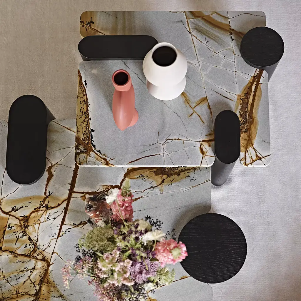 Illusory weightlessness is the fascinating key feature of this stunning low table from the Amoris series. An intriguing interlocking design makes this illusion possible, enhancing the piece's sculptural flair. Held together by a dynamic and bold moka-stained ash tripod base, the Blue Roma Quartzite top here seduces with its golden veins. Please contact the Concierge for different options.