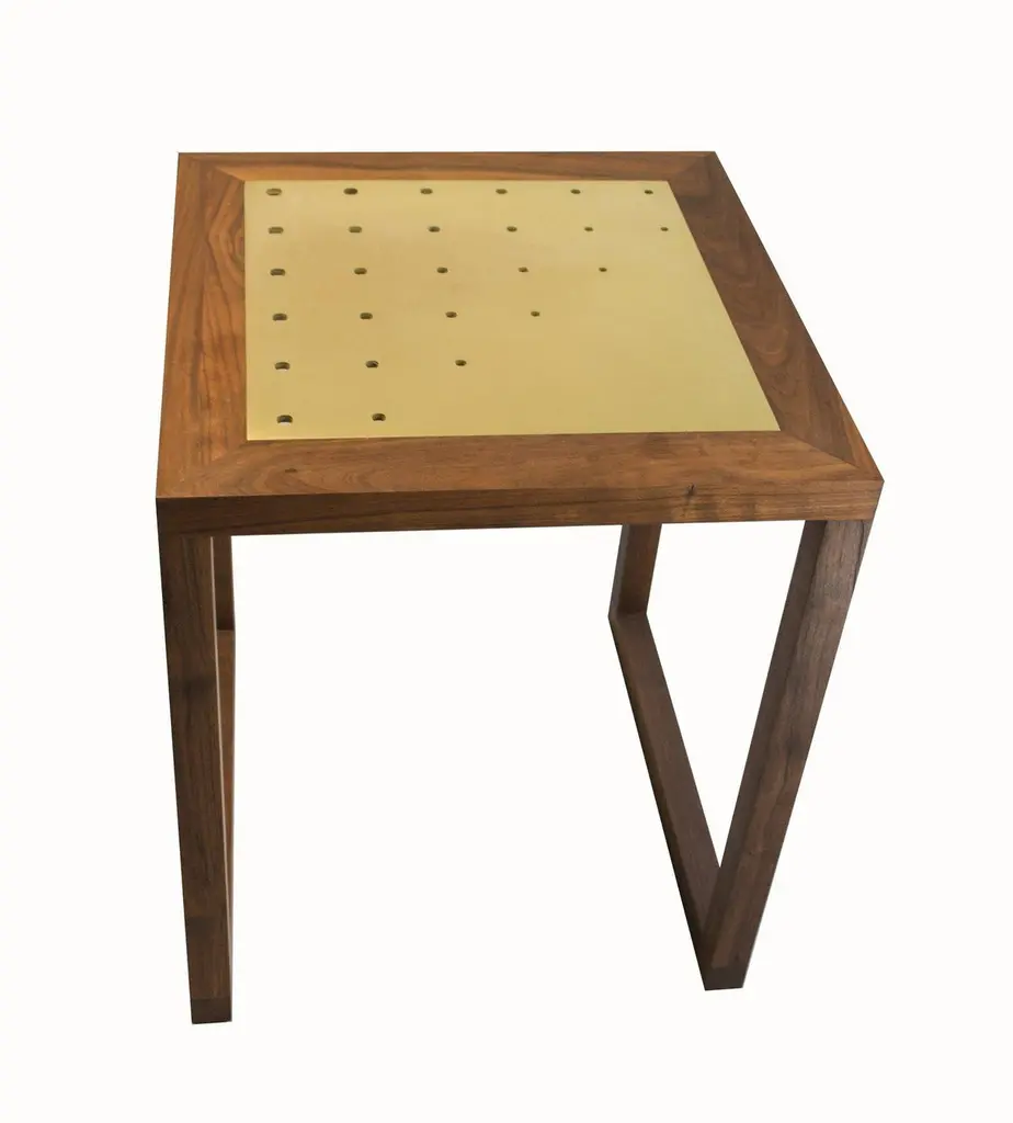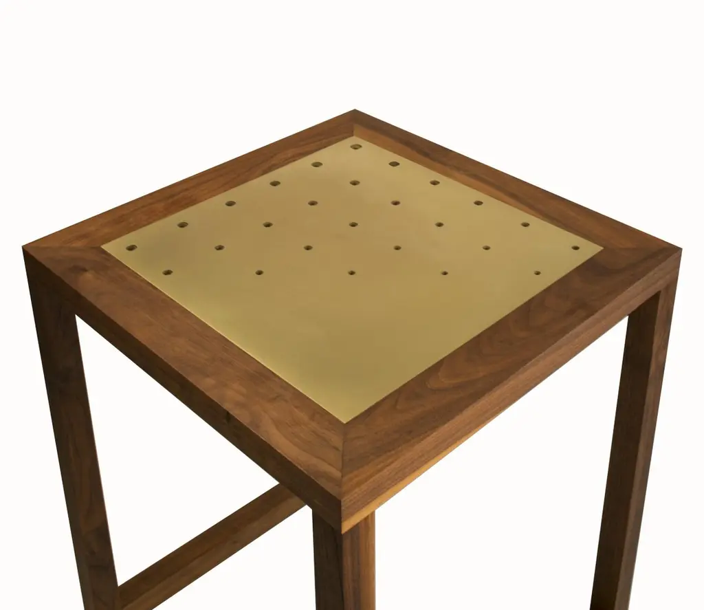 The Amplitude end table features a solid walnut frame inlaid with a brass panel. The clean geometric lines and gradating hole pattern produce a simple yet dynamic form, well suited to highlight the natural beauty of the materials. Please see the Amplitude end table in patinated copper for an alternative metal option.KLN Studio designs and makes each piece by hand in their Brooklyn workshop. All pieces are made to order with the utmost care, ensuring heirloom quality ready for generations of future use and enjoyment. Don't hesitate to reach out about custom sizes, finishes or wood species. Custom projects are also encouraged.