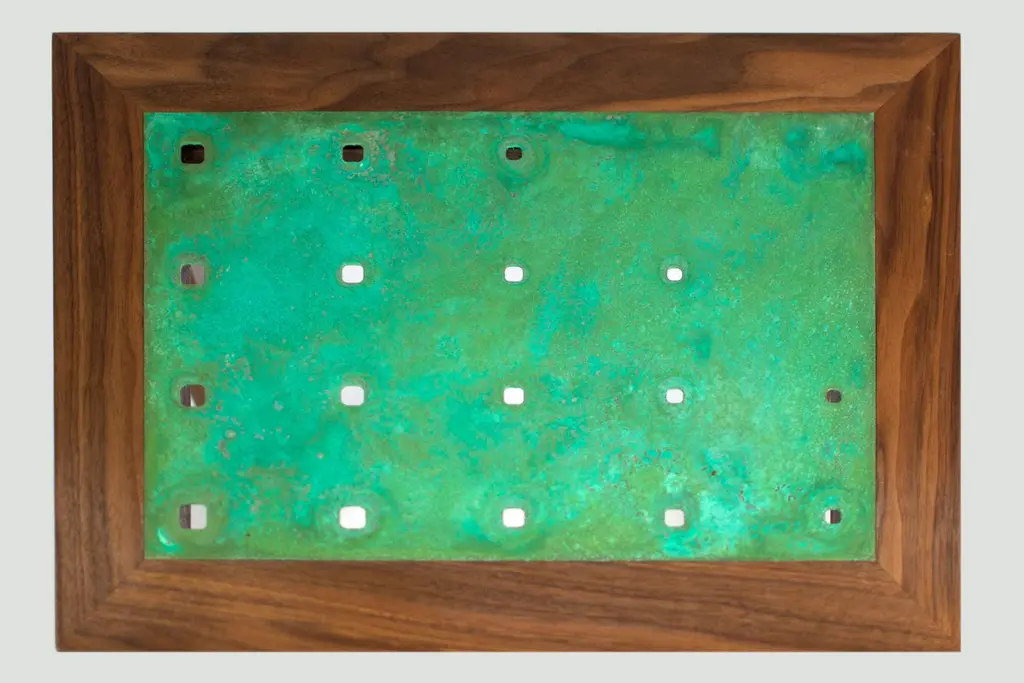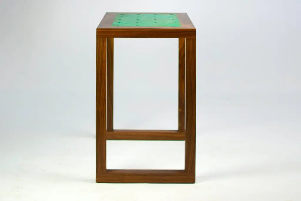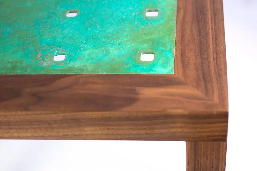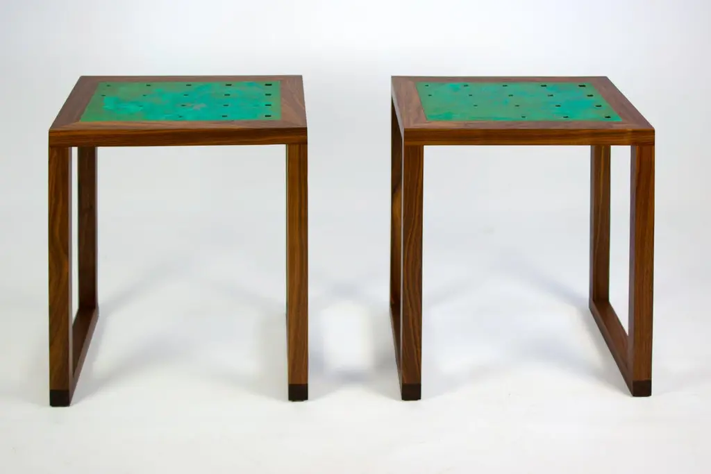 The Amplitude end table features a solid walnut frame inlaid with a patinated copper panel. The clean geometric lines and gradating hole pattern produce a simple yet dynamic form, well suited to highlight the natural beauty of the materials. Please see the Amplitude end table in brass for an alternative metal option.KLN Studio designs and makes each piece by hand in their Brooklyn workshop. All pieces are made to order with the utmost care, ensuring heirloom quality ready for generations of future use and enjoyment. Don't hesitate to reach out about custom sizes, finishes or wood species. Custom projects are also encouraged.