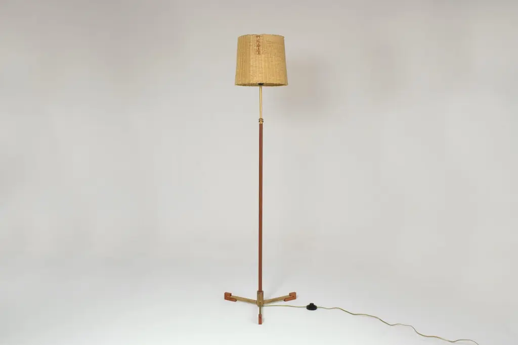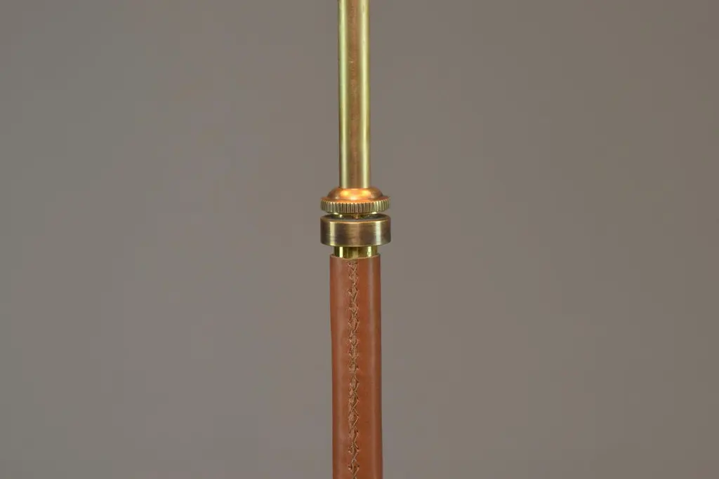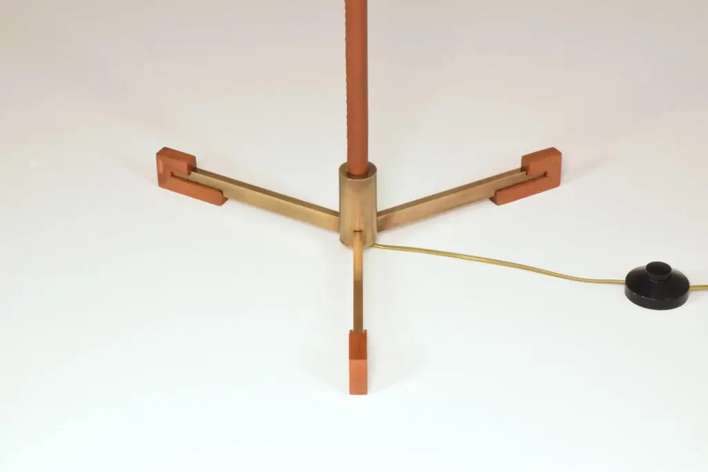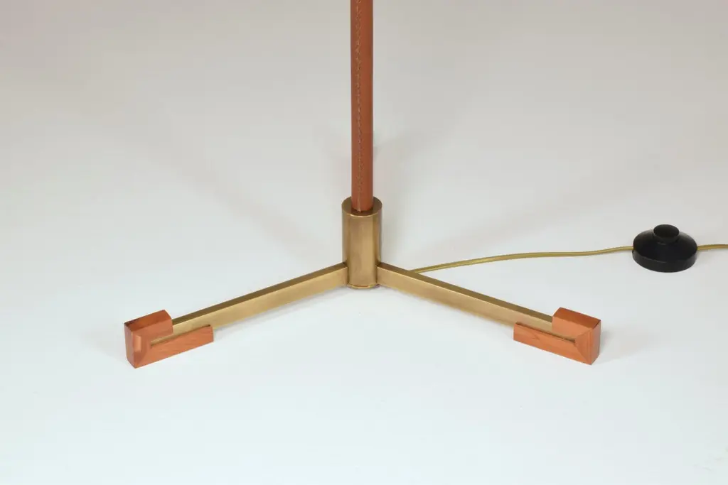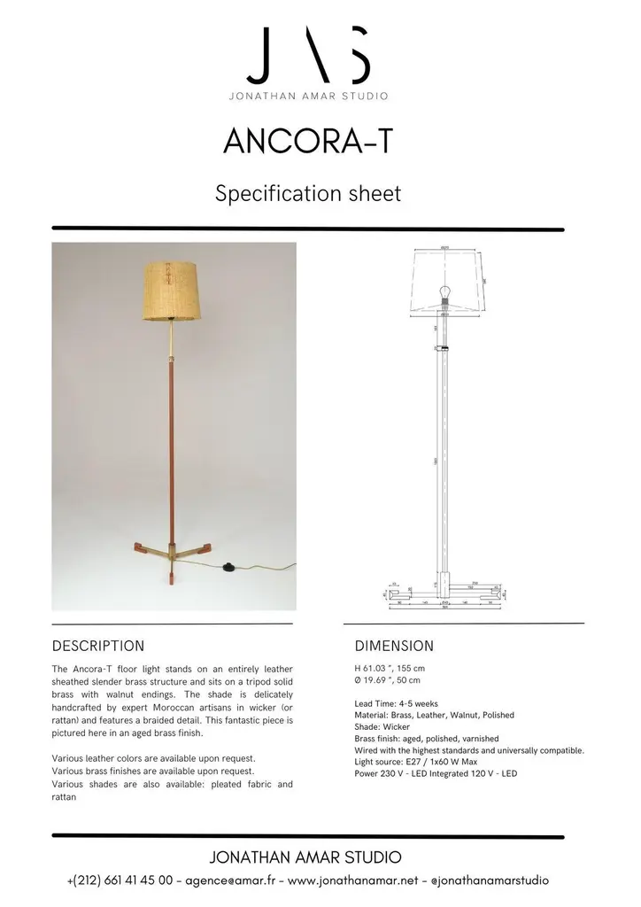 The Ancora floor light stands on an entirely leather sheathed slender brass structure and sits on a tripod solid brass with walnut endings. The shade is delicately handcrafted by expert Moroccan artisans in wicker (or rattan) and features a braided detail. This fantastic piece is pictured here in an aged brass finish. Various leather colors are available upon request (see picture for detail). Various brass finishes are available upon request (see picture for detail).Various shades are also available: openwork brass oriental (F10) or modern (F1M) patterns, pleated fabric, rattanFlow is an ode to movement designed by Jonathan Amar Studio is composed of artisanal articulating lamps and side tables following three years of research and development between his office in Paris and his atelier in Rabat and Leiria. It represents 35 years of passion and know-how in the fields of decorative arts and interior design. -----We are an exhibition space and an online destination established by the passionate art director behind Jonathan Amar Studio. Our gallery presents a harmonious mix of iconic and engaging 20th century pieces and bespoke contemporary lighting. With a strong focus on Italian mid-century designs, his success strives from sourcing designs with striking shapes, creative techniques and interesting materials that cross the concept of time in the same way a Spirit does.?Our 350 square meter workspace includes a luminous gallery, a restoration atelier where our expert artisans in metalwork, woodwork, upholstery, and electrics; restore each piece with the mission to honor a balance between restoration and preservation. There may be light age-related wear but no hard damages or structural issues.?Since the launch of our gallery in late 2017, we have exported over 1200 items to buyers in 21 countries located in all four corners of the world from Europe and North America to Asia and Australia. In the United-States alone, we have ensured the delivery of over 150 pieces of all sizes (from massive dining tables to small decorative objects) in 23 states. We take the utmost attention to our packaging by building robust made to measure boxes in our atelier with the aim of providing safe and cost-effective delivery prices for every client. Most deliveries arrive smoothly in less than 8 days. We are located both in Paris and Rabat. FYI the Morocco Free Trade Agreement (MAFTA) went into effect on January 1, 2006. Under the agreement, most Moroccan goods enter the United States duty-free.?Contact us for more information