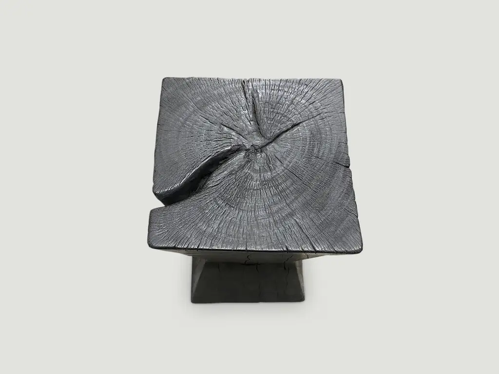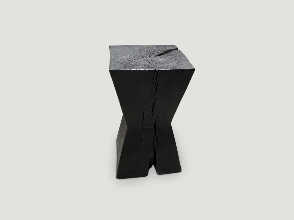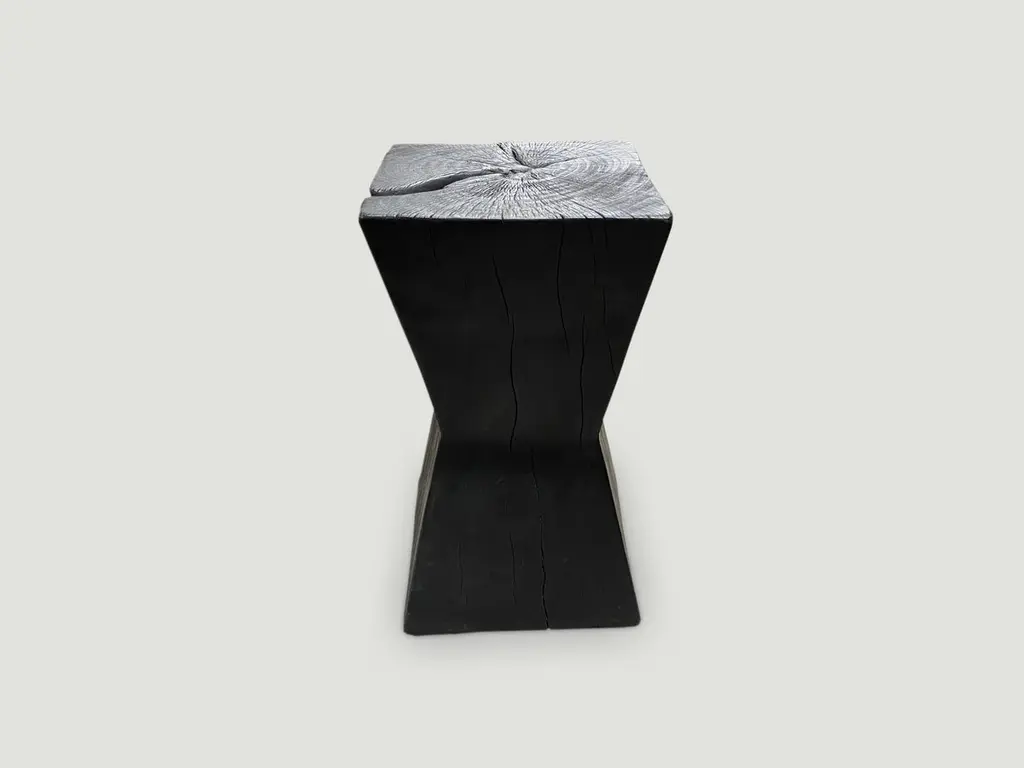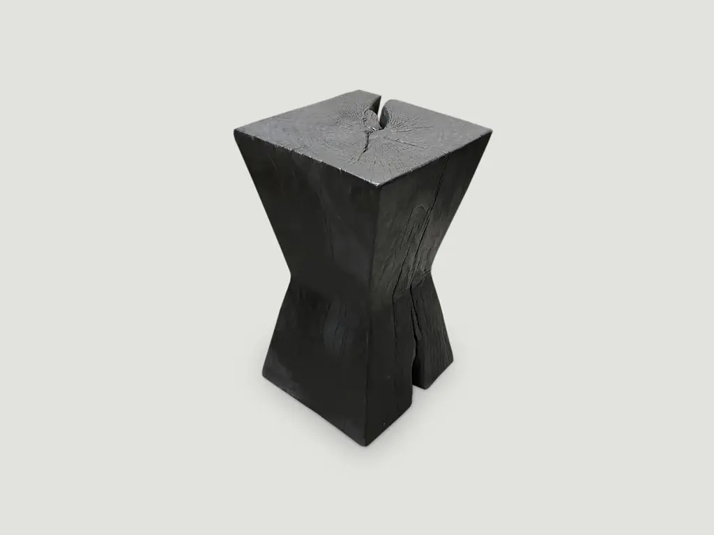 Reclaimed hourglass shaped tamarind wood side table. Hand carved whilst respecting the natural organic wood. Burnt, sanded and sealed. We have a collection. The price and size reflect the one shown. The Triple Burnt Collection represents a unique line of modern furniture made from solid reclaimed wood. Burnt three times to produce a rich, charcoal finish with impressive depth-a result unachievable using standard stains and finishes. A perfect combination of modern and organic.Andrianna Shamaris. The Leader In Modern Organic Design.