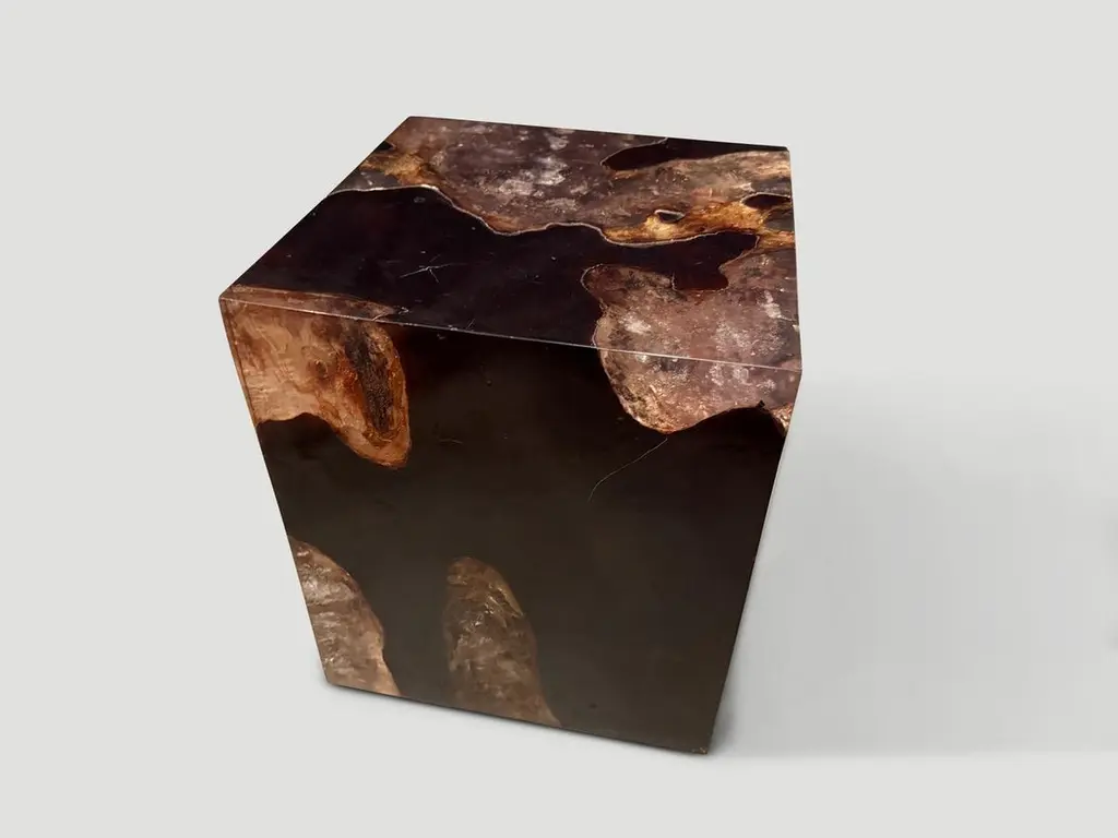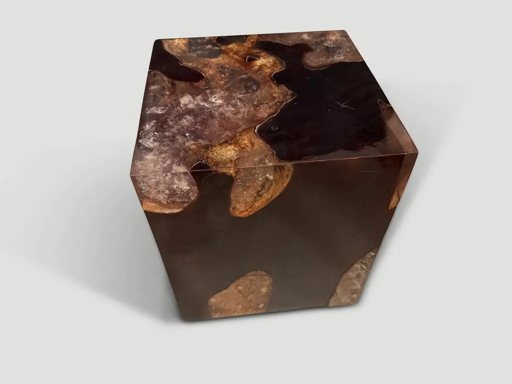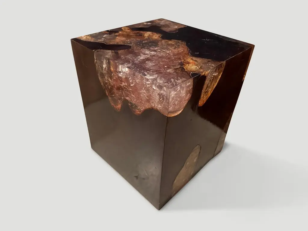 The Cracked Resin side table is made from teak infused with resin. A dramatic piece due to the depth of the resin, which resembles a unique quartz crystal with many different facets. An impressive addition to any space.The Cracked Resin Collection is a revolutionary line of modern coffee tables, side tables and dining tables made from organic teak and resin. The natural grooves of the reclaimed teak are infused with resin that is cracked to achieve a unique quartz crystal effect. Original design pioneered by Andrianna Shamaris. A perfect combination of modern and organic.Own an Andrianna Shamaris original.Andrianna Shamaris. The Leader In Modern Organic Design.