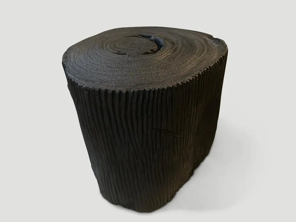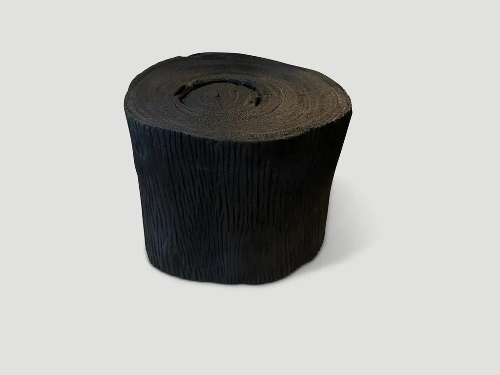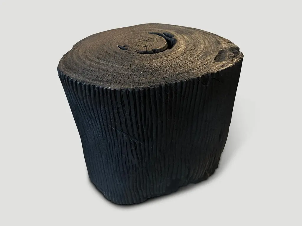 Impressive large reclaimed ulin wood side table or stool. Also known as Iron wood. Charred sanded and sealed revealing the beautiful unique wood grain. The Triple Burnt Collection represents a unique line of modern furniture made from solid organic wood. Burnt three times to produce a rich, charcoal finish with impressive depth-a result unachievable using standard stains and finishes. A perfect combination of modern and organic.Own an Andrianna Shamaris original.Andrianna Shamaris. The Leader in Modern Organic Design.