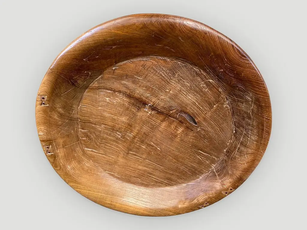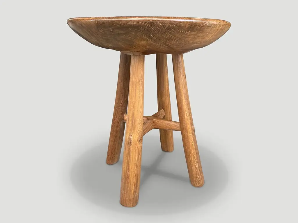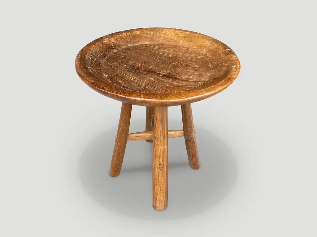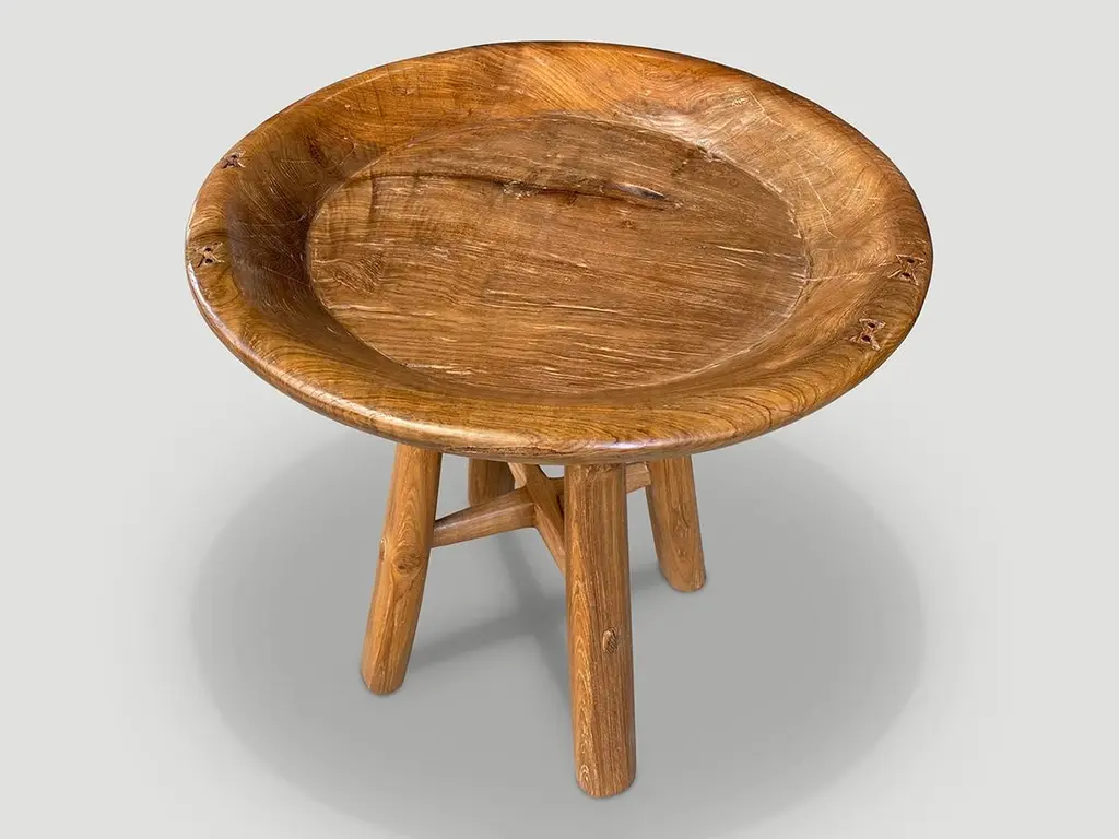 Introducing the midcentury couture collection. Furniture constructed by hand from start to finish. A beautiful antique four inch deep bowl from Sumatra, is finished by hand with a natural oil revealing the stunning wood grain. We added midcentury style rounded teak legs for an impressive side table. Tiny wood butterfly inlays were added to the rim with an iron wood pin in the center. It’s all in the details.Own an Andrianna Shamaris original.Andrianna Shamaris. The Leader In Modern Organic Design.