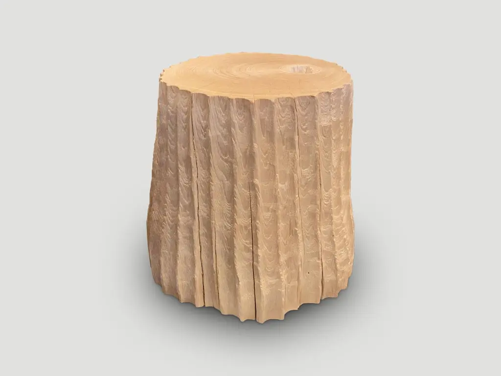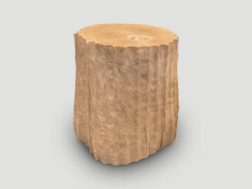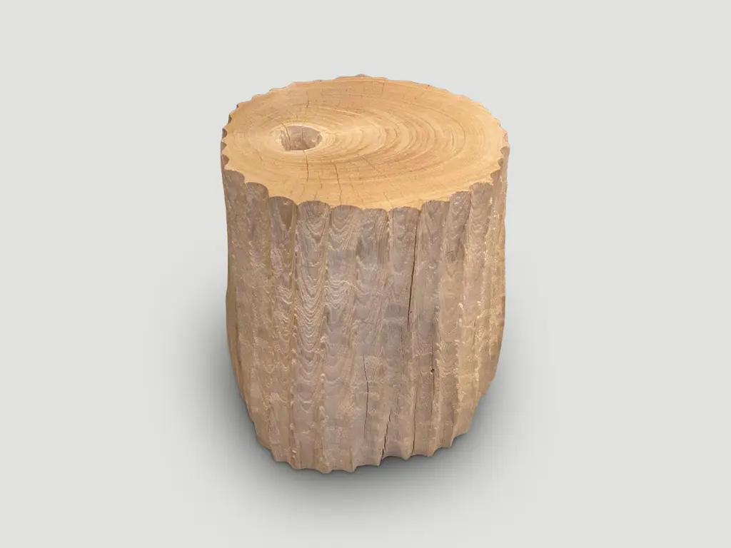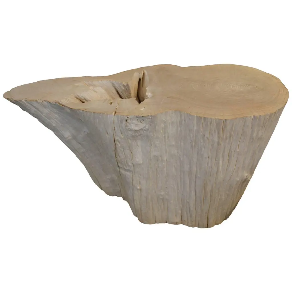 Beautiful hand carved minimalist bleached teak wood side table. The bottom extends to 14” diameter whilst the top is 11” diameter. We have a collection. The price reflects the one shown. Also available charred.The St. Barts Collection features an exciting collection of organic white wash, bleached and natural weathered teak furniture. The reclaimed teak is bleached and left to bake in the sun and sea salt air for over a year to achieve this unique finish. Select pieces are infused with a brilliant aqua or soft blue resin that is cracked to achieve a unique quartz crystal effect. The final result evokes imagery of the white sand beaches and brilliant aqua waters of the famous French Caribbean Island.Own an Andrianna Shamaris original.Andrianna Shamaris. The Leader In Modern Organic Design.