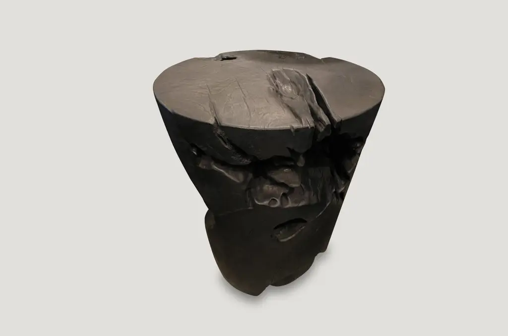 Hand carved solid reclaimed teak wood side table with a graduation from the bottom to the top. Burnt, sanded and sealed whilst respecting the natural organic wood. We have a collection. All unique. The price represents the one shown. Custom sizes and stains available.The Triple Burnt collection represents a unique line of modern furniture made from solid reclaimed wood. Burnt three times to produce a rich, charcoal finish with impressive depth-a result unachievable using standard stains and finishes. A perfect combination of modern and organic.Andrianna Shamaris. The Leader In Modern Organic Design.