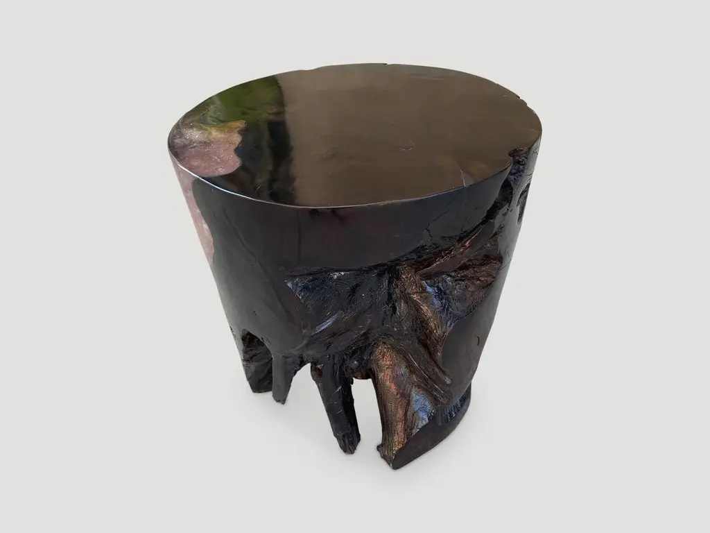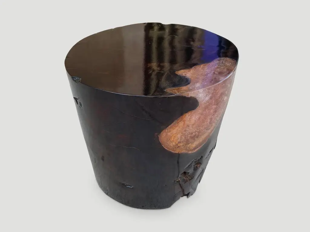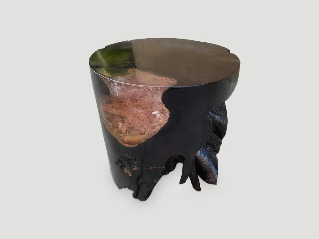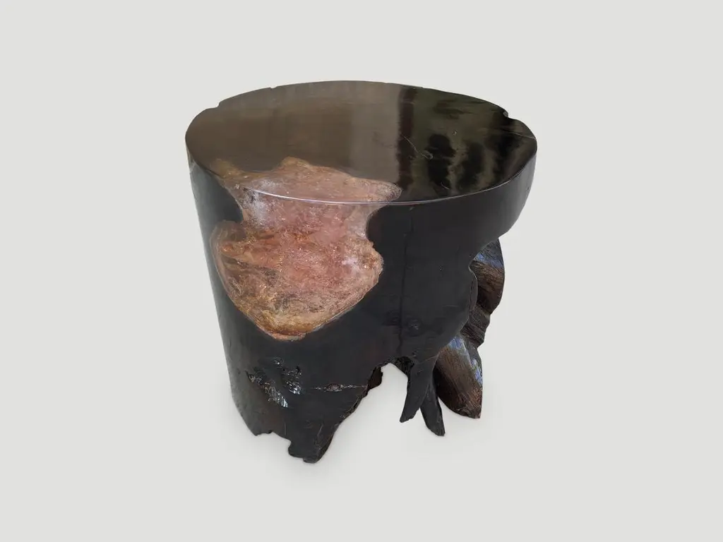 The organic round cracked resin side table is made from teak infused with resin which resembles a unique quartz crystal. We stained the teak wood espresso and added a high polish. An impressive addition to any space.The Cracked Resin Collection is a revolutionary line of modern coffee tables, side tables and dining tables made from organic teak and resin. The natural grooves of the reclaimed teak are infused with resin that is cracked to achieve a unique quartz crystal effect. Original design pioneered by Andrianna Shamaris. A perfect combination of modern and organic.Own an Andrianna Shamaris original.Andrianna Shamaris. The Leader In Modern Organic Design.