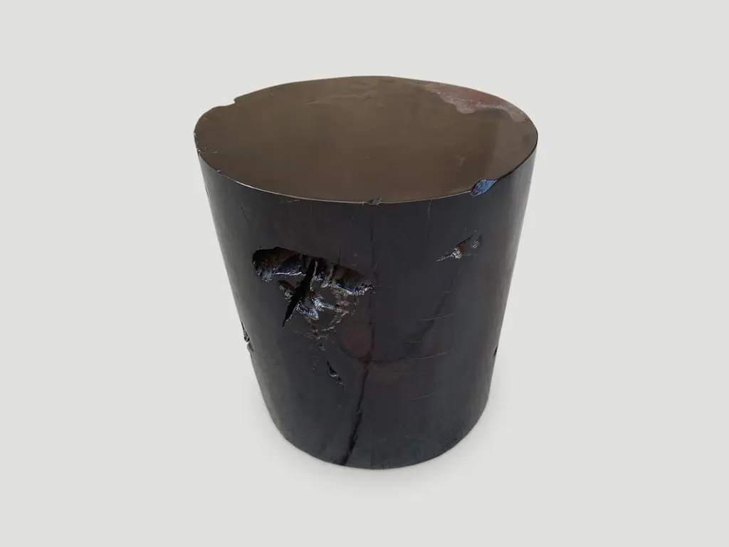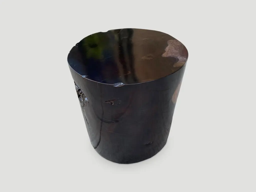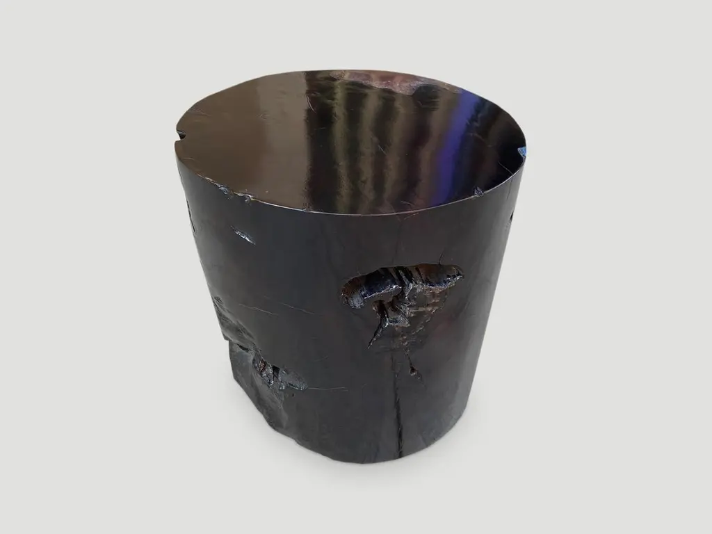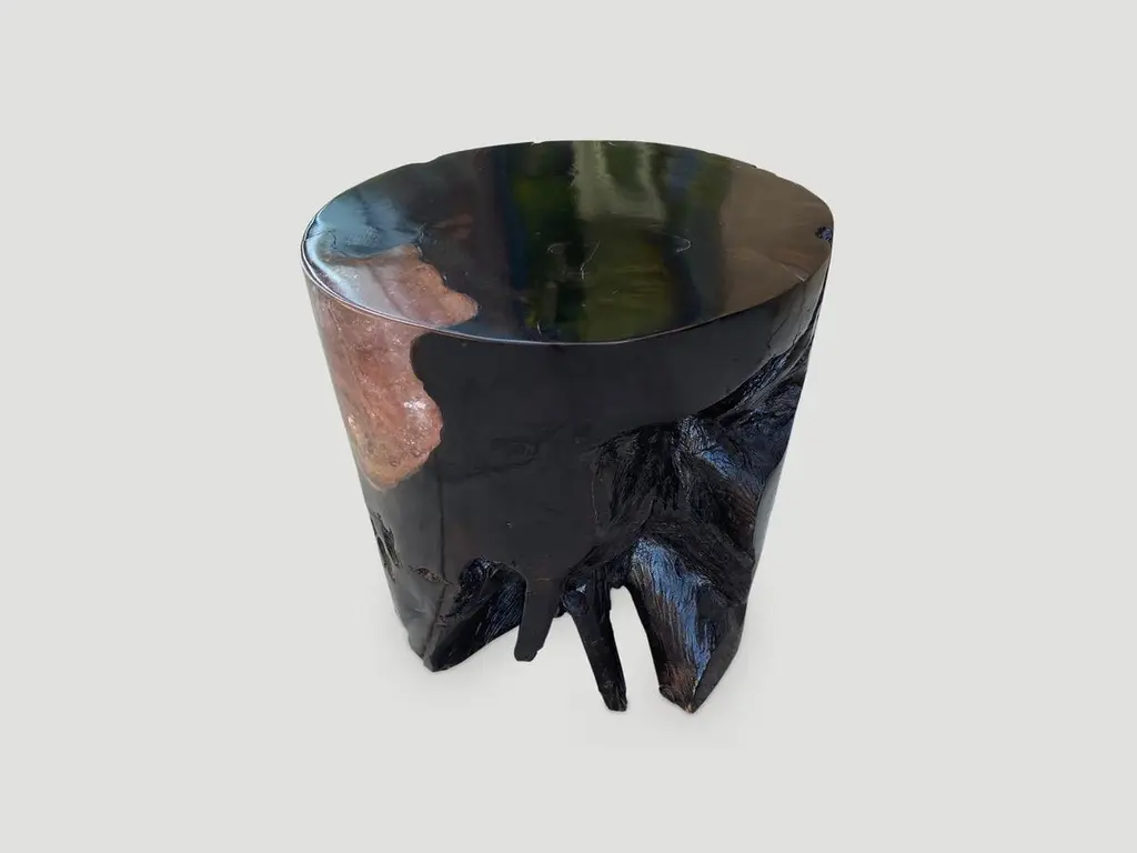 The organic round cracked resin side table is made from teak infused with resin which resembles a unique quartz crystal. We stained the teak wood espresso and added a high polish. An impressive addition to any space.The Cracked Resin Collection is a revolutionary line of modern coffee tables, side tables and dining tables made from organic teak and resin. The natural grooves of the reclaimed teak are infused with resin that is cracked to achieve a unique quartz crystal effect. Original design pioneered by Andrianna Shamaris. A perfect combination of modern and organic.Own an Andrianna Shamaris original.Andrianna Shamaris. The Leader In Modern Organic Design.