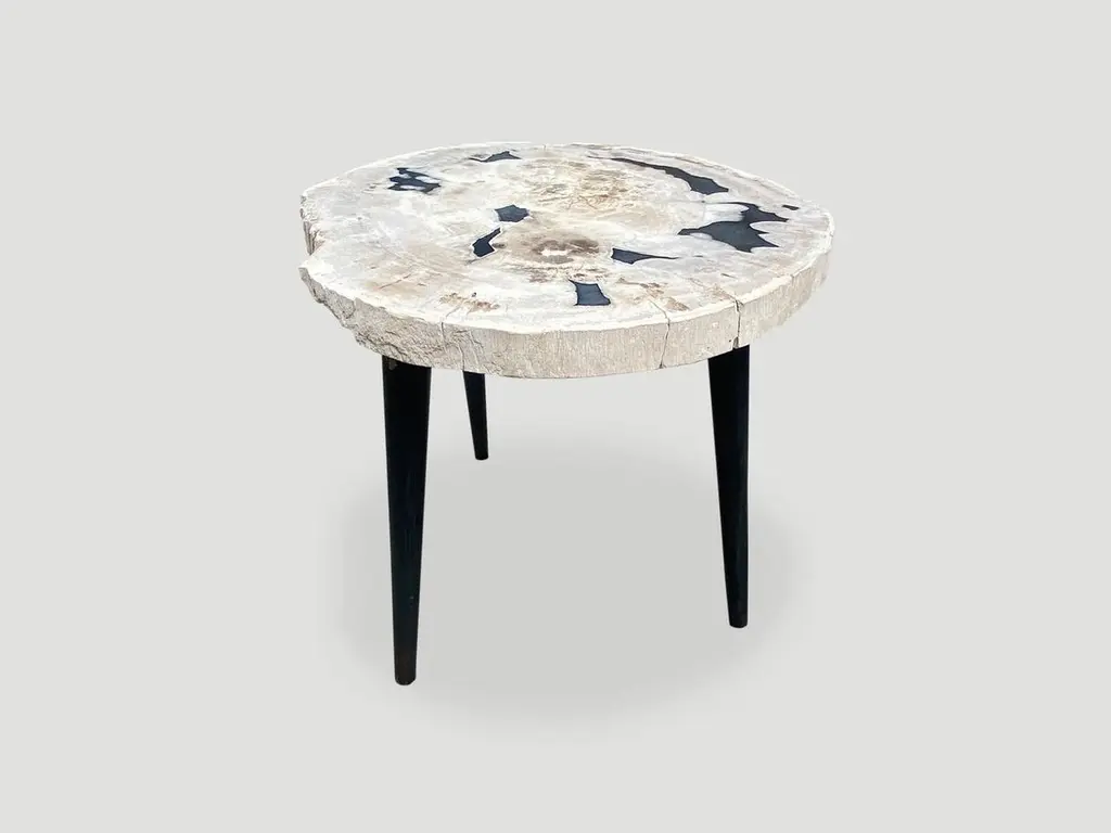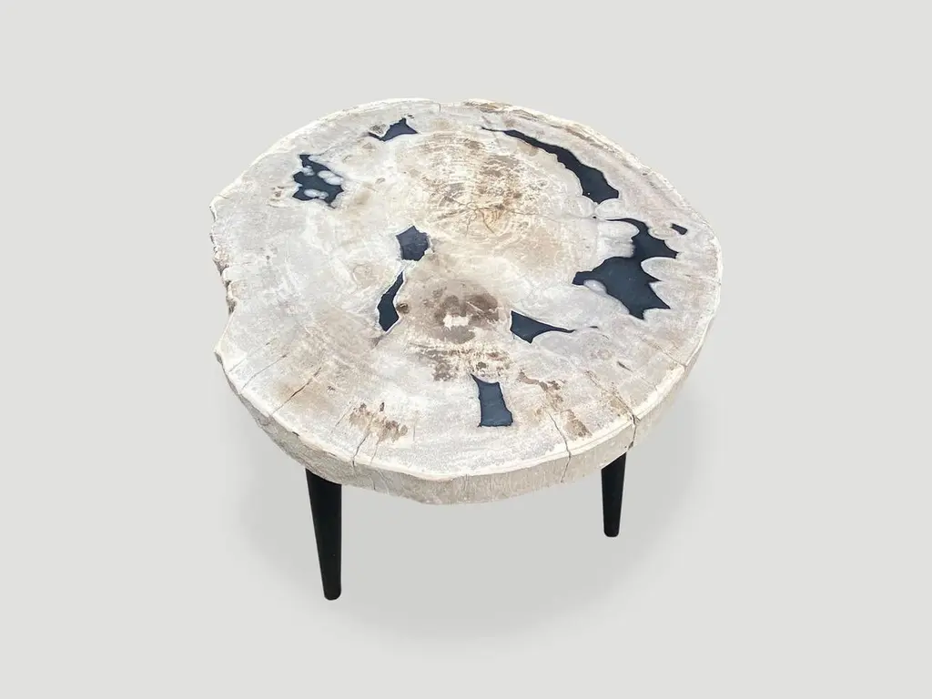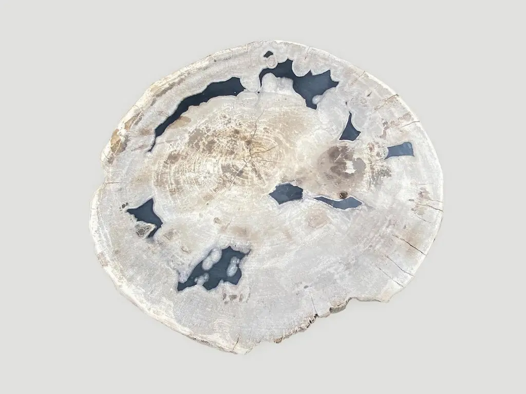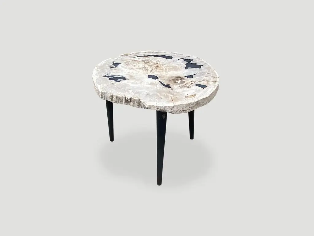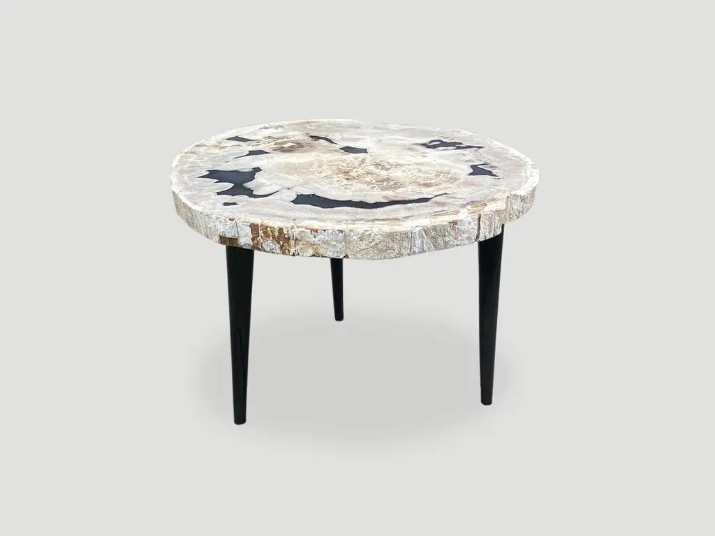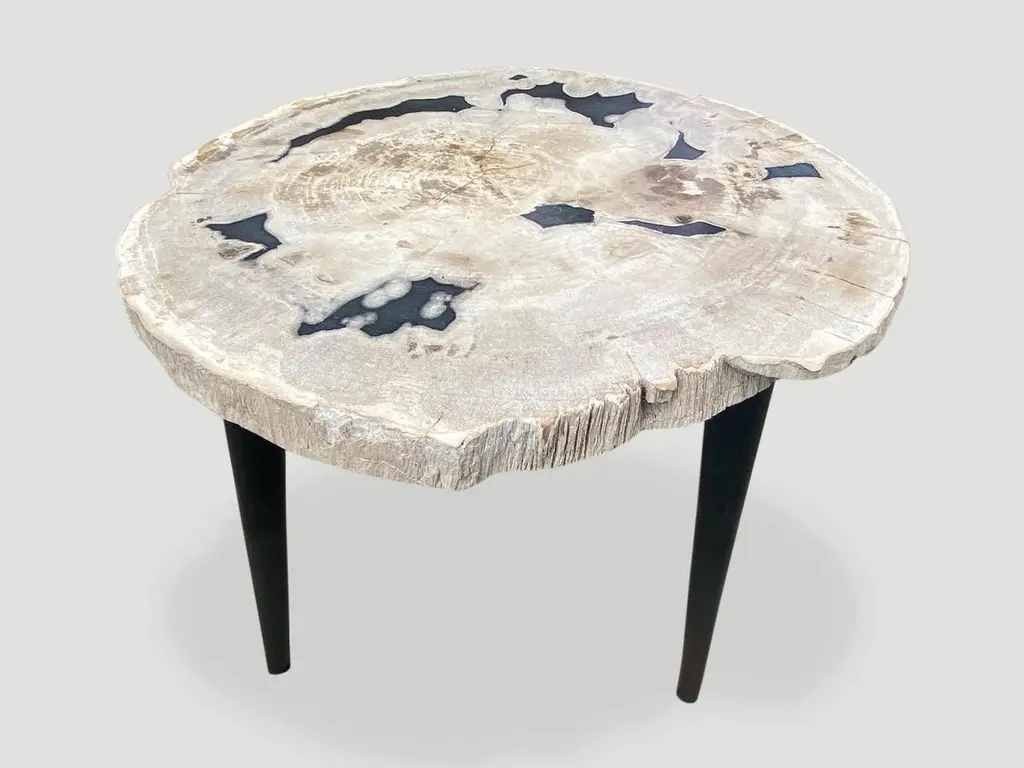 Beautiful petrified wood slab with contrasting colors set on a metal base. As with a diamond, we polish the highest quality fossilized petrified wood, using our latest ground breaking technology, to reveal its natural beauty and contrasting tones. It is then transformed into a unique piece of furniture, unlike any other petrified wood you might find.We source the highest quality petrified wood available. Over 40 million years old. Each piece is hand selected and highly polished with minimal cracks. Petrified wood is extremely versatile, even great inside a bathroom shower. Perfect as a cocktail table, side table or clustered as a coffee table. We can also custom large slabs for counter tops, dining tables or coffee tables.We have an ever-evolving collection of High Quality Petrified Wood. We only select the best.Own an Andrianna Shamaris Original.Andrianna Shamaris. The Leader In Modern Organic Design.