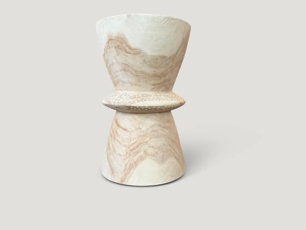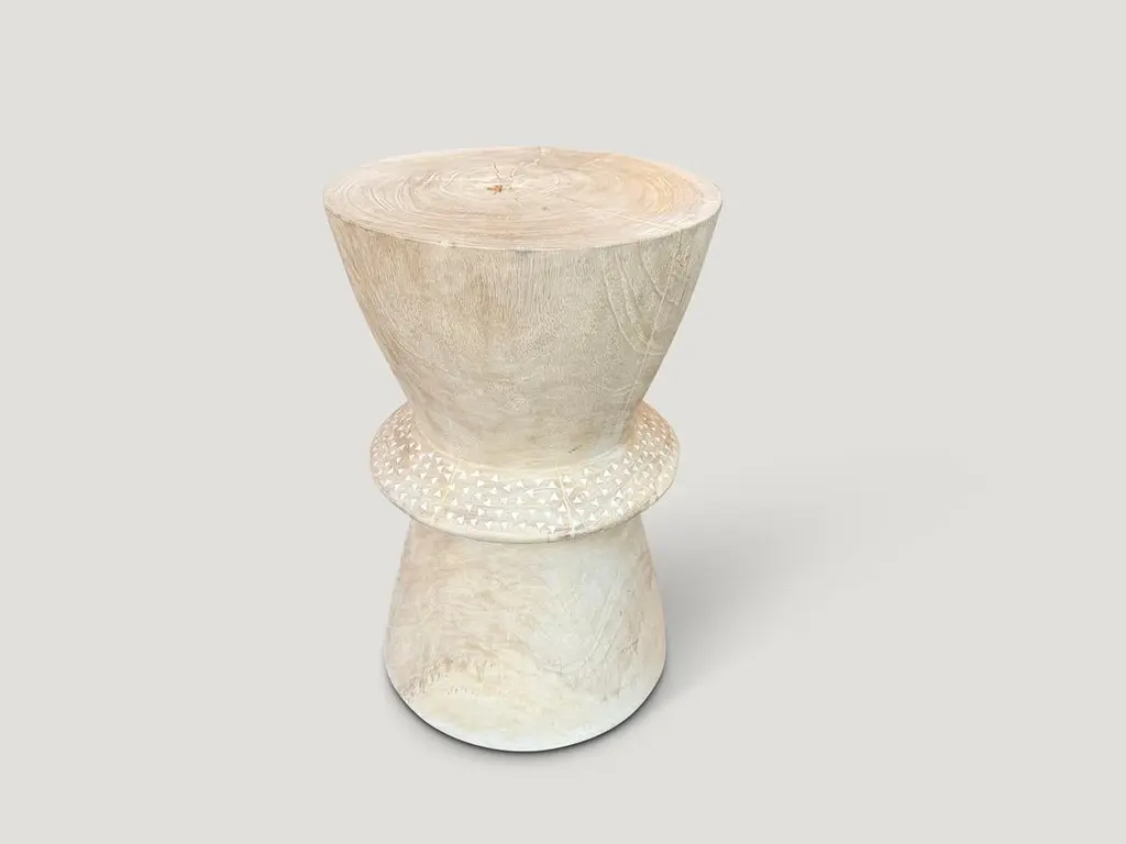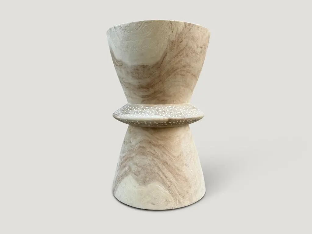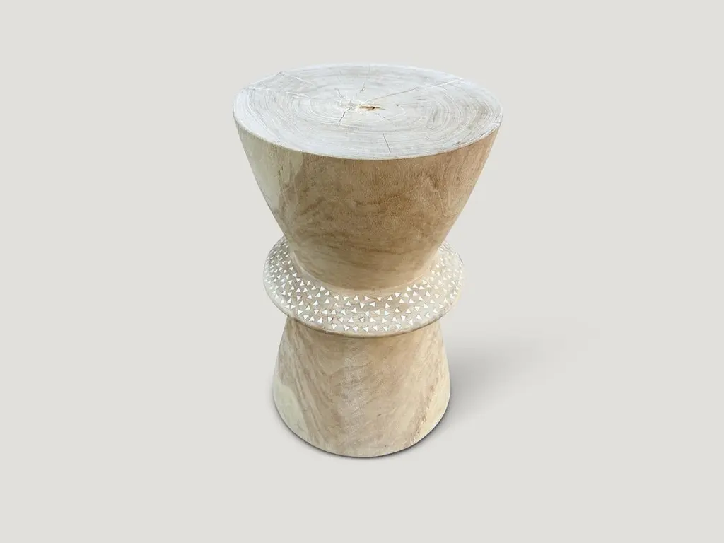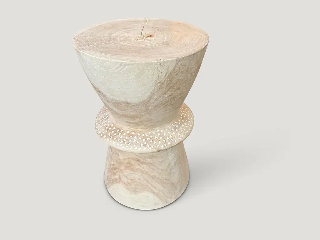 Beautiful hand carved teak wood side table with added shell inlay to the center section. First bleached and finished with a light white wash revealing the unique contrasting wood grain. It’s all in the details. Custom stains available. Please inquire.Own an Andrianna Shamaris OriginalAndrianna Shamaris. The Leader In Modern Organic Design.
