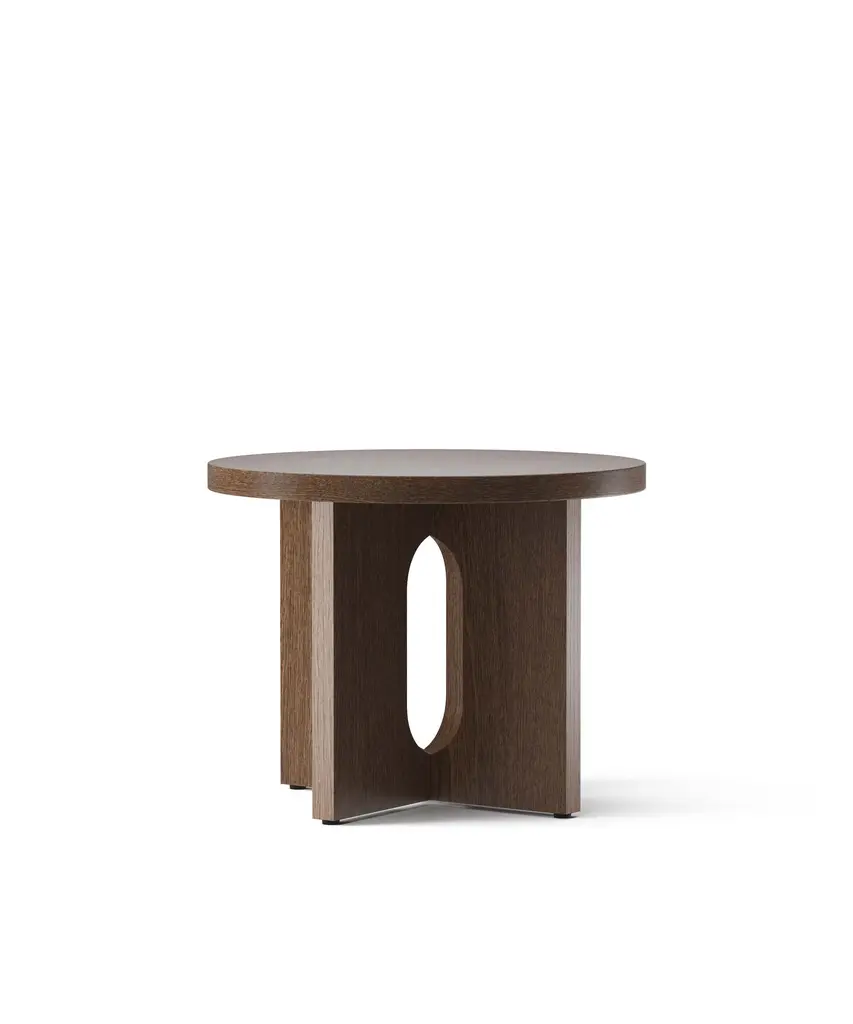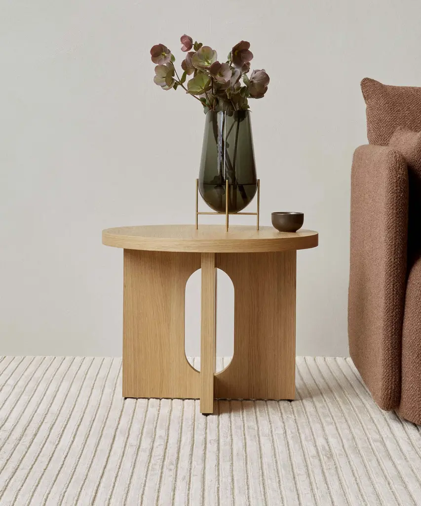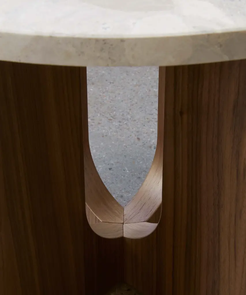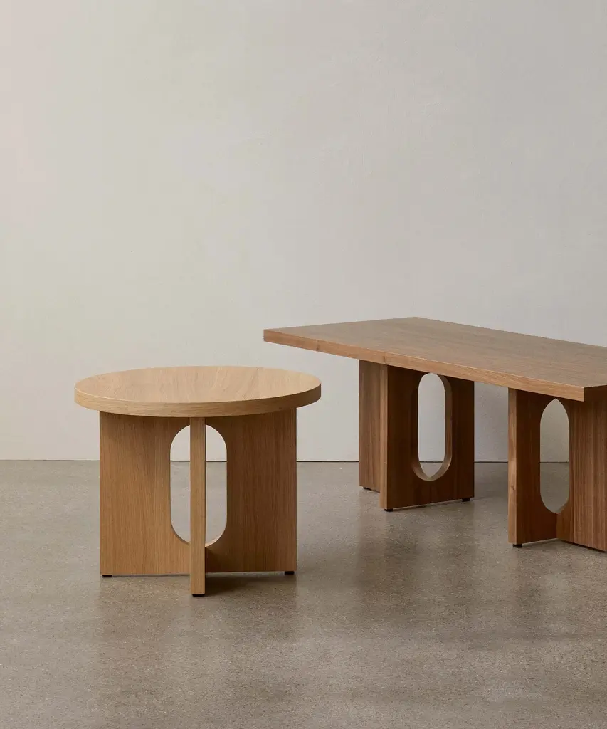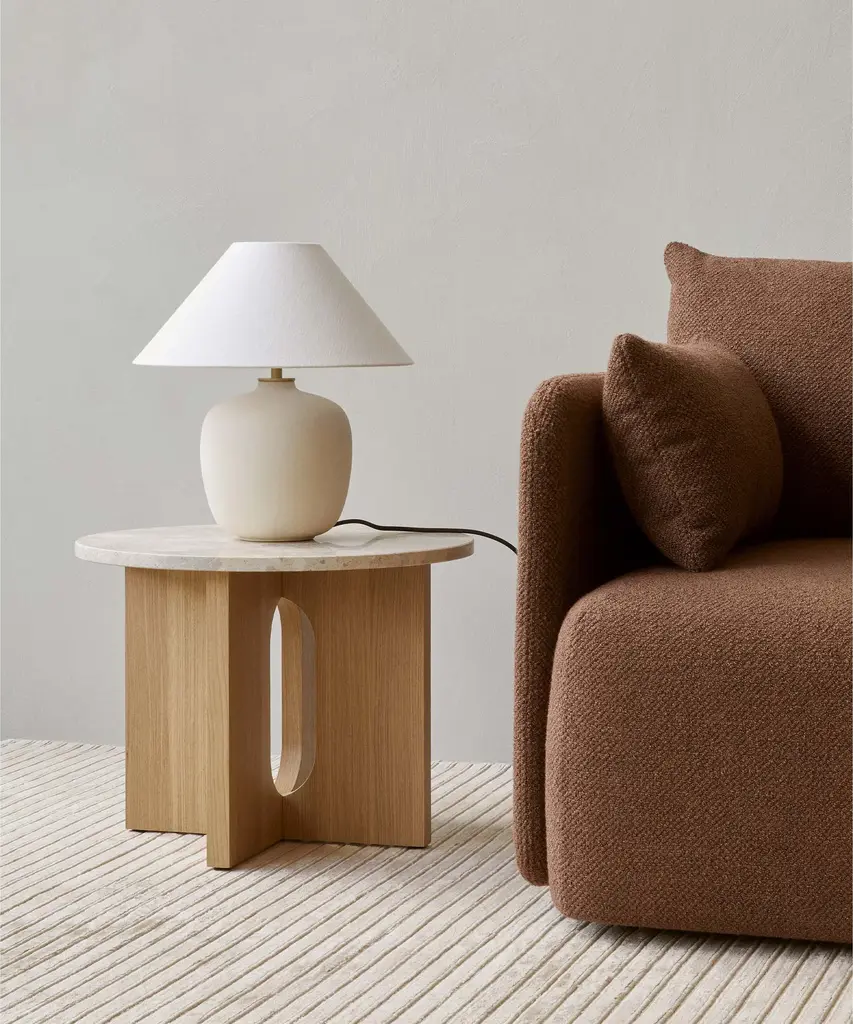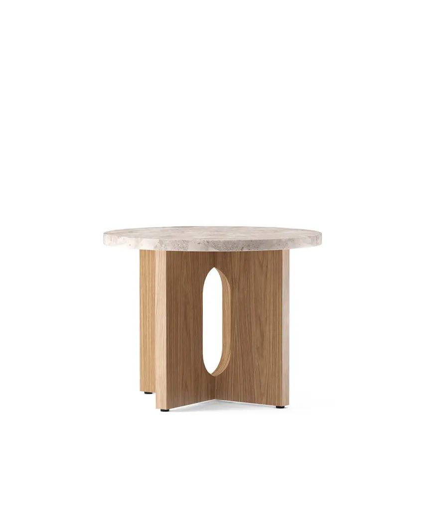 A beautiful and practical furniture design that makes clever use of craftsmanship and tactile materials, the simple silhouette of the Androgyne Side Table is characterised by opposites. The pure use of materials contrasts with a refined silhouette of solid and soft lines, living up to its name thanks to its combination of masculine and feminine characteristics. The pairing of rich oak – with a natural or dark stained finish – walnut and Kunis Breccia stone creates a distinctive designcustomisable to any and every interior style.Designed by Danielle Siggerud for Danish design company, Audo Copenhagen.